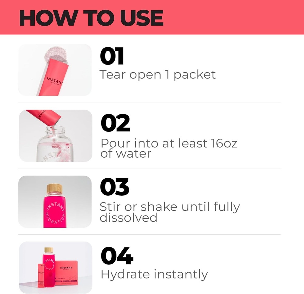 Instant Hydration Electrolytes Powder Packets - Raspberry Electrolyte Drink Mix - Zero Sugar - Keto, Vegan, Gluten-Free, Non-GMO - Boost Recovery, Brain Health, Muscle & Tissue Support- 30 Sticks Description Features: RASPBERRY FLAVOR: Enjoy the vibrant, tangy taste of freshly picked raspberries with every sip. This flavor embodies the essence of a refreshing summer treat – bold, natural, and the perfect hint of sweetness. It's hydration made easy, invigorating you without any artificial ingredients, sugar, or extra calories. Unmatched 1445mg electrolytes per serving for superior hydration and peak performance, far surpassing other brands. Our blend supports optimal cellular hydration, muscle function, and recovery. Perfect for health-conscious individuals and those with specific dietary needs. Supports muscle recovery and reduces fatigue with a potent and balanced mix of sodium, potassium, calcium, and magnesium. Our formula helps you recover and build stronger muscles post-workout. Hand-harvested French Grey salt provides a rich source of 83 trace minerals, enhancing hydration at the cellular level. Our proprietary blend is scientifically backed and lab-tested for safety and efficacy. MORE SALT, MORE SUPPORT: Studies show that high-functioning bodies need higher levels of salt intake. The more you sweat the more you need SALT! This is why we formulated our perfect all-in-one electrolyte drink with sel gris known for its complex, mineral-rich flavor. Product Details: Product Dimensions : 4.17 x 3.35 x 2.83 inches; 7.8 ounces Manufacturer : Instant Hydration Brand: Instant Hydration Flavor: Raspberry Primary Supplement Type: Magnesium Unit Count: 7.9 Ounce Item Form: Powder Item Weight: 7.8 Ounces Item dimensions L x W x H: 4.17 x 3.35 x 2.83 inches Product Benefits: Protects The Ocean, Muscle Recovery, Energy Management, Cellular Hydration Age Range (Description): Adult Number of Items: 1 Handling We will ship all orders within 1 business day of payment. Delivery We Do Not Ship Outside of the Continental US. Return Policy All items qualify for returns within 30 days of receipt. Buyer is responsible for return shipping on any item that is not damaged. Feedback We take our reputation seriously, we buy and sell online, so we understand the value of trust. If you are unsatisfied with your order, please contact us and we will work with you to resolve it to your satisfaction.