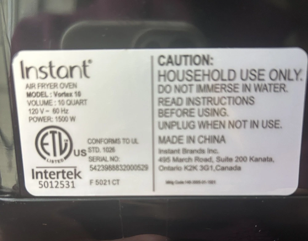 Item Weight: 15 lbs Color: Black Power: 1500 W Brand: Instant Pot Item Height: 12 in Item Width: 13 in Country of Origin: China Type: Air Fryer Model: Vortex 10 Capacity: 10 qt Oil Capacity: O Voltage: 120 V