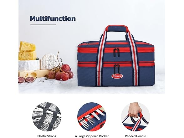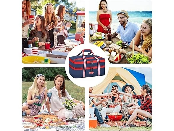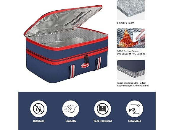 Maelstrom Insulated Casserole Carrier For Hot or Cold Food,Expandable Lasagna Lugger Tote,Collapsible Leakproof Large Food Buds,Blue Condition: New Features This is a collapsible and expandable double-layer casserole carriers for hot or cold food. Food-grade double-sided, high-strength aluminum foil that is odorless, smooth, tear-resistant, and cleanable. The double-layer design effectively separates hot and cold food, maintain good insulation to keep hot food warm and cold food cool.the entire maelstrom expandable lasagna lugger is filled with 6mm of epe foam( accurately measured), which is ultra-soft, safe, and insulates extremely well. Exterior surfaces of the lasagna lugger tote are made of rip-stop 600d oxford fabric plus one layer of pvc coating to provide long-lasting durability while adding extra insulation. As insulated bags for food transport they are excellent for taking dishes to a friend’s house without reheating, maintaining the best taste of the food. Maelstrom lasagna lugger insulated food containers measures 16.4*10.9*7.8 and fits most 9” X 13”/22.8 x 33 cm casserole and baking dishes. Thank you. MAELSTROM INSULATED FOOD CARRIER - This is a collapsible and expandable double-layer casserole carriers for hot or cold food. Food-grade double-sided, high-strength aluminum foil that is odorless, smooth, tear-resistant, and cleanable. The double-layer design effectively separates hot and cold food, maintain good insulation to keep hot food warm and cold food cool WELL INSULATED & DURABLE - The entire Maelstrom expandable lasagna lugger is filled with 6mm of EPE foam which is ultra-soft, safe, and insulates extremely well. Exterior surfaces of the lasagna lugger tote are made of rip-stop 600D Oxford fabric plus one layer of PVC coating to provide long-lasting durability while adding extra insulation. As insulated bags for food transport they are excellent for taking dishes to a friend’s house without reheating, maintaining the best taste of the food EXPANDABLE & FOLDABLE - Maelstrom Lasagna Lugger insulated food containers measures 16.410.97.8 inch and fits most 9” x 13”/22.8 x 33 cm casserole and baking dishes. The top compartment is easily expanded with a simple zipper action. When fully expanded the height increases by 2.5 inches, Or it can be easily collapses flat to 2 inches to stow in your trunk or under a car seat. It’s a casserole dish carrier that’s convenient for travel MULTIFUNCTION DESIGN - The Maelstrom Lasagna Lugger has elastic straps sewn on the top flap to hold knives, forks, and spoons. For quick and convenient access to get the needed items, simply get zip open the main zipper pocket. A large zippered pocket on the outside is perfect for carrying additional accessories like plates, wine openers, kitchen linens, kitchen utensils MULTI-USE - The reinforced dual-zippers are sturdy and durable with reverse stitching technique to hide zipper teeth and rectangular hardware pull tails that make it easy to open and close. The high-density webbing and a padded tear-resistant handle are thoroughly stitched together, comfortable to carry around whether you’re visiting relatives or friends or going out for a picnic, camping, beach, potluck, or for holiday parties Specs In the Box: (1) Maelstrom Insulated Casserole Carrier For Hot or Cold Food,Expandable Lasagna Lugger Tote,Collapsible Leakproof Large Food Buds,Blue