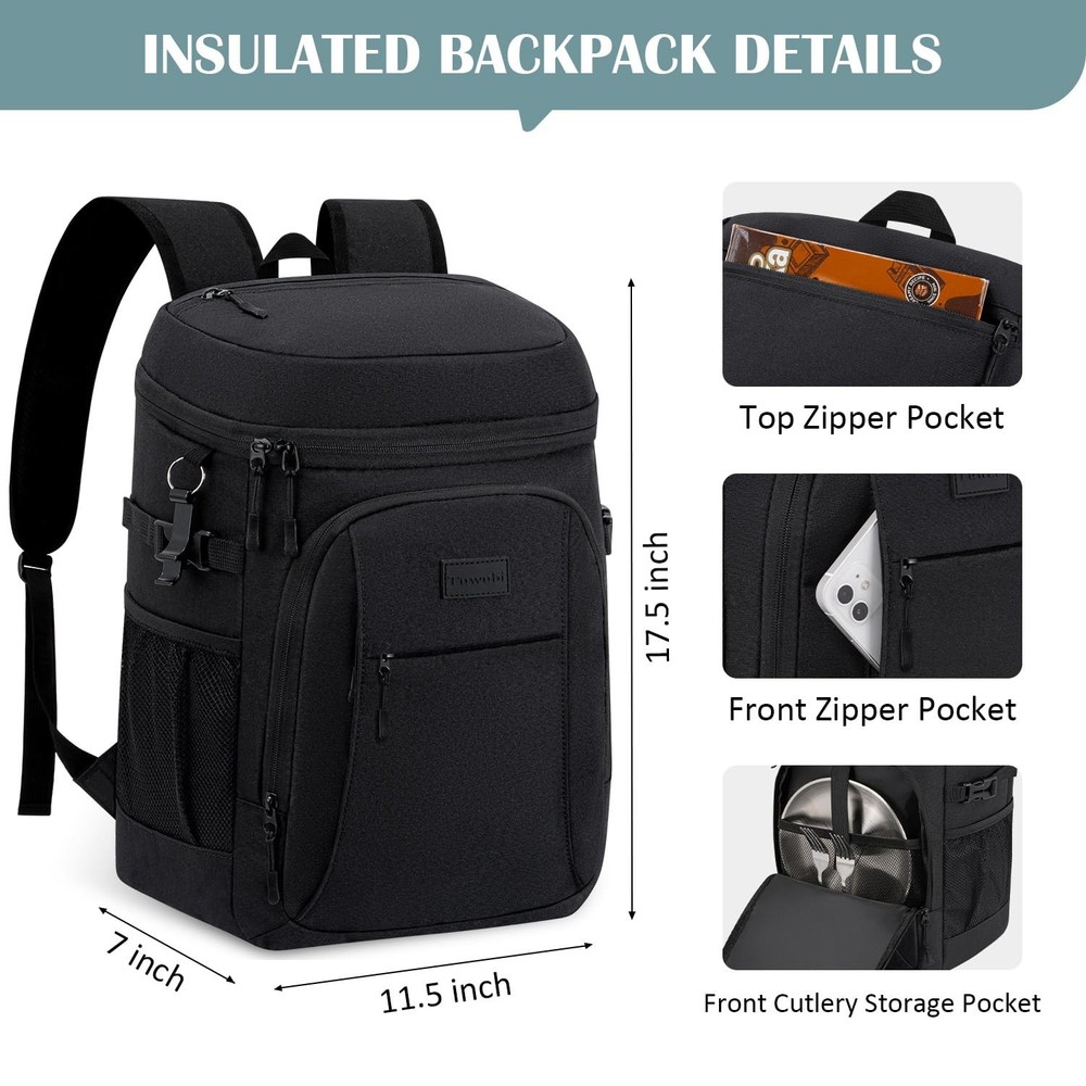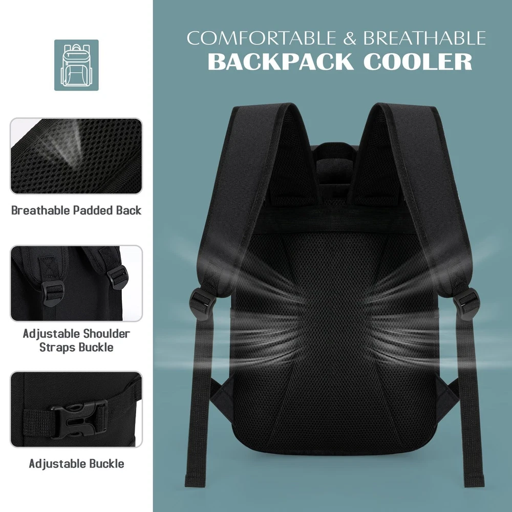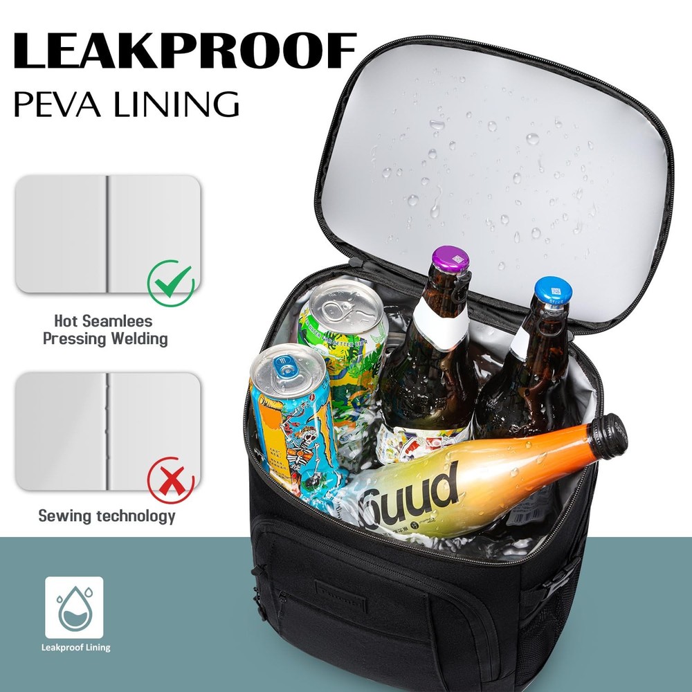Cooler Backpack 35/42 Cans, Backpack Coolers Insulated Leak Proof for Men Women, Waterproof Soft Sided Lunch Camping Beach Travel Ice Chest Backpack Cooler Bag 【Insulated & Leak-proof】 insulated leak-proof cooler backpack has high density insulation material and premium leak-proof lining, which work together to provide excellent insulation. It ensures leak-proof insulation while keeping food and drinks fresh and cool for up to 20 hours. You can enjoy a cold beer, fresh fruit or food with friends or family anytime. 【Large Capacity & Multiple Compartments】 Available in two sizes - 10.5" x 7" x 16.5" (35 cans) or 11.5" x 7" x 17.5" (42 cans). This soft-sided cooler bag is roomy with one main cooler compartment and three other compartments, each zipped to hold food, drinks, fruit, ice, plates, utensils and more. Mesh pockets and adjustable buckles on both sides of the cooler keep items secure; the top compartment and front pocket hold snacks and small items, keeping everything organized and within reach. 【Soft & Comfortable Padding】This cute portable cooler bag for backpack features thick padding on the back panel and double shoulder straps, which can free your hands, avoid shoulder wearing and reduce fatigue during travelling, and make your travelling more relaxing and enjoyable! The top of the beer cooler features a hanging fabric loop with a built-in bottle opener for added convenience. 【Versatile Uses】Our cooler backpack for women is not only perfect for mums to take breast milk on the plane. It can also be used as a day pack, lunch backpack, perfect for work, beach, picnic, camping, hiking, fishing, boating, travelling and more. 【Warm Tips】 Please do not touch with open flame or cut with sharp knives. To avoid prolonged exposure to rain, humidity, sunlight exposure environment will affect the insulation effect.
