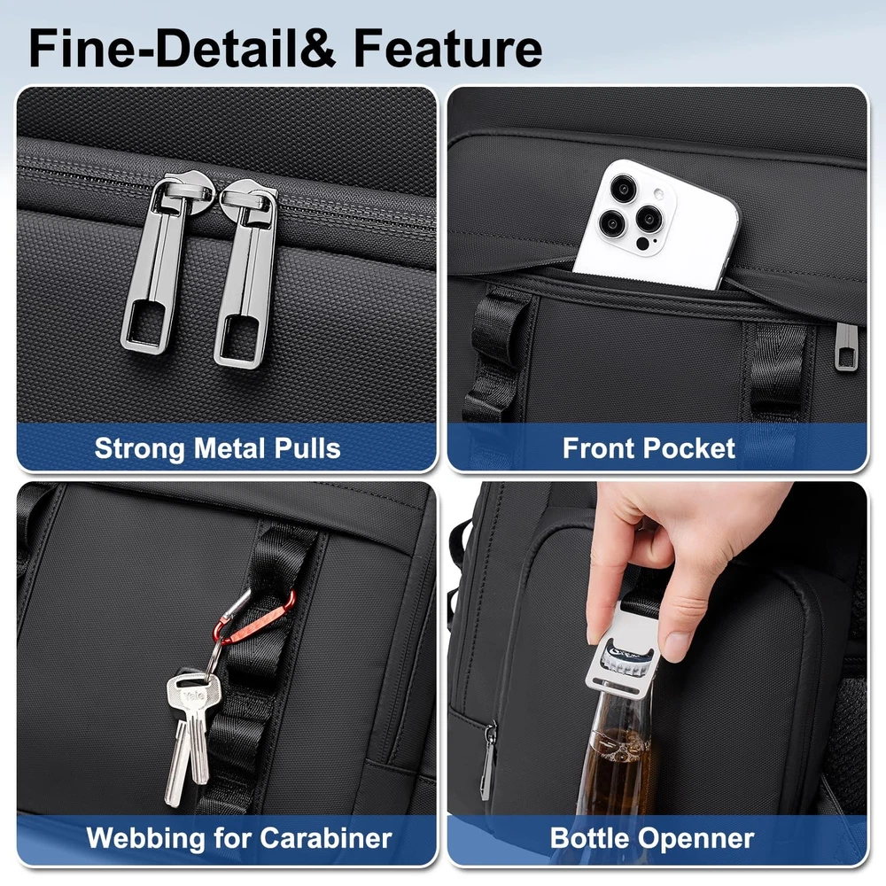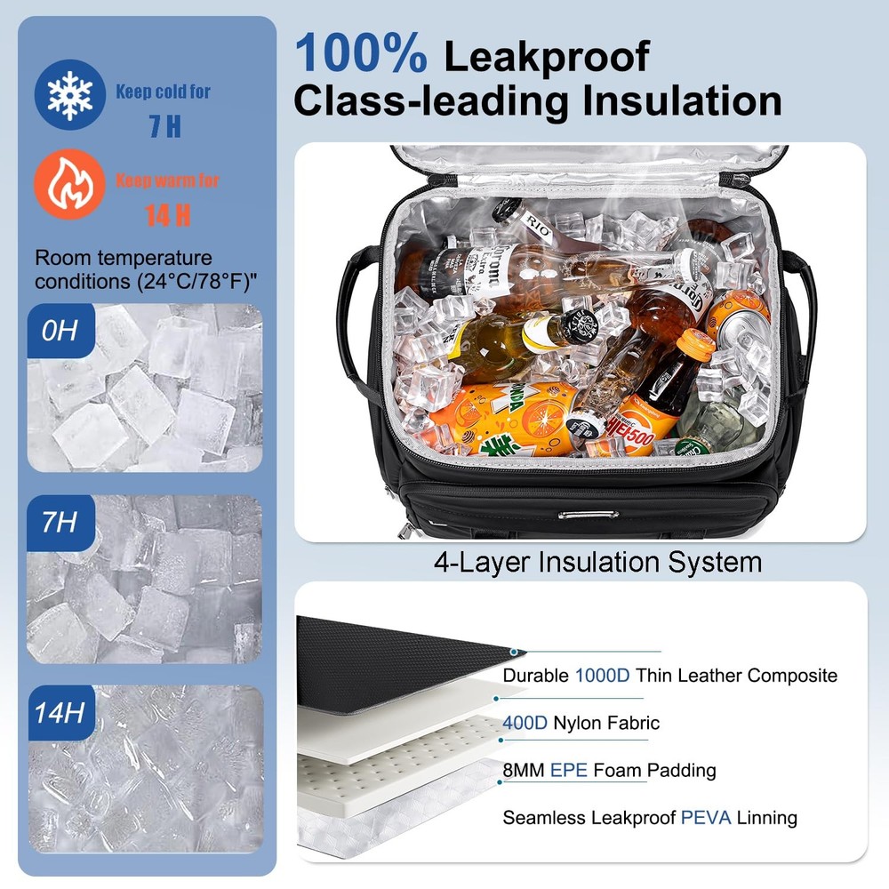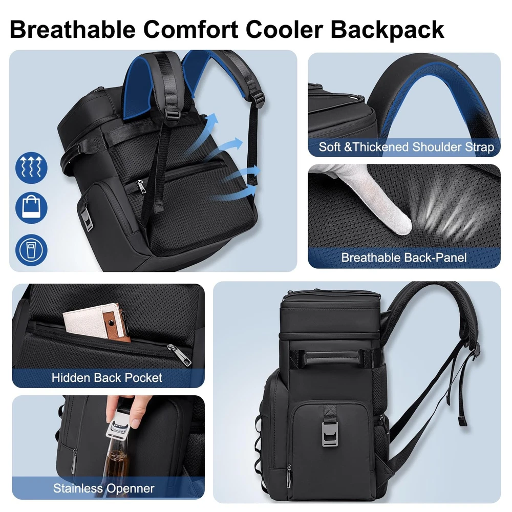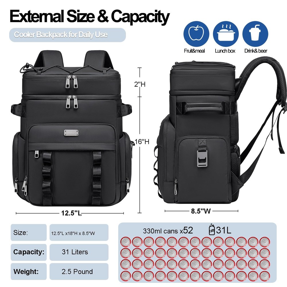 Leakproof & Insulated Backpack Cooler 【Leakproof & Insulated Backpack Cooler】Backpack cooler Crafted with 8 mm foam insulation padding, Soft cooler backpack maintains food temperatures for up to 16 hours. Backpack ice chest adapt the seamless hot pressing process ensures a leak-proof silver PEVA lining, Further reinforced by smooth horizontal zippers to prevent leaks. Backpack coolers insulated leak proof ideal for beach picnics, hiking, camping, travel, boating, baseball games and work. 【Waterproof & Comfortable Design】Backpack cooler for men constructed from high-density, scratch-resistant nylon with a waterproof PU coating, cooler backpack insulated waterproof guarantee 100% waterproofing and easy cleaning. beach cooler bag 's airflow back system enhances air circulation and heat dissipation, while adjustable, breathable shoulder straps reduce fatigue during extended trips. cooler lunch box embrace padded back panel which can effectively distributes weight for stability. 【Back Pack Cooler with Multiple Compartments & Pockets】Insulated cooler backpack Featuring two insulated compartments for beverages and dry food storage, cooler backpack/hielera mochila also includes a front zip pocket for utensils, two large side pockets, and side pocket for snacks or water bottles. Camping backpack has hidden back pockets provide secure storage for valuables, with a bonus bottle opener for added convenience for large cooler. 【Unique Functional Design Cooler Bag】backpack cooler leak proof has a large front pocket offers easy access to tableware, while the picnic backpack is equipped with a stainless steel bottle opener for effortless drink access. insulated backpack for men has 8 webbing holes on the front allow for hanging keys, water bottles, and tools. The top of lunch backpack includes a stretch cord for hanging sweaters or mats. Dual handles on each side ensure ease of carrying and durability. 【Spacious Capacity Cooler Backpack】Large backpack cooler measuring 18.0'' x 12.5'' x 8.0'' (H x L x W), cooler backpack accommodates up to 52 cans (31 liters) of beverages, providing ample space for a full meal, drinks, snacks and essentials. A versatile gift bookbag cooler is suitable for both men and women, mochila termica waterproof cooler bag is perfect for beach trips, picnics, hiking, camping and more, ensuring items remain at the desired temperature throughout the day.