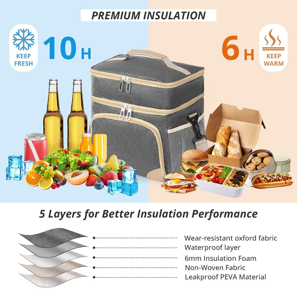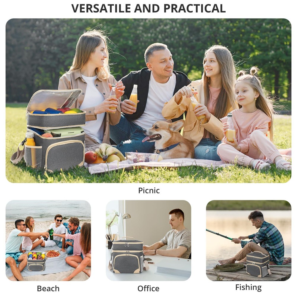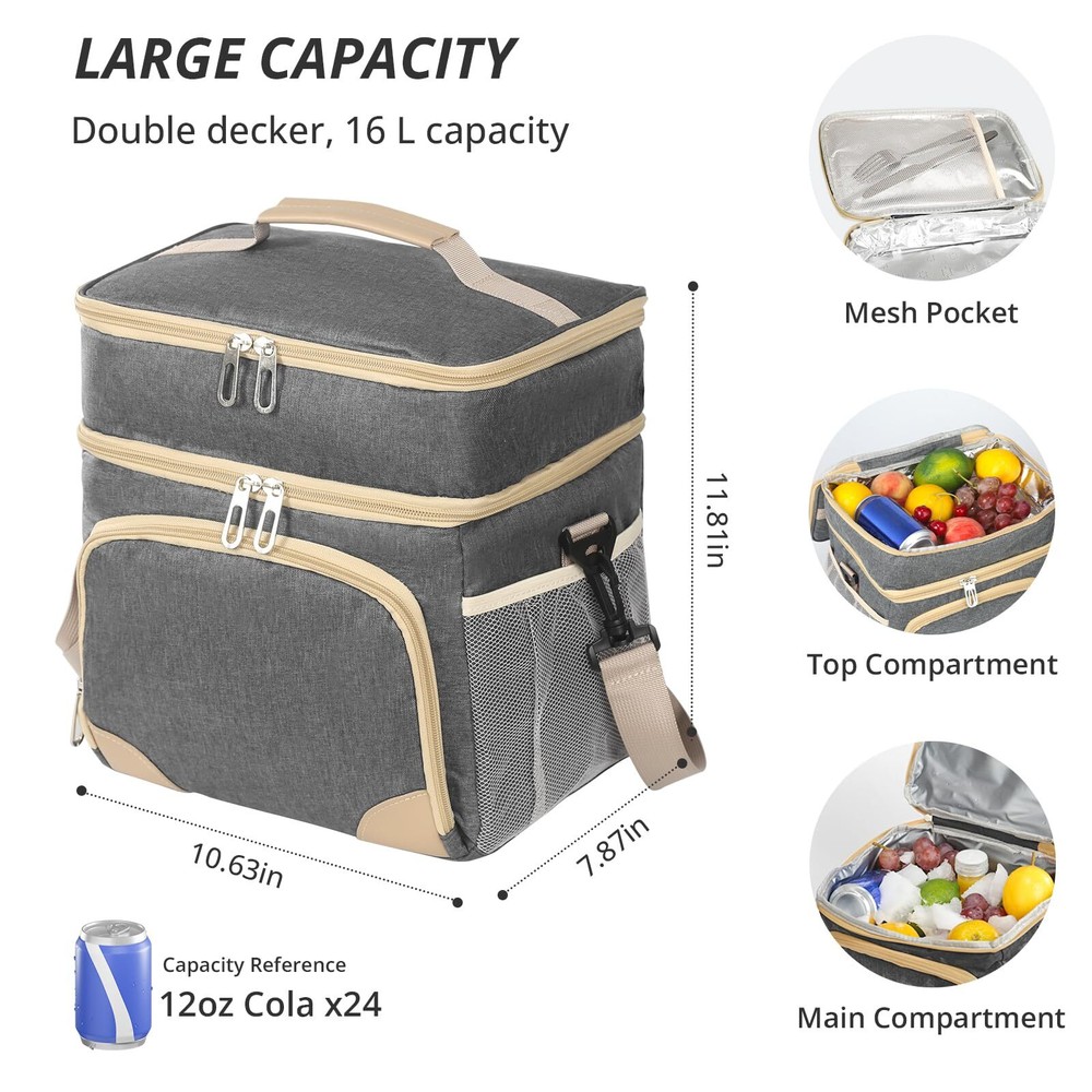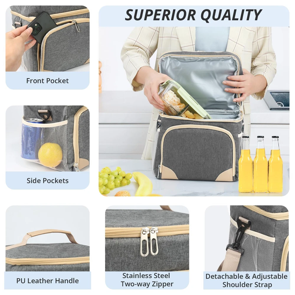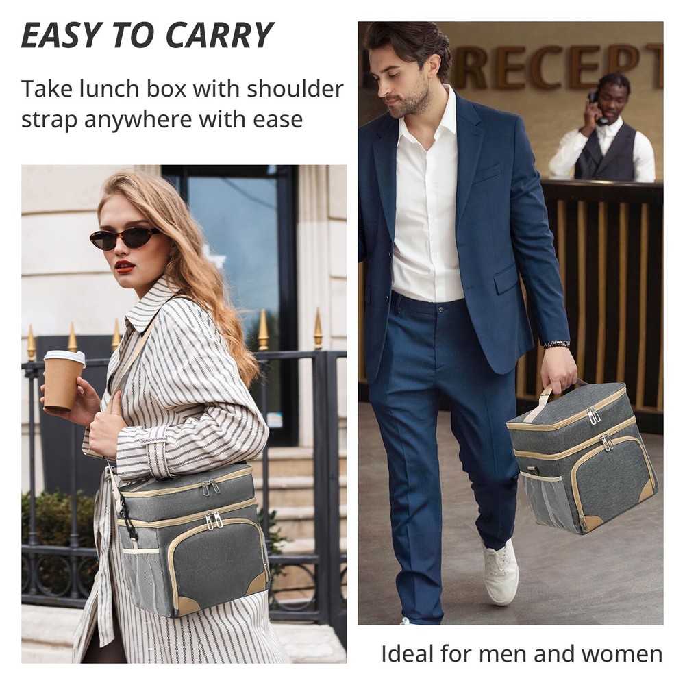 Insulated Lunch Box for Men Women Double Deck Lunch Bag for Men Waterproof Freezable Lunch Cooler Bag for Office Work Picnic with Adjustable Shoulder Strap Grey 🛒 Product Overview 💼 Features 【16L LARGE CAPACITY】: With dimensions of 10.6x7.9x11.8 inches, this large lunch box for men heavy duty has ample space for multiple meals or up to 24 cola cans. Its dual-deck design lets you separate hot and cold foods, ideal for busy men and women who want to keep their meals, beer, drinks, and fruits organized and balanced throughout the day. The front zip pocket and side mesh pockets of mens lunchbox for work offer additional storage space for a water bottle, phone charger, utensils, and more. 【PORTABLE LUNCH BOX】: Take your meals, snackes and drinks anywhere effortlessly with Insulated Lunch Box for men. Featuring an adjustable shoulder strap and a soft PU leather handle, you can carry it as a messenger bag, shoulder bag, or handbag. Perfect for work, office, picnics,camping, hicking, beach, and short trips. 【SUOERIOR INSULATION】:Advanced 6mm PEVA foam of lunch box for adults keeps your food hot for 6 hours or cold for 10 hours, so your food stay fresh and delicious all day, whether you're at work or on a picnic. The large lunch bags for men keeps food and drinks cool all day if you put an icepack in it. 【WATERPROOF & LEAKPROOF】: Never worry about spills again. The meal prep lunch bag features a 100% waterproof and leakproof interior lining, preventing any messes in your bag or car. The heat-sealed lining of cooler bag for women is easy to wipe clean with a cloth, maintaining hygiene and convenience. 【VERSATILE AND PRACTICAL】: The wide opening and two-way zipper of the construction lunch box for men allow for easy access. Perfect for various occasions, the lunch box for women men is great for work, picnics,family travel, camping, making it a versatile companion for your daily adventures. Perfect gifts for husband, wife, boyfriend, girlfriend, father, mother, birthdays, Christmas, and more! 🎯 Customer Favorites Our customers love this product because of its unmatched quality, innovative design, and outstanding value. Join them in making a smart purchase! 💳 Payment Policy We accept payments through PayPal and all major credit cards for a secure and convenient transaction experience. In case of any issues with the payment process, don’t hesitate to contact us through eBay messages, and we’ll be happy to assist you. 🚚 Delivery & Shipping We ship directly to your verified address on eBay. Orders are processed within 1-2 business days. Standard shipping typically takes 3-7 business days. Please contact us if there are any issues. 🔄 Return Policy Enjoy a 30-day return policy. Items must be returned in their original packaging and condition. Refunds will be issued promptly upon receipt of the return. 💬 Contact Us Have questions? Reach out to us via eBay messages. We're here to help you with any inquiries!