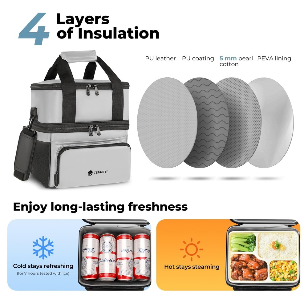 Fresh food, all day! This insulated lunch bag (7hr ice cold!) keeps meals perfectly chilled or warm with 4-layer insulation. 100% leakproof lining, premium YKK zippers, and a water-resistant PU leather exterior make it functional and stylish. Easy cleanup & comfy carrying (handle and shoulder strap). A perfect gift for on-the-go eaters! Double Deck & Lasting Freshness: This large insulated lunch bag (11.5×8×10.5″) boasts 4 layers of insulation materials (with 5mm extra thick pearl cotton) for exceptional 7-hour cold retention (tested with ice) and heat preservation. And with 15L of 2-deck roomy storage for lunch boxes, fruits, drinks, and more, you can pack it all and keep fresh all day 100% Leakproof Confidence: Experience the peace of mind of 100% leakproof storage with our seamless PEVA lining. No more worries about spills from beverages or melted ice ruining your lunch bag, so you can pack any food you want to keep warm or cold with complete confidence Trusted YKK Zippers: This lunch bag for men is built to last with premium YKK zippers. Renowned for smooth operation and durability, these zippers stand up to regular use with ease, ensuring a consistently hassle-free experience every time you open or close your bag Effortlessly Cleanup: The lunch bag for women boasts beautiful PU leather exterior and PEVA liner with impressive water & stain resistance, enabling you to effortlessly wipe clean for any spills, stains and enjoy a lunch bag that looks great and stays pristine with minimal effort The Perfect Gift for On-the-Go Eaters: Surprise someone special with the gift of fresh, healthy lunches! This insulated lunch box keeps meals perfectly chilled or warm for hours. Plus, it features a comfy handle and adjustable shoulder strap for easy carrying, making it perfect for busy lifestyles