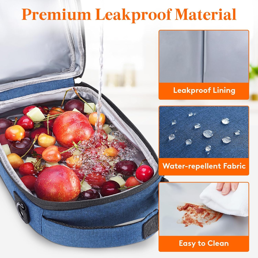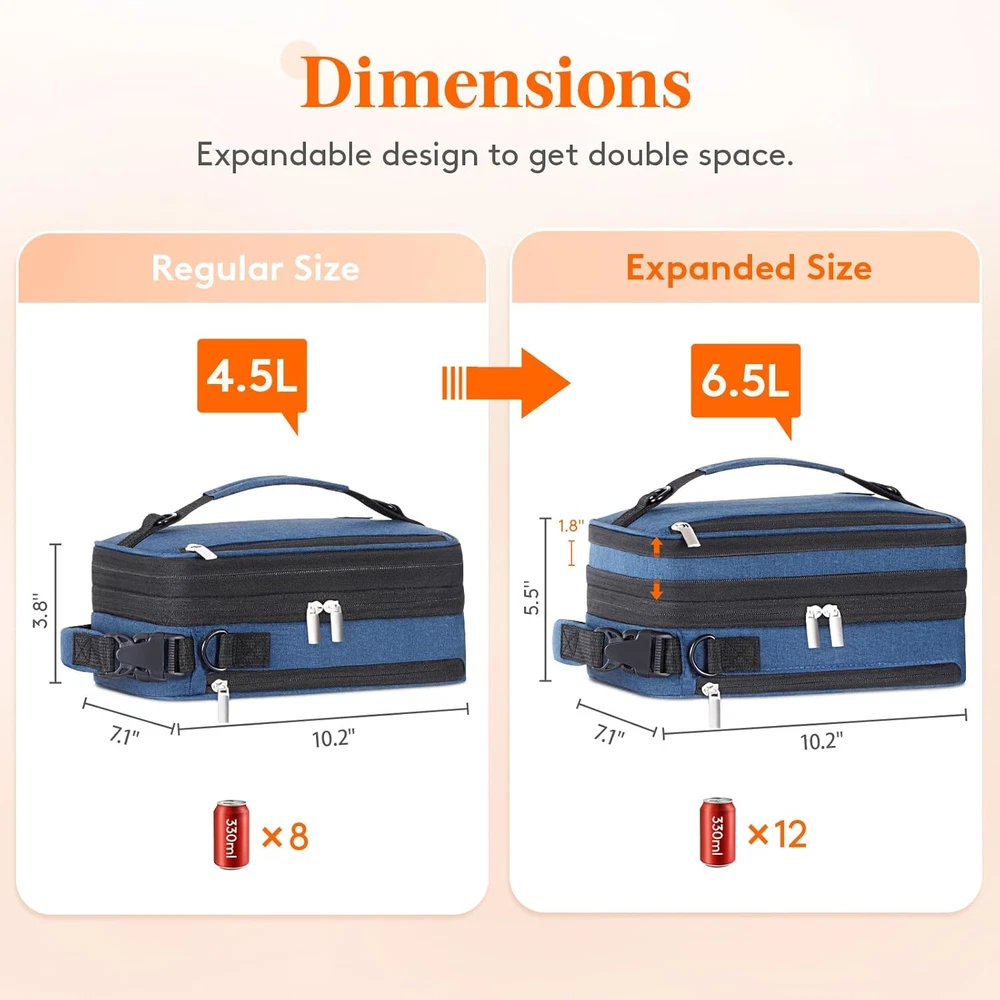 Excellent Insulation: Enhance cool insulation with 5mm thick PE cotton and 2 removable gel ice packs. Use exterior pockets to separate ice packs from food, preserving freshness and cleaning for 6-8 hours. Refrigerate ice packs for 6 hours before use for optimal performance. 5 Ways to Carry: The lunch bag can be carried horizontally or vertically using its dual padded handles or adjustable shoulder strap. The side handle is equipped with a quick-release buckle, allowing for hands-free carrying when attached to backpacks. Perfect for work, picnics, camping, and everyday use. Expandable Capacity: This lunch bag looks small but packs a punch. It measures 10.2" x 7.1" x 3.8" and can be expanded to 10.2" x 7.1" x 5.5" by zipping off the extra layer, providing the double space. It’s perfect for storing lunch boxes, fruits, snacks, drinks, and more, ensuring you’re covered for the entire day. Premium Leakproof Material: The lunch bag features a cationic fabric exterior that shields your bag from splatters and light rain. Its fully-lined, leakproof interior is easy to clean by wiping it with a towel. Practical Design: The lunch bag features strong two-way zippers that open wide, allowing for easy access to your food. And it offers 4 D rings that can not only attach shoulder straps but hang other items like keys or other items, adding to its versatility. Product Description The video showcases the product in use. The video guides you through product setup. The video compares multiple products. The video shows the product being unpacked. Highlights and Advantages Excellent Insulation Enhance cool insulation with 5mm thick PE cotton and 2 removable gel ice packs. The exterior pockets separate the ice packs from the food, preserving freshness for 6-8 hours. Expandable Capacity It measures 10.2" x 7.1" x 3.8" and can be expanded to 10.2" x 7.1" x 5.5" by zipping off the extra layer, providing the double space. Perfect for storing lunch boxes, fruits, snacks, drinks, and more. Details We Care Smooth Zippers Our lunch bag features sturdy metal zippers that smoothly slides and won’t easily break. Reinforced Handles The two padded handles are designed with reinforced seams for added strength and a comfortable grip. Waterproof Oxford Fabric The outer fabric is crafted from water-resistant Oxford material, ensuring protection from occasional splatters or light rain. Seamless Leakproof Features an ultra-thick EVA soft lining and hot-welded seams to prevent leakage. It is easily cleaned with a towel. Ready to Pack and Go 1 Work 2 College 3 Day Trip Compare These Lunch Bags Add to Cart Add to Cart Add to Cart Customer Reviews 4.2 out of 5 stars 159 4.6 out of 5 stars 51,444 4.6 out of 5 stars 995 4.6 out of 5 stars 11,132 4.6 out of 5 stars 4,200 Price $16.99 $ 16 . 99 $12.99 $ 12 . 99 $16.99 $ 16 . 99 $29.99 $ 29 . 99 — Volume 6.5L(12 Can) 8.5L (12-Can) 12L(16-Can) 23L (32-Can) 30L (50-Can) Dimensions 10.24" x 7.09" x 5.51" 10” x 6.7” x 8” 10" x 6.7" x 9.5" 14.9“ x 8.6” x 11“ 15.7” x 10.6“ x 12.2” Color Black/Grey/Blue Black/Grey/Blue/Dark Grey Black Black/Grey Black/Grey Insulated ✔ ✔ ✔ ✔ ✔ Leakproof Interior ✔ ✔ ✔ ✔ ✔ Carry Style 2 Handles & 1 Shoulder Strap 2 Handles & 1 Shoulder Strap 2 Handles & 1 Shoulder Strap 2 Handles & 1 Shoulder Strap 2 Handles & 1 Shoulder Strap