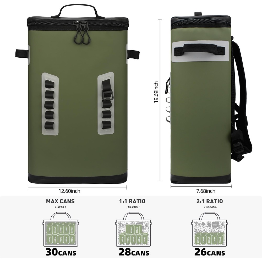 Weight: 2.69 Pounds Recommended Uses For Product: Camping, Picnic, Beach, Travel Import Designation: Imported Model Name: Soft Cooler Bag Capacity: 31.0 Container Type: Box gtin13: Does not apply Type: Does not apply Material: Thermoplastic Polyurethane (Tpu) Insulation Material: Polyurethane Brand: Outofo Included Components: Shoulder Girdle UPC: Does not apply Package Dimensions LxWxH: 20.28x14.17x9.45 Inches Size: Backpack 28Cans Color: Green