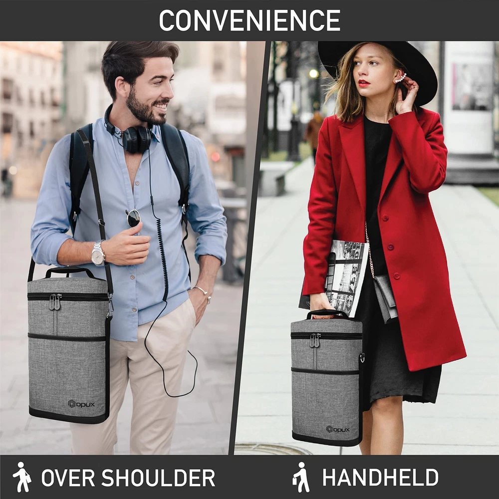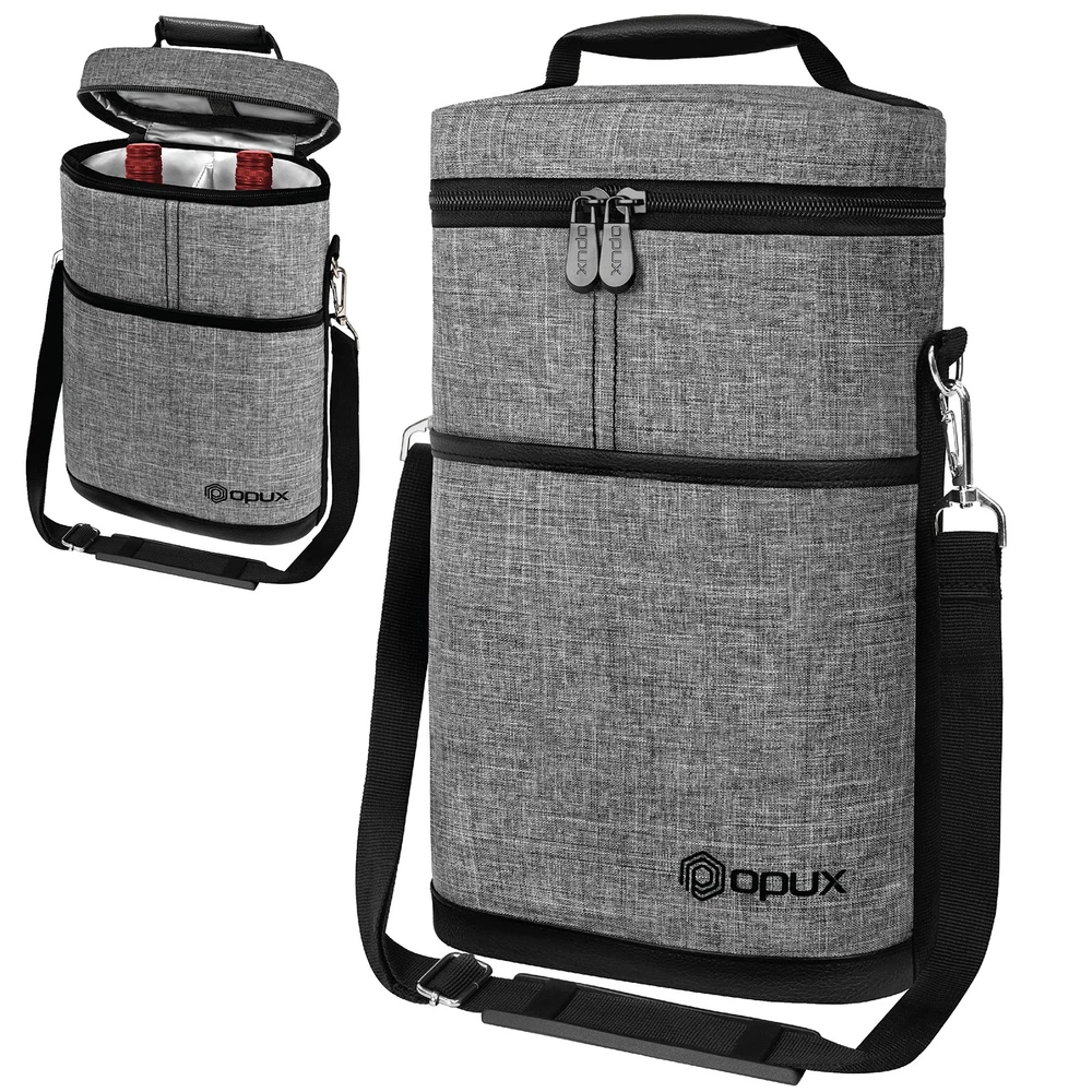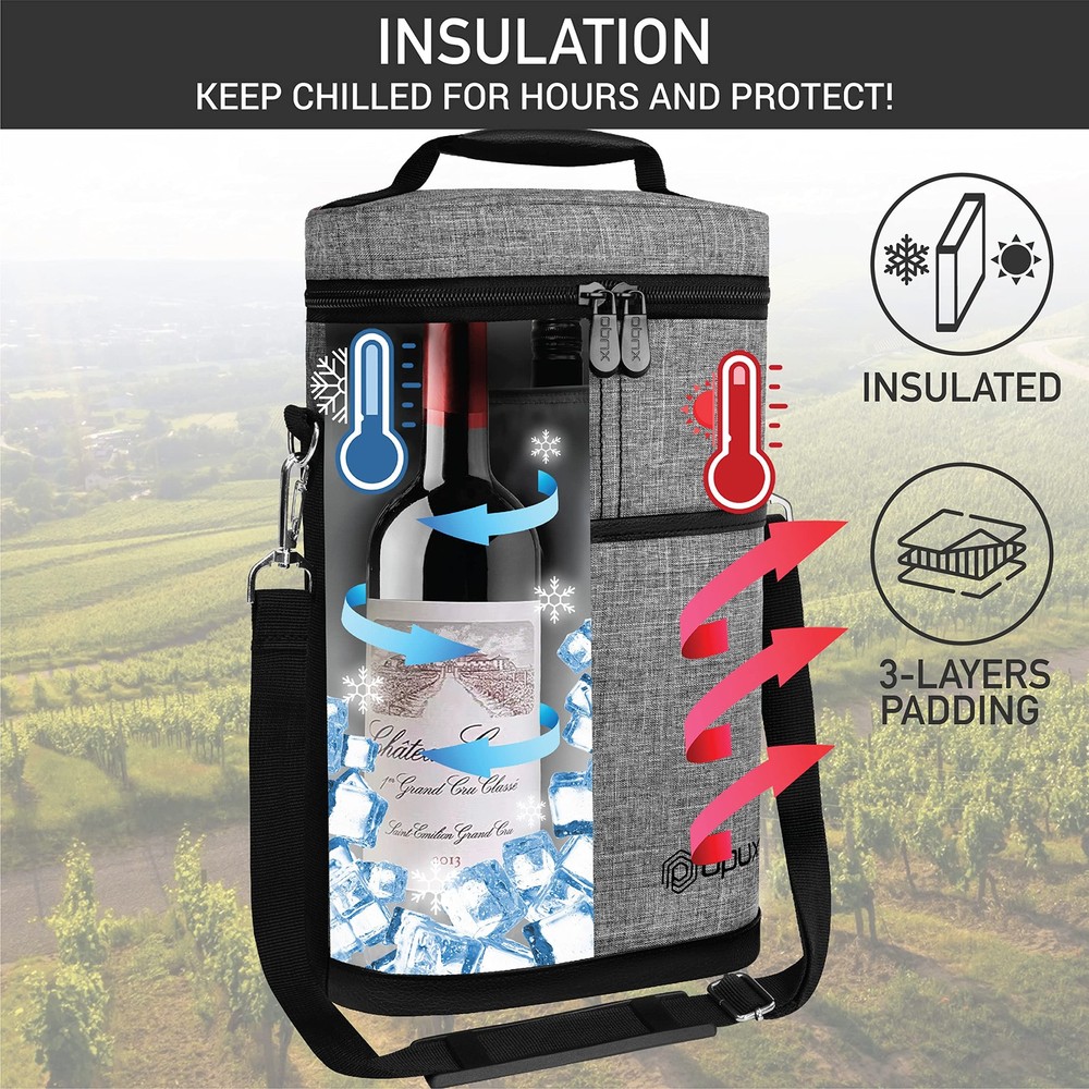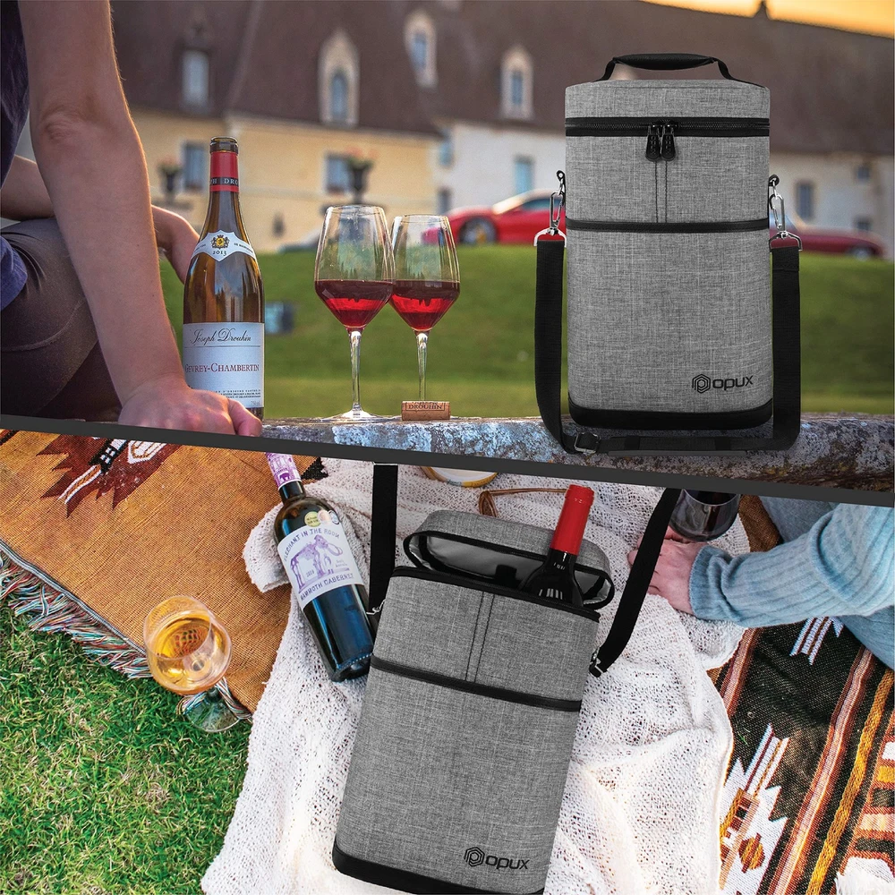 2 Bottle Wine Bag Tote Carrier | Leakproof Insulated Wine Cooler Bag for Travel, BYOB, Picnic | Padded Portable Wine Bottle Bag for Dinner Party, Christmas Gift for Wine Lovers, Women, Men Perfect for carrying wines with you while you're eating at a restaurant or a picnic, this Premium Insulated 2 Bottle Wine Tote Carrier by is equipped with dual zippers for easy opening. This wine tote carrier allows you to store more items with its front side pocket. It is lightweight and versatile, making it perfect to carry to any special occasion. A corkscrew is included with the tote carrier so you will never have to worry about bringing one from the house. This Premium Insulated 2 Bottle Wine Tote Carrier by measures 8 x 3.5 x 12.6 (L x W x H) creates quality products for your many lifestyles. Our Vision To provide premium kitchen and wine products that greatly simplifies your life. We will continue to innovate and bring exciting products to market so you can achieve more in life! Our Products At , we offer an extensive line of kitchen tools (such as salt & pepper mills), lunch bags, and wine bags/accessories made of highest quality for all occasions. Our products are meticulously designed with materials and functions that truly simplify your life so you can focus on creating your favorite meals or entertaining your guests. 2 BOTTLE WINE CARRIER TOTE: Our portable wine bag cooler is the ultimate wine bottle bag for your travel, parties, picnics, outdoor beach trips, and BYOB dinner events. Designed to transport two bottles, this padded double bottle wine carrier keeps your favorite wine chilled and protected. It's an essential accessory for wine lovers, making it an ideal gift for women, men, and drinkers who love a good glass of wine. Celebrate special days with stylish and functional wine holder bag. INSULATED & LEAKPROOF WINE COOLER BAG: Our thermal wine cooler bag keeps your wine at the perfect temperature for hours. Whether you're carrying the wine to a bar, restaurant, picnic, camping, or road trips, this wine side bag has three layers of insulating material, maintaining a steady temperature for your glass bottles, chilled wines, frozen liquor bottles and cool beer beverages. The leakproof lining ensures no spills, and it's easy to cleana must have item for wine lovers on the go! PROTECTIVE WINE BOTTLE PURSE: Safely travel with your precious wine bottles with our 2 bottle wine tote bag. Our padded wine travel bag is great for BYOB dining out at the restaurants, attending wine tastings, weddings, parties, or beach picnic trips. The thermal insulated padding provides extra protection against breakage. Its portable design makes it a wine suitcase luggage case for air plane travel. insulated wine carrier ensures proper storage and serves your favorite wine in style. WINE GIFTS FOR WINE LOVERS WOMEN: This grey canvas wine tote bag is a great wine accessory gift for wine enthusiasts, sommeliers, and wine drinkers. Wine gift set idea for wine lovers, men, women, family and dad during Christmas, Valentines Day, Anniversary, Mothers, Fathers day and Birthday. The wine carrier is also a holiday present for mom, coworkers, couples during weddings, housewarmings, engagements, bridal shower, hostess, secret santa, white elephant and gift basket swap. PICNIC WINE BAG CHILLER: 2 bottle wine tote carrier kit measures 8.5 x 4 x 14 (L x W x H), it fits most standard 750ML wine bottles. Crafted from high-quality 600D polyester, this wine bag picnic essential is built to last, while the PU leather trim adds a touch of sophistication. Great wine gifts for women and wine accessories gifts for men, this classy wine bag can accommodate other alcohol bottles such as liquor, champagne, spirits, cabernet, pinot and even wine glasses.
