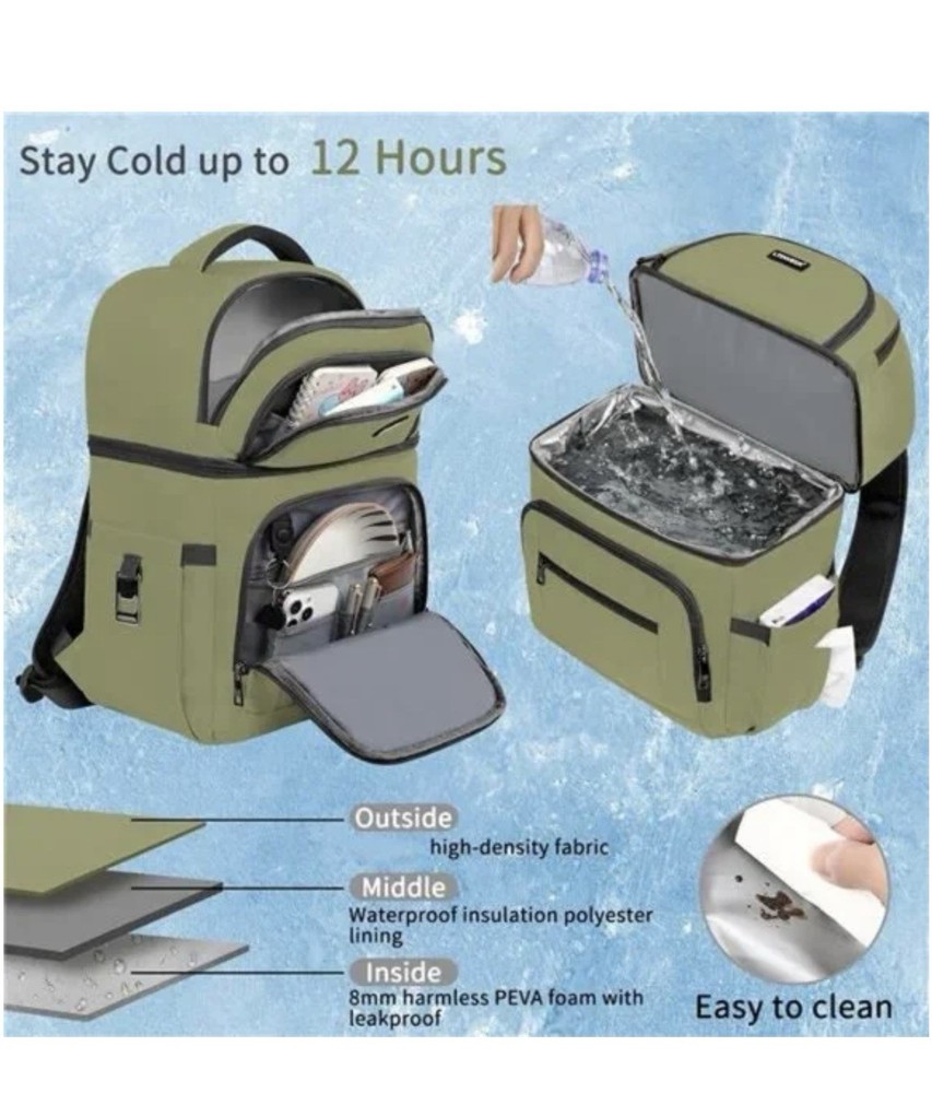 🧿DUAL COMPARTMENT BACKPACK COOLER: Insulated cooler backpack is roomy capacity to pack all your necessities, which with a main leak proof cooler compartment And upper half have space enough. Dimension of the cooler backpack: 12.3 x 6.3 x 16.2 inch 🧿INSULATED & LEAKPROOF COOLER DESIGN: The inner insulation of the cooler backpack is thickened with foam and the leak-proof PEVA liner works together to keep cold for hours without worrying about leakage. The insulated cooler backpack is a outdoor activities partner. You can use it as an insulated lunch backpack as well as a portable cooler for a beach, picnic, hiking, fishing, camping, travel or other outdoor activities 🧿RFID BACKPACK & ANTI-THEFT:RFID Pockets with RFID-radio frequency identification helps secure personal data encoded on you credit cards, IDs and passports.The oversized anti-theft pocket on the back of the backpack makes it easy to put your phone, passports and wallet 🧿MULTIPLE POCKETS: The backpack cooler leakproof includes 1 main large insulated leak proof storage compartment, 1 upper half compartment used to organize dry items, 1 large front zipper pocket for knife, fork and plate. 🧿LIGHTWEIGHT: The backpack cooler made of waterproof fabric which will not rip, tear or scratch but also lightweight. Breathable mesh pads on back make it convenient to carry for long durations, adjustable shoulder straps and waist straps can distribute the load, earphone/glasses Hang buckle on the strap for your easily use.
