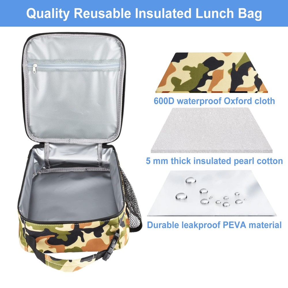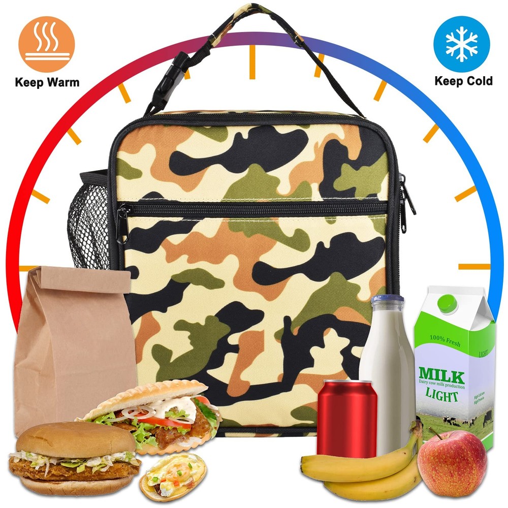 Insulated Lunch Bag, Leakproof Portable Lunch Box for Women Men Boys Girls, Large Capacity Cooler Bag with Handle and Bottle Pocket for Office School Camping Hiking Outdoor Beach Picnic High-quality Material: The lunch bag is made of 600D Oxford cloth, waterproof and leak-proof, wear-resistant, easy to clean and can be reused for a long time. The sturdy two-way zipper makes it easy for you to place and take out the lunch box. It is an idea gift for 7-18 years old children, boys. Keep Food Hot / Cold: Our insulated lunch bag has an insulating layer to keep your lunch hot/cold for hours, keep your food fresh. It can meet all your daily lunch, meal preparation or snack needs. Multi Compartments:Our lunch box is designed for maximum storage efficiency, 1 main zipped pocket, 1 internal mesh pocket, 1 side mesh pockets. provides you with plenty of space to store lunch boxes, fruits, snacks, drinks, etc. The sturdy double zipper design of the main pocket is very easy to open and close. Easy to Carry: the size of the lunch bag: 10.2" L x 4.3" W x 8.6" H, suitable for 6 cans or 1 person lunch. With a detachable buckle/handle, it can be tied to any backpack and suitcase, making it an ideal lunch bag for work, office, school and travel, suitable for men, women, boys and girls. Easy to Clean: Our lunch bags are waterproof and leak-proof, the inner lining can be easily wiped clean with a damp cloth. Cleaning is effortless.