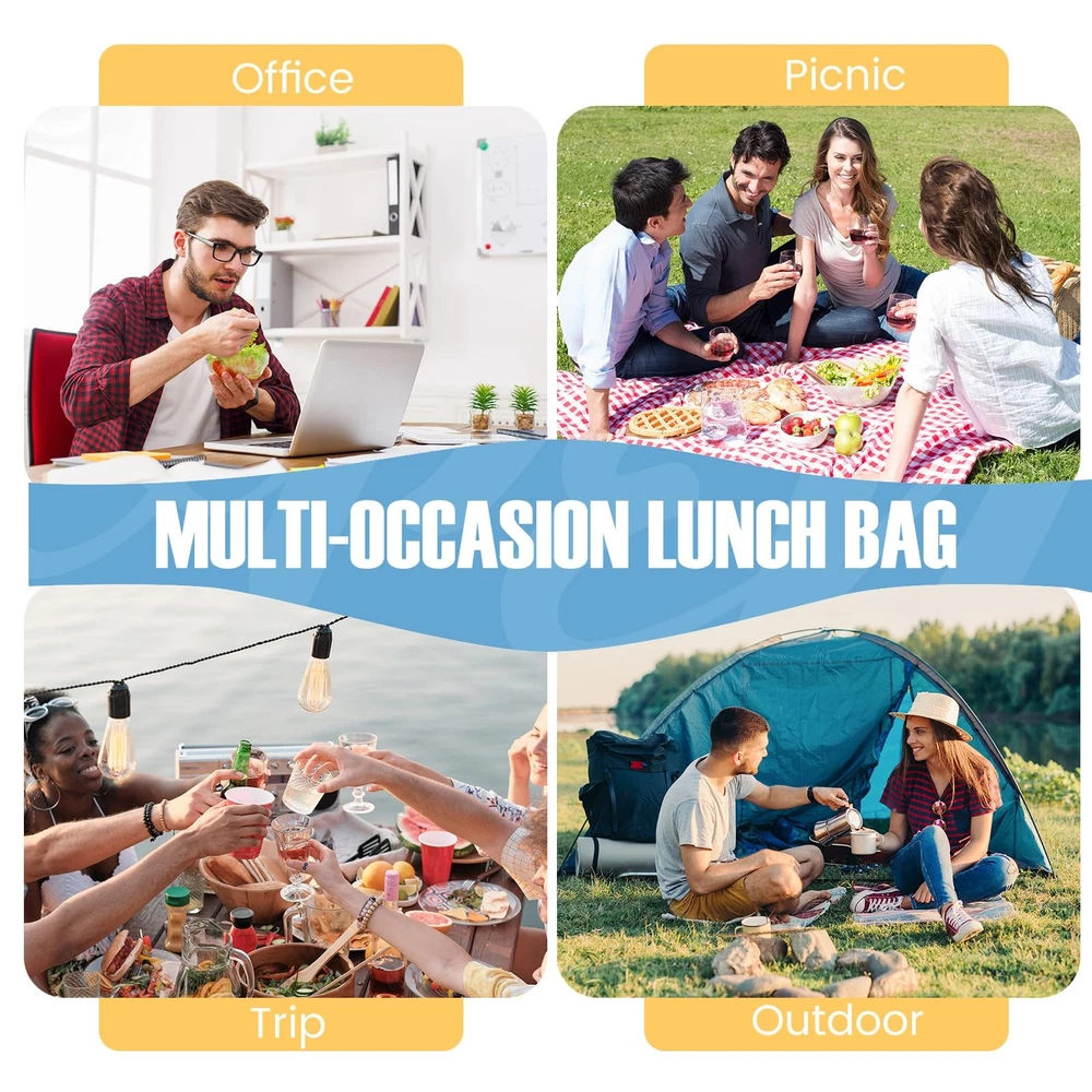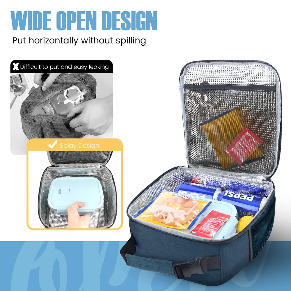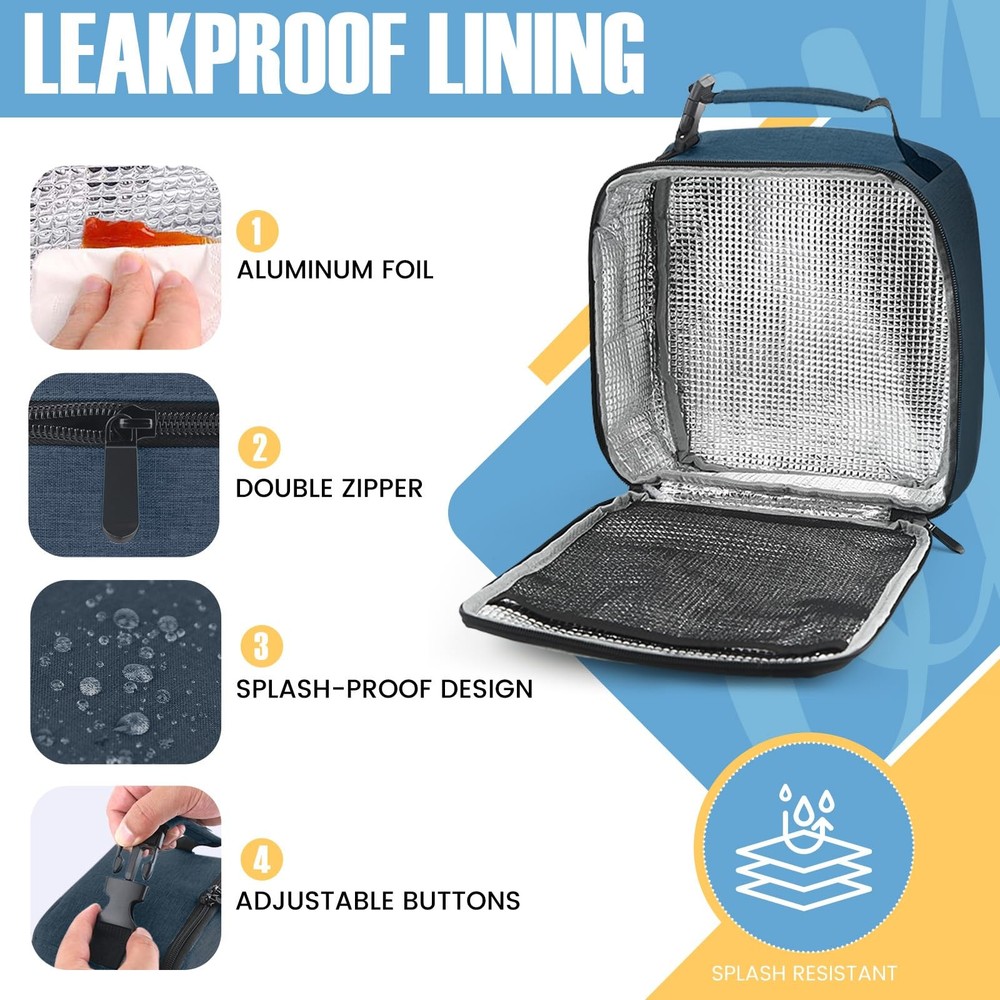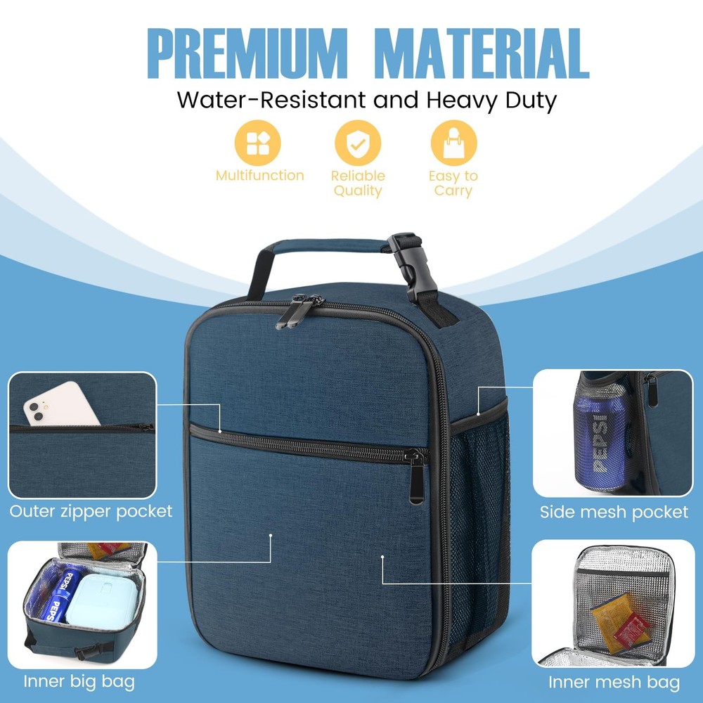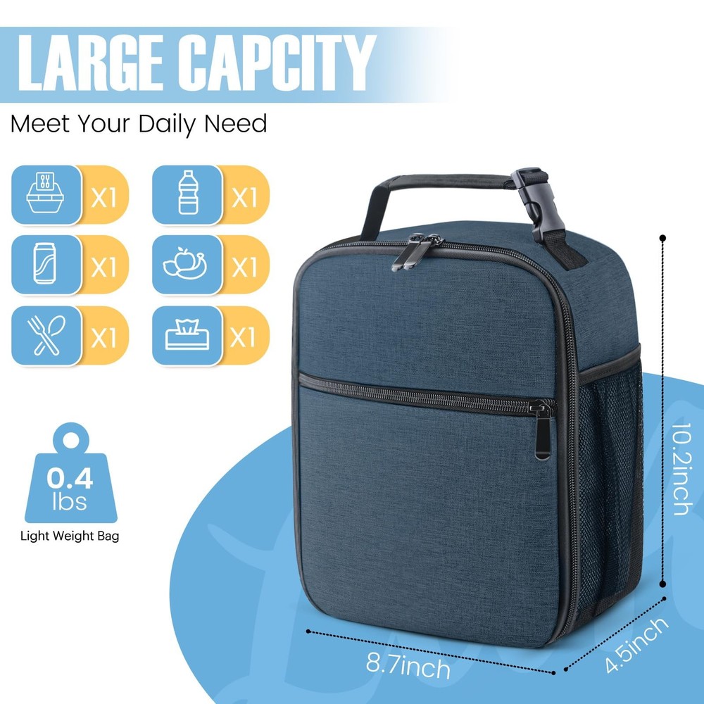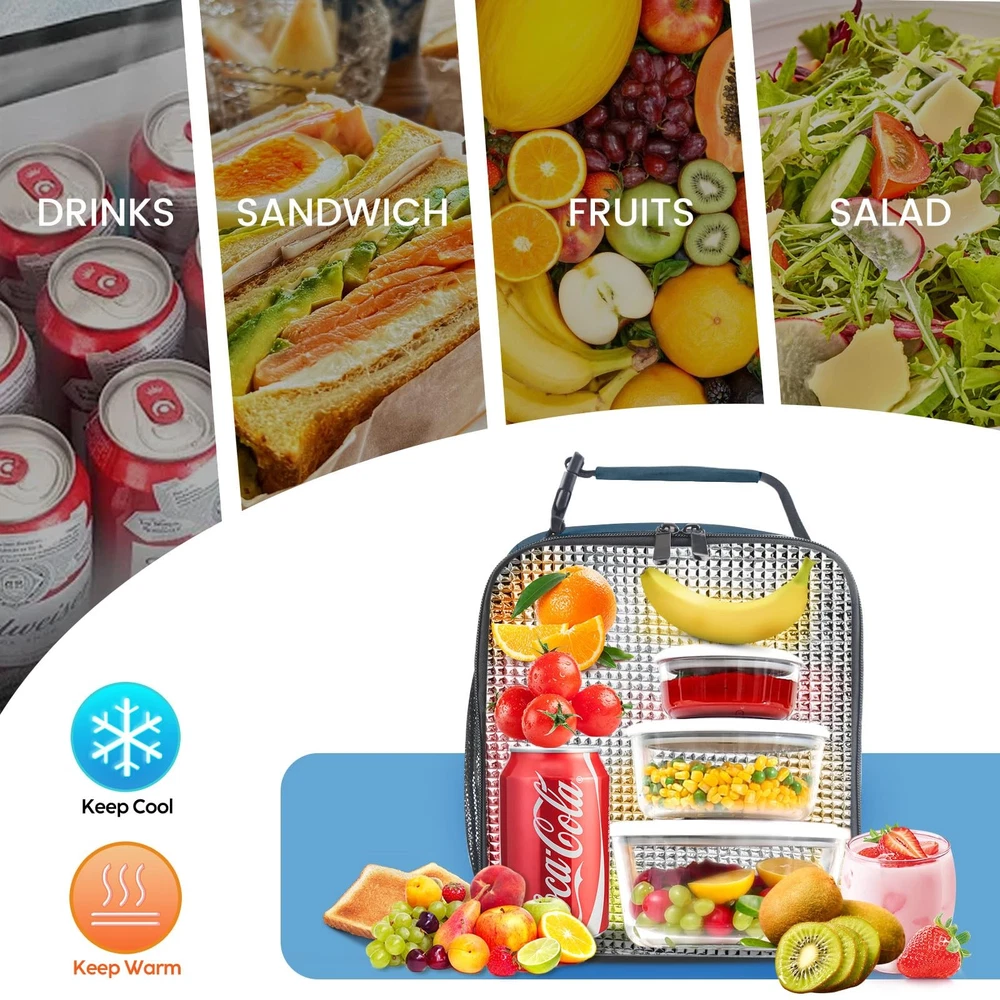 Lunch bag 【Large Capacity Lunch box】- The size of the insulated lunch bag: 9.3''L x 4.7''W x 10.2''H. It is spacious enough to accommodate your food, sandwiches, snacks, drinks, breads, and more. It will fulfil your meal needs for the entire day. 【Waterproof Oxford Cloth Exterior】The lunch box features a waterproof Oxford cloth outer lining, ensuring that your belongings remain dry and protected, even in wet environments. 【Great insulation】 With a pearl cotton insulation layer and an aluminum film interior lining, lunch bags provide excellent insulation capabilities for both keeping your food warm and maintaining its coolness. 【Convenient Carrying Strap with Buckle】】The lunch tote bag is equipped with a sturdy carrying strap that includes a buckle. This design allows for easy carrying or hanging, providing versatility in how you transport the bag. 【Easy to Clean】This lunch bag is designed for easy cleaning. Simply wipe the surface with a damp cloth to remove any spills or stains, ensuring that it stays clean and ready to use. It ensures you can enjoy fresh food every day.