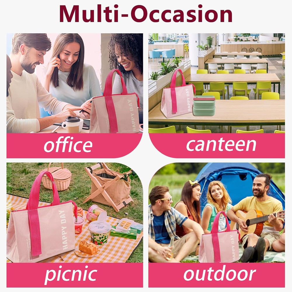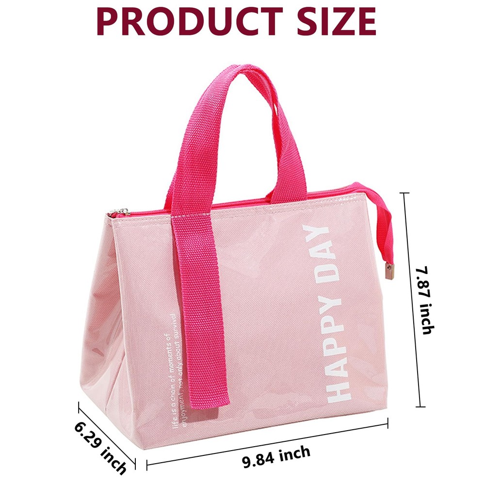 Stylish and Lightweight: The pink lunch tote bag is smooth and lightweight for a comfortable and portable experience, the smooth surface and fashionable design blend perfectly, making you look cute and elegant in all occasions Large Capacity: The lunch tote measures 9.84*7.87*6.29 inches, providing more interior space to hold a variety of food and drinks, making it easy for workers and other people to carry plenty of lunches and snacks to meet the needs of a long day of work and picnic or on the go Three-layer Insulation Technology: The lunch bag consists of an inner layer of food-thickened aluminum film, a middle layer of high-efficiency insulation material, and an outer wear-resistant waterproof layer, isolating the temperature in all directions, keeping your hot food insulated for a long time, and your cold food cold for a long time, keeping it in the best condition, and enjoying the deliciousness anytime, anywhere, no longer subject to the limitations of the environment Easy to Clean: The outer layer of the lunch tote is made of transparent waterproof material, which is waterproof and oil-proof, with high wear-resistant performance, easy to wipe, and can be recycled, making it the ideal portable lunch tote Perfect Gift: The lunch tote bag is a thoughtful companion for carrying lunches and snacks on a daily basis, and is also a practical choice for family and friends at Christmas and gift exchanges