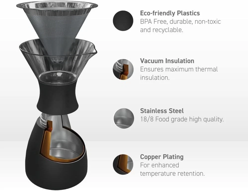 Premier Pour Over Craftsmanship - This 32-oz. coffee carafe pour over dripper is made with heat-resistant borosilicate glass and features an ergonomic, easy-carry design that makes it ideal for single cup use, hosting parties, or all-day enjoyment. Hot and Fresh Coffee Up to 12 Hours - A double-walled, vacuum-insulated design helps our coffee carafe retain drink temperatures for 12 hours to ensure a bold, fresh-brewed taste from the moment you make it until the last drop Stainless-Steel Micro Mesh Filter - Each pour-over coffee dripper features a reusable micro mesh filter that blocks debris, coffee grounds, and impurities from impacting taste, which means no more expensive paper filters. Ecofriendly, Reusable, BPA Free - Crafted with food-grade materials, our pour-over coffee maker is stain and odor resistant, easy-to-clean, and super portable for use at home, work, or traveling. Advanced Temperature Retention - This pour-over coffee maker offers insulated, copper-lined double-walled technology that makes it heat resistant for easier gripping and helps keep coffee hot and fresh for an amazing 12 hours at a time! Perfect for early mornings or long stretches at work.