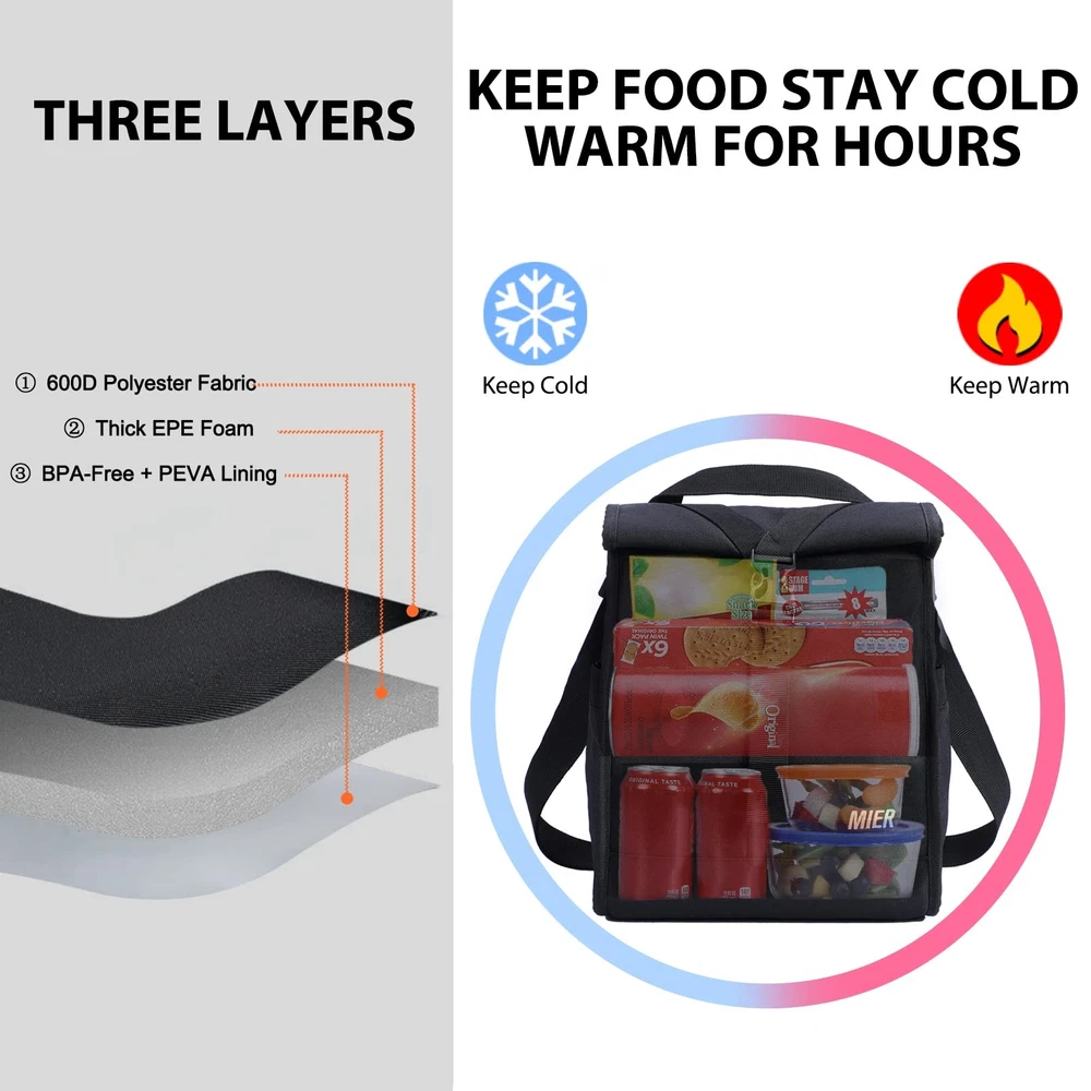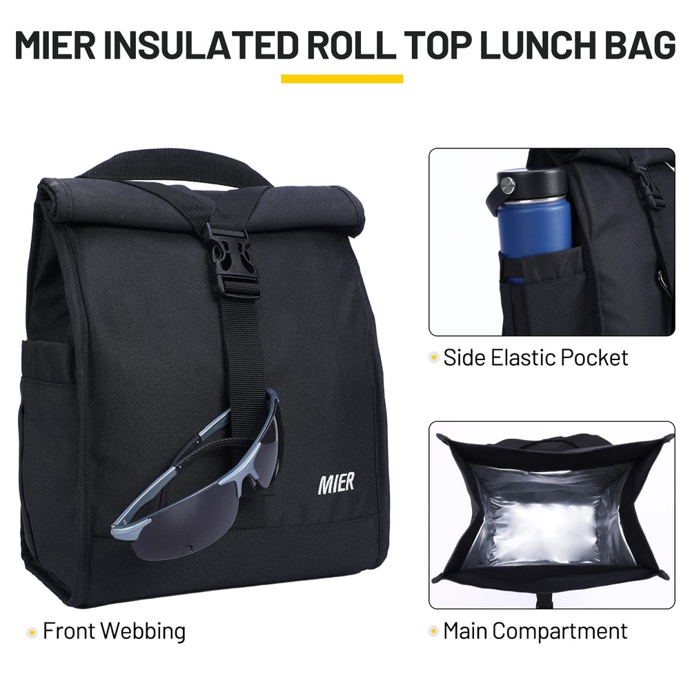 More Than Just a Lunch Bag – Your All-in-One Food Companion Whether you're preparing for a short weekend getaway or trekking on a mountain trail, this roll-top insulated lunch bag transforms into your personal pantry-on-the-go. With its stretchy sidekick pockets and expandable belly, it's like having a mini refrigerator that moonlights as a gear organizer! Why It Stands Out *Dual Side Pockets: Elastic mesh pockets securely hold water bottles or small accessories, freeing up main compartment space. *Roll-Top Expansion Magic: Simply unroll the top to add 2+ inches of vertical space – ideal for tall meal prep containers or last-minute snack additions. *3-Way Carrying Options: Switch between the padded shoulder strap, top handles, or backpack-style carry with quick-adjust buckles. Office & Commutes: Keep meals fresh for hours with leak-resistant insulation, ideal for desk lunches or midday snacks during busy workdays. Outdoor Adventures: Durable, water-resistant design protects contents during hikes, picnics, or beach trips, while lightweight portability fits into backpacks. Fitness & Errands: Compact yet spacious enough for protein shakes, snacks, or groceries, ensuring freshness post-workout or while running errands. Can the side pockets fit large bottles ? Yes! The retractable side pockets to hold your water bottle and umbrella. Reinforced stitching prevents tearing, even with heavy stainless steel bottles. Is the roll-top closure truly leak-proof? When fully rolled down and clipped with the buckle, the triple-sealed edges create an airtight barrier. The closure buckle strap is flexible and you can adjust the strap length according to your need How to clean the interior after spills? Simply wipe with a damp cloth – no lingering odors or stains. 【Roll Top Lunch Bag】Dimension:9 L x 6 W x 15 H inches, after roll:9 L x 6 W x 11.75 H inches. Zipperless design, the wide opening main compartment can hold 12 Cans which perfectly store the whole day food that you need. The closure buckle strap is flexible and you can adjust the strap length according to your need 【Multiple Pockets Lunch Tote】The 2 retractable side pockets are perfect for your water bottle and umbrella. Extra 1 hook & loop closure back pocket is available for organizing small things like tissue, utensils, phone, key, wallet or other small stuff you need 【Insulated Lunchbox】Three-layer heat insulation and roll-up tops are designed to keep your lunch stay cold/warm/fresh for hours. Easy to clean, if your food spill inside, just wipe it off with a wet cloth or napkins and it will be good as new 【2 Carrying Ways】Sturdy top handle for easy carrying. No zipper lunch box come with an adjustable & detachable shoulder strap providing more carrying options, free your hands to hold other items, which is more convenient, stylish and attractive 【Durable & Sturdy】Lunch cooler bag made of 600D Polyester material, durable buckles and enhanced by bar-tacks at major stress points, providing long-lasting durability against daily activities. Perfect for woman men adult to work office picnic beach