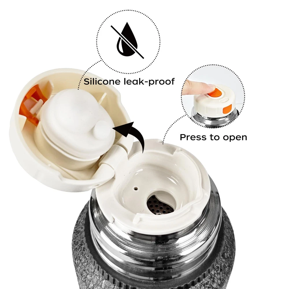 Double-Walled Vacuum Insulation: This stainless steel water bottle features double-walled vacuum insulation to keep beverages hot or cold for hours. Durable Construction: Made of high-quality 18/8 stainless steel, this bottle is durable, BPA-free, and won't retain flavors or odors. Leak-Proof Design: The bottle has a leak-proof cap and silicone gasket to prevent spills, making it ideal for travel, gym, or outdoor activities. Convenient Size: With a 27oz/800ml capacity, this bottle is perfect for staying hydrated throughout the day. Sweat-Free Exterior: The double-walled construction prevents condensation on the outside, keeping your hands dry and your surfaces safe.