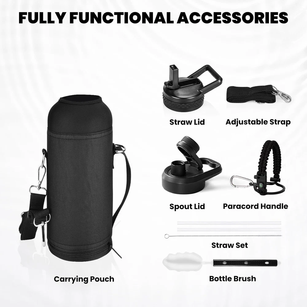 Special Feature: Sweatproof, Cold 48 Hours, Leakproof, Hot 24 Hours, Rust Resistan Item Dimensions W x H: 3.54"W x 10.39"H Included Components: Paracord Handle, Straw Lid with 2 Straws & Straw Brush, Carrying Type: Does not apply Special Features: Sweatproof, Cold 48 Hours, Leakproof, Hot 24 Hours, Rust Resistan Number of Items: 1 Is Oven Safe: No Is the item microwaveable?: No Is the item dishwasher safe?: No With Lid: Yes Base Diameter: 3.54 Inches Brand: Does not apply Recommended Uses For Product: Water, Tea, Coffee Color: Does not apply Item Weight: 40 Ounces UPC: 7445001511590 Size: 40 Ounces Age Range Description: Adult Model Name: Insulated Water Bottle Capacity: 40 Fluid Ounces Material Type: Stainless Steel gtin13: 7445001511590 Cap Type: Straw Cap Theme: Sport Product Care Instructions: Hand Wash Only
