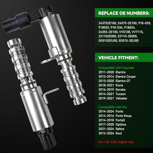Intake and Exhaust Engine Variable Valve Timing(VVT) Control Solenoid Fit for Hyundai Elantra Elantra GT Kona Sonata Tucson Veloster, Kia Forte Forte5 Optima Seltos 1.8L 2.0L Soul, Replaces 243752E100 About this item [Vehicle Fitment] This valvula VVT fits for Hyundai Elantra 1.8L 2011-2013, Elantra 1.8L & 2.0L 2014-2016, Elantra 2.0L 2017-2020, Elantra Coupe 1.8L & 2.0L 2013-2014, Elantra GT 1.8L 2013, Elantra GT 2.0L 2014-2020, Kona 2.0L 2018-2021, Sonata 2.0L 2016-2019, Tucson 2.0L 2014-2021, Veloster 2.0L 2019-2021. [Vehicle Fitment] Fit For Kia Forte 1.8L & 2.0L 2014-2016, Forte 2.0L 2017-2024, Forte Koup 2.0L 2014-2016, Forte5 2.0L 2014-2018, Optima 2.0L 2017-2020, Seltos 2.0L 2021-2024, Soul 2.0L 2012-2024. To ensure the oil control valve fits your car please use the Amazon ConfirmedFit tool at the top of the page by entering your car year, make, and model to get confirmed fit. [Replace OE Number] 243752E100, 24375-2E100, 918-033, 918033, 918-034, 918034, 24355-2E100, VVS138, VVT115, 221102E000, 22110-2E000, 5D0152EU00, 5D015-2EU00 [Premiumn Quality] Backed by IATF 16949 certified manufacturing processes, our engine variable valve timing solenoids are professionally precision-engineered to meet exact OEM specifications—ensuring a perfect fit and reliable, stock-level performance for your specific vehicle application. [Package Includes] 1 x Intake VVT Solenoid, 1 x Exhaust VVT Solenoid. › See more product details VVT Solenoid Intake and Exhaust Variable Valve Timing Fit for Hyundai Kia 1.8L 2.0L Engines Package Includes: 1 x Intake VVT Solenoid 1 x Exhaust VVT Solenoid Replace OE Numbers: 243752E100, 24375-2E100, 918-033, 918033, 918-034, 918034, 24355-2E100, VVS138, VVT115, 221102E000, 22110-2E000, 5D0152EU00, 5D015-2EU00 Vehicle Fitment: Compatible with Hyundai 2011-2013 Hyundai Elantra ALL 1.8L L4 - Gas 2014-2016 Hyundai Elantra ALL 1.8L L4 - Gas, 2.0L L4 - Gas 2017-2020 Hyundai Elantra ALL 2.0L L4 - Gas 2013-2014 Hyundai Elantra Coupe ALL 1.8L L4 - Gas, 2.0L L4 - Gas 2013-2013 Hyundai Elantra GT ALL 1.8L L4 - Gas 2014-2020 Hyundai Elantra GT ALL 2.0L L4 - Gas 2018-2021 Hyundai Kona ALL 2.0L L4 - Gas 2016-2019 Hyundai Sonata ALL 2.0L L4 - Electric/Gas 2014-2021 Hyundai Tucson ALL 2.0L L4 - Gas 2019-2021 Hyundai Veloster ALL 2.0L L4 - Gas Compatible with Kia 2014-2016 Kia Forte ALL 1.8L L4 - Gas, 2.0L L4 - Gas 2017-2024 Kia Forte ALL 2.0L L4 - Gas 2014-2016 Kia Forte Koup ALL 2.0L L4 - Gas 2014-2018 Kia Forte5 ALL 2.0L L4 - Gas 2017-2020 Kia Optima ALL 2.0L L4 - Electric/Gas, 2.0L L4 - FULL HYBRID EV-GAS (FHEV), 2.0L L4 - PLUG-IN HYBRID EV-GAS (PH 2021-2024 Kia Seltos ALL 2.0L L4 - Gas 2012-2024 Kia Soul ALL 2.0L L4 - Gas For 1.8L 2.0L engine only #175,216 in Automotive ( See Top 100 in Automotive ) #99 in Automotive Replacement Engine Intake Valves Shipping U.S.-Based |Fast & Free Shipping Daily |While supplies last | Note: For U.S. territories (PR, AK, HI, GU, VI), Overseas, or PO box/APO, please contact us prior to purchase to confirm shipping. Return Returns are accepted within 7 days if items are unused and in original packaging. Otherwise, restocking fees or rejection may apply. Payment We accept all major payment methods and are committed to your complete satisfaction. Any concerns will be addressed promptly and professionally. Please visit our eBay store to check out other items for sale! Thank you for shopping at our store.