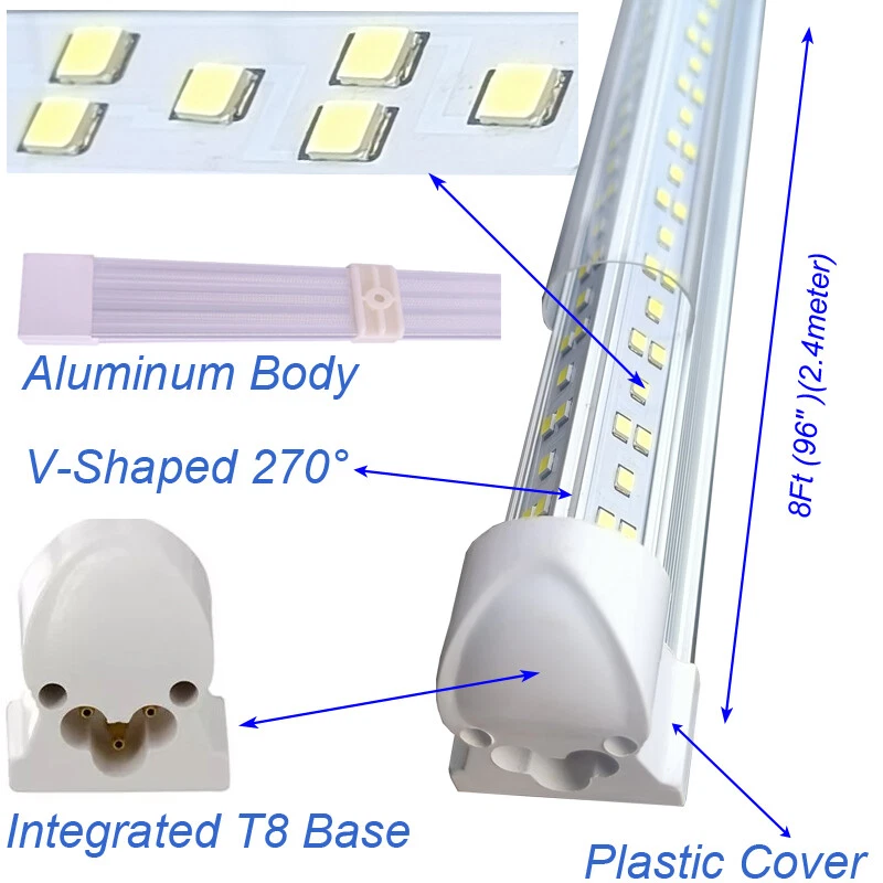 FAST DELIVERY - Ship from New Jersey or Los Angeles Warehouse via FedEx , 3-7 Days Delivered Your Door . SCIENTIFIC DESIGN - 8Ft LED Shop Lights Fixture is Made of 6500K Cold White SMD2835 LED Chip ,Plastic Clear Cover , Aluminum Bracket Housing ,and AC85-277V Constant Current Driver . It can work in -68F to 120F Temperature Conditions EASY INSTALLATION - The Integrated Tube Fixture Can be Install on Wall or Ceiling ,Easily Replace Traditional Fluorescent Tube Bulb . Plug and Play , Free Accessories (Power Cords, Connector , Extension Cords , Clip and Screw ) Come with Tube Lights Together WIDE APPLICATION - Linkable 8Ft Bulbs Widely Used in Garage Ceiling , Barbershop , Schools, Hospitals Basement , Factory Warehouses , Supermarkets Cooler Door , Offices, Shops,Hotels, etc Integrated LED Tube 8Ft 144W LED Bar Lamp LED Shop Light Fixture 6500K 25/Pack FAST DELIVERY - Ship from New Jersey or Los Angeles Warehouse via FedEx , 3-7 Days Delivered Your Door . SCIENTIFIC DESIGN - 8Ft LED Shop Lights Fixture is Made of 6500K Cold White SMD2835 LED Chip ,Plastic Clear Cover , Aluminum Bracket Housing ,and AC85-277V Constant Current Driver . It can work in -68F to 120F Temperature Conditions EASY INSTALLATION - The Integrated Tube Fixture Can be Install on Wall or Ceiling ,Easily Replace Traditional Fluorescent Tube Bulb . Plug and Play , Free Accessories (Power Cords, Connector , Extension Cords , Clip and Screw ) Come with Tube Lights Together WIDE APPLICATION - Linkable 8Ft Bulbs Widely Used in Garage Ceiling , Barbershop , Schools, Hospitals Basement , Factory Warehouses , Supermarkets Cooler Door , Offices, Shops,Hotels, etc