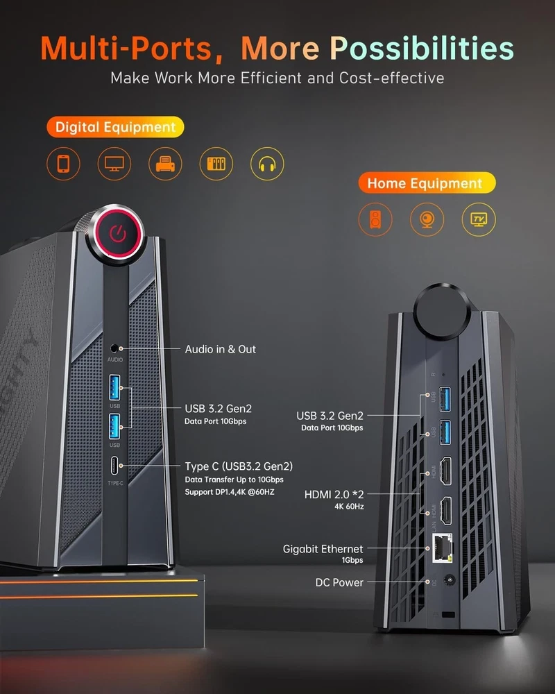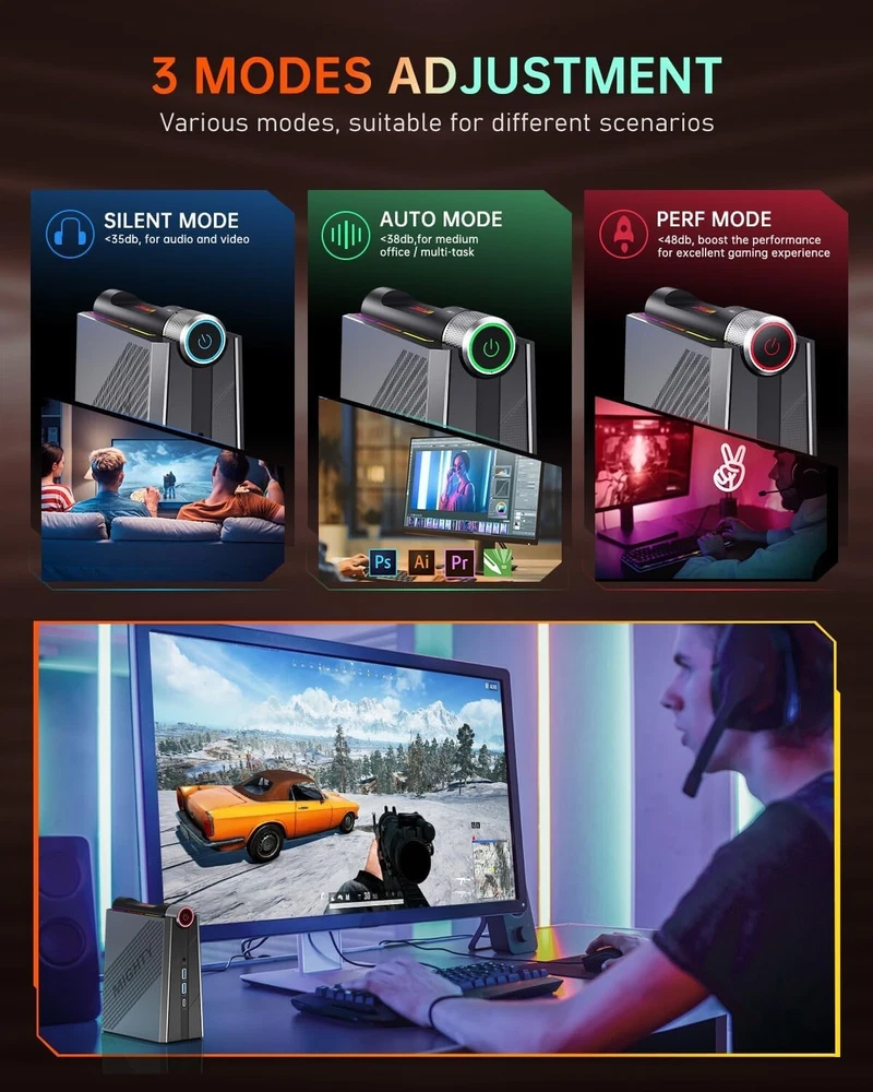 Intel Core i7-12650H Mini Gaming PC, 32GB Dual Channel 512GB NVME SSD, Desktop Tower Computer with 4K Triple Display, Type C, WiFi 6, BT Mini Desktop Computer 【High-end Core i7-12650H Processor】 mini pc uses 12th generation i7-12650H processor (10 cores 16 threads, up to , 24MB cache, 45W TDP). PC features a powerful and efficient core that runs smoother than i7-10810U/Ryzen 7 5800H and offers fast response whether it's gaming or rendering rich 3D graphics. Strong performance, perfect for daily use, such as business office, gaming entertainment, home theater, etc. 【Large Capacity: 32GB DDR4 & 512GB SSD】 The mini computer is equipped with 32GB dual-channel DDR4 (2x16GB, max 64GB) and 512GB NVMe SSD. You can replace the SSD with max 2TB or add 2TB inch HDD/SSD (not included) for storage expansion. Designed for game lovers, it offers faster game loading speed and faster graphics processing with a performance boost of about 20%. A mini tower pc that you cannot miss. 【Unique 3 Mode Design】 mini tower computer is equipped with 3 modes: Quiet Mode/Auto Mode/Performance Mode. Silent mode is suitable for watching movies, automatic mode is suitable for regular desktop software, and performance mode is suitable for playing games. You can change the mode by switch, which is very energy-saving. With the unique vertical design, this mini pc occupies almost the same space as a mobile , saving space and decorating the desktop. 【Stable Connection, Smooth Transmission】 mini desktop pc supports the latest WiFi 6 (, dual band), you can take your mini computer anywhere without worrying about connection problems. Support 10M/100M/1000M RJ45 interface, make transmission more efficient, no delay and no waiting. Bluetooth enables the PC to quickly recognize your accessories and ensure a stable and strong connection for a clean wireless desktop. 【Easy and Efficient Multitasking】 mini tower pc comes pre-installed with New OS system, bringing you smooth operation experience. Plus 2 HDMI ports and 1 Type-C port (4K HD), you can connect 3 displays at the same time, perfect for multitasking, saving time and increasing productivity. Enjoy Sale Enjoy New Products-Configuration Upgrades Max 20% off, Additional Discounts for Business Buyers