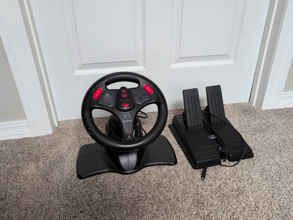 Enhance your racing game experience with the InterAct PlayStation PS1 V3 Racing Wheel. This wired controller is compatible with both Sony PlayStation 1 and Sony PlayStation 2. It features a sleek black design and is compatible with various racing games. The package comes with a steering wheel and pedal set, but please note that it has not been tested. Add this InterAct PlayStation PS1 V3 Racing Wheel to your collection of video game accessories and enjoy a more immersive racing experience.