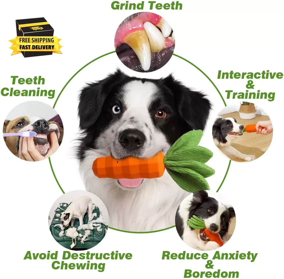 Green Leaves made of no stuffing plush with crinkle paper inside. Orange Carrot Body made of natural rubber. Toy dimensions is 9 in * 1.8 in. Squeaker Inside - Your dog's favorite new squeaky toy! The sounds would not too loud. Dogs can chew with this squeaky toys during the night and do not wake up the whole house. Milk Flavor & Rubber - Dog chew toy made of natural rubber materials for medium breed dogs. Milk flavor design easily attracts your dog's attention and arouse the chewing instincts of your dog. Dental Health Care - Raised texture on the surface effectively helps clean up the dirt and some food residues left on your dog's teeth. Reducing discomfort during the teething period and protecting them from oral diseases greatly. Interactive & Training - Interactive play, training games activity are good for strengthening the affection between you and your dog. Developing and Maintaining the dog's physical alertness. Accompany & Anxiety Relief - Let you dog far away form loneliness. Helping your dogs relieve anxiety and loneliness, and provide comfort even in complex environments such as transitions to new homes, thunderstorms, and travel.