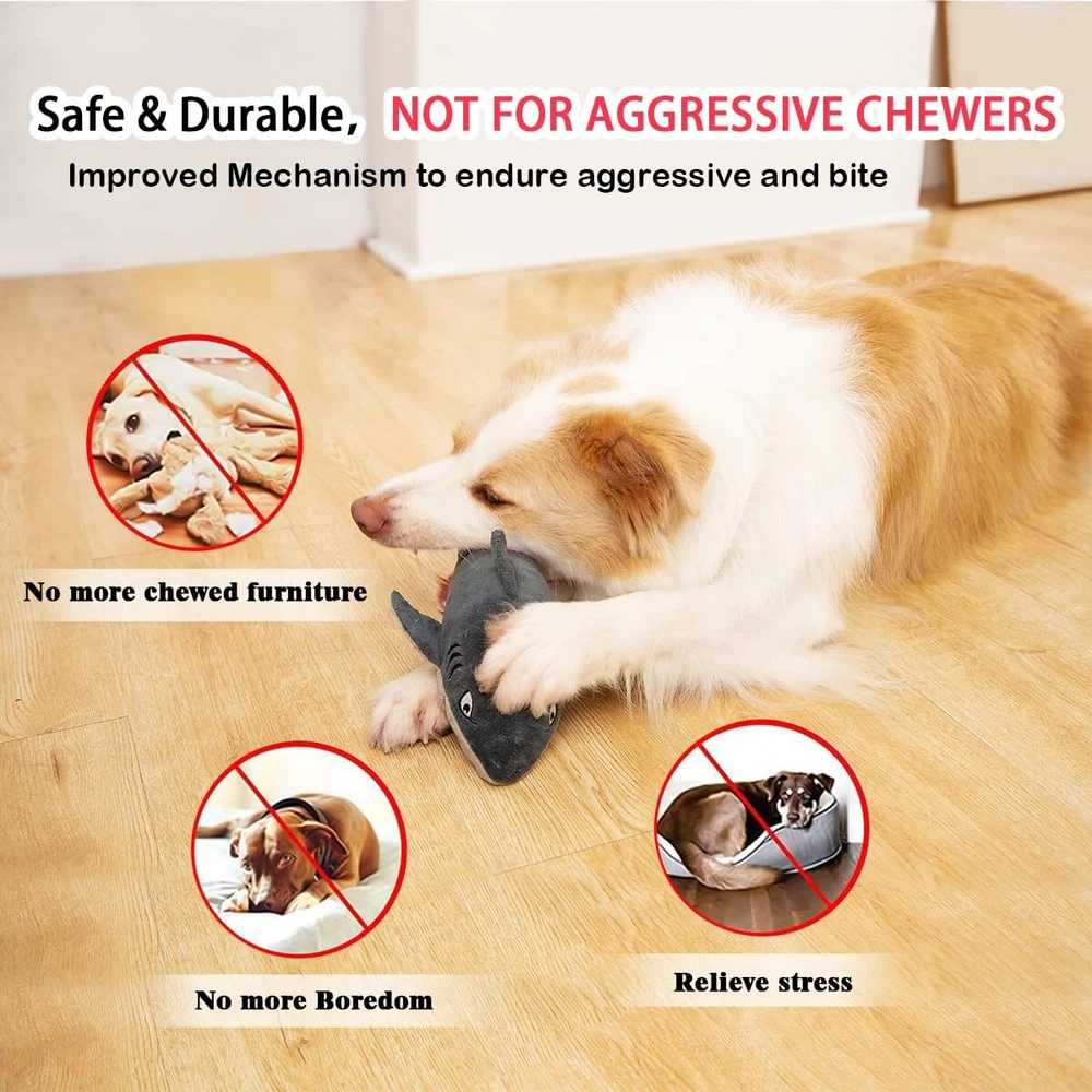 【Interactive Fun for Dogs and Puppies】The tail-wagging shark toy looks very realistic. Whenever your dog touches the toy, the automatic motion sensor activates, causing the plush shark toy to wiggle and entice your dog to chew and play. This toy is suitable for dogs of all sizes—small, medium, and large—helping to alleviate their boredom and loneliness when you're busy or away (but not recommended for dogs with extremely strong biting habits) 【Durable & Safe Materials】Goopow interactive dog toys are crafted from plush and natural cotton, ensuring safety for your dogs. The improved mechanism is designed to withstand chewing and biting, promoting teeth cleaning for your pet. Not Suitable for Aggressive Chewers 【Squeaky & Stimulating】This dog squeaky toy contains a built-in vocal bladder that produces sound when pets bite it. It's an excellent toy for stimulation and interactive training, enhancing the bond between you and your dogs and providing more enjoymen 【USB Rechargeable】This toy is rechargeable via USB, making it environmentally friendly and cost-effective by eliminating the need for battery replacements. The upgraded large-capacity battery ensures safe charging, requiring a 3-hour charge for a full day of use. A USB cable is included in the package, and the rechargeable motor can be detached for easy cleaning of the plush toy 【Easy to Use】To ensure ease of use, ensure the switch is off and facing the shark's belly during installation. Push the motor to the far end of the tail and press the mouth to seal the toy. Finally, turn on the switch and tap the toy to make its tail wiggle 【Top Quality & Fast Service】The Interactive Flopping Fish Dog Toy makes for a wonderful gift for your dogs or puppies, providing exercise and entertainment to help them burn off excess energy. If there are any issues with the toy, please us to receive a . We welcome all customers to share their feedback and user experiences