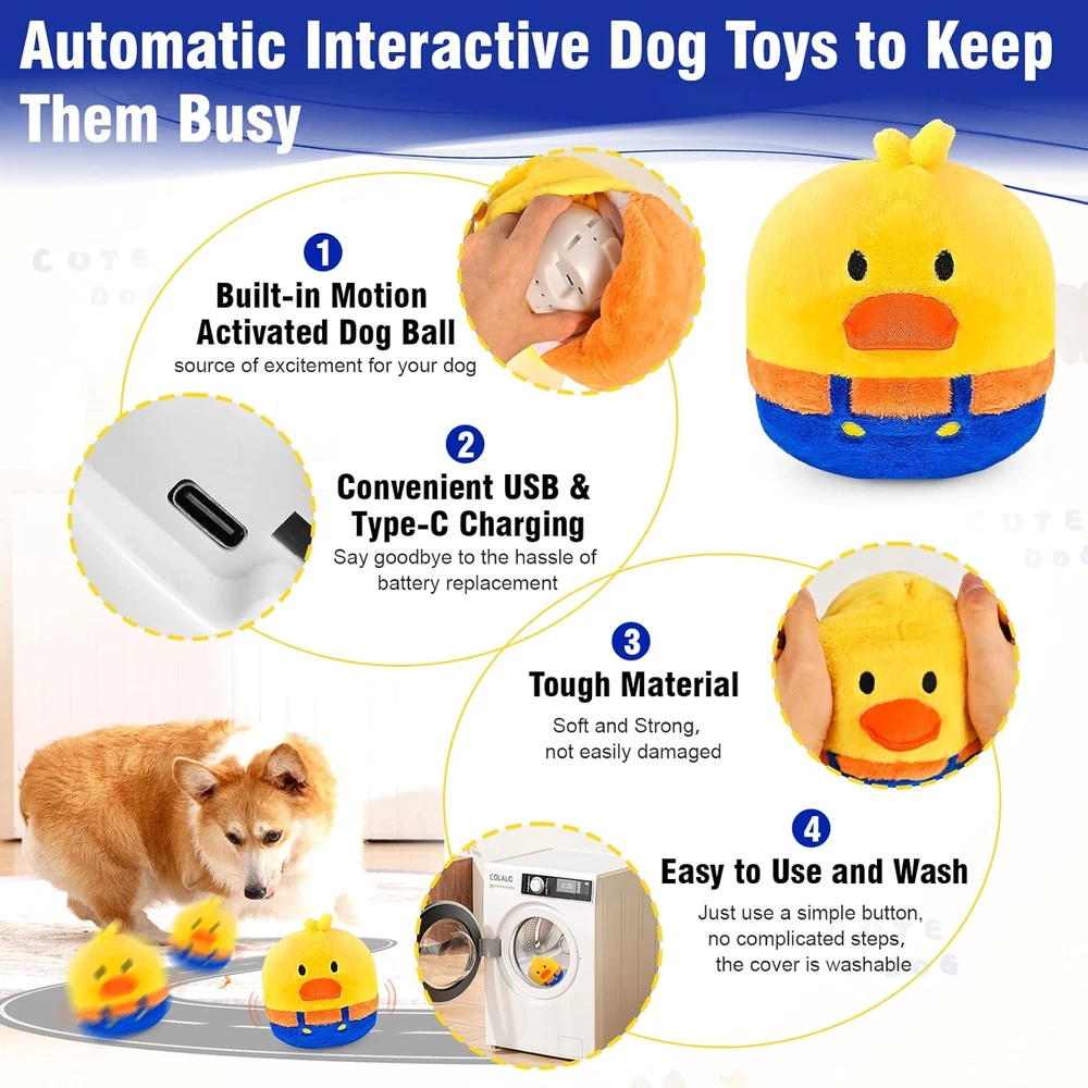 【Automatic Interactive Puppy Toys to Keep Them Busy】 Looking for ways to keep your furry friend occupied? Our active bouncing dog toy is specially curated to provide physical activity for small dogs, especially puppies. This motion activated toy for dogs is designed to challenge your dog's mind and keep them entertained, helping to alleviate boredom, anxiety and prevent destructive behavior. Say goodbye to restless pups and hello to hours of engaging playtime with our selection of busy toys for dogs. 【Rechargeable】 Say goodbye to the hassle of battery replacement. Our updated USB Type-C charging design allows for easy charging when this electric moving dog ball runs out of battery. *Please choose 5V/1A or 5V/2A adapter*. With a 500mAh battery capacity, just one hour of charging provides three hours of continuous dog playtime. By taking off the plush crinkle duck's cover and fully charging the dog ball, it will keep your dogs fun going without interruption. 【Motion Activated Dog Toy】Featuring a built-in motion & recording sensor, our automatic dog toy offers interactive fun for your furry friend. Simply press and hold the switch for 2 seconds to activate the vibrating ball, then, either you speak to it or your dog barks at it, it will automatically vibrate and repeat the sound. When the sound ceases, the vibration stops. However, if a new sound emerges, it will resume vibrating, bringing endless excitement and joy. Anyway, this interactive jumping ball for dog can attract more attention and bring more joy to your dogs. 【Easy to Use and Wash】 Our squeaky dog toy is designed for convenience. By pressing and holding the switch for 2 seconds, you can easily turn the moving dog toy on or off, making it effortless for dog owners to entertain their pets. Plus, the plush duck cover is washable, ensuring easy maintenance. Simply open the plush cover's Velcro fastener, take out the bounce ball, wash and let it dry for hours of fresh, clean play. 【Banish Boredom, Not for Aggressive Chewers】Say goodbye to boredom and hello to endless entertainment with our innovation of interactive puppy toys for small dogs. This cute duck cover electronic dog toy is designed to stimulate your dog's mind and provide hours of engaging play. Whether your pup prefers solo play or interactive sessions with their favorite human, these active moving dog toy is sure to banish boredom and keep tails wagging and busy. Product Description Interactive Puppy Toy to Keep Them Busy, The Best Canine Companion For Your Dog! Press the Switch and Hold it for 2 seconds, Then Speak or Bark at This Toy! Our updated USB charging design allows for easy charging when this electric moving ball runs out of battery. Please choose 5V/1A or 5V/2A adapter Please remember, press the switch and hold it for 2 seconds to activate this dog toy, then speak or bark at it, this ball will vibrate. Much Safer with Our Velcro Design! How to Start and Play with Our Cute and Crazy Dog Toy? - Remember to press the switch and hold it for two seconds when you want to activate this built-in ball - Next, you can speak to this ball or pat the ball to trigger the repeat sensor in the ball - Our Velcro design is MUCH safer for dogs, it does not have the risk of being eaten by dogs like other zipper designs The video showcases the product in use. The video guides you through product setup. The video compares multiple products. The video shows the product being unpacked. Attract More Attention and Bring More Joy to Your Babies! Whether your pup prefers solo play or interactive sessions with their favorite human, these active moving dog toy is sure to banish boredom and keep tails wagging and busy. Keep Your Puppies Occupied! VYsTN Electronic Interactive Puppy Toys to Keep Them Busy for Hours! Looking for ways to keep your furry friend occupied? Our active bouncing puppy toy is specially curated to provide mental stimulation and physical activity for dogs of all ages and sizes. Featuring a built-in motion & recording sensor, our automatic dog toy offers interactive fun for your furry friend. Attractive Idea for Dog Birthdays, Special Holidays Such As Christmas, etc.