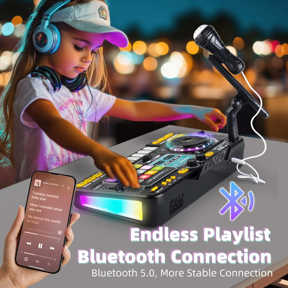 Kids DJ Mixer Table Age 3 4 5 6 7 8, Kids Music Toys with Piano Keys, DJ Turntable, Reaction Music Games, and Bluetooth - Kids Musical instruments Gifts for Boys Girls for Birthday, Christmas, Halloween, New Year Features: This DJ table toy features fun sound effects, music tracks, and multiple interactive modes, including Piano Keys, DJ Turntable, Microphone, Reaction Music Games, and over 100 sound effects. This kids DJ mixer table toy is designed to inspire creativity and encourage self-expression. Ideal for children ages 3-8, it is the perfect tool for nurturing young musical talents. This DJ music toy supports Bluetooth connectivity, allowing children to play their favorite songs or music through a wireless connection, offering a wider range of music options. This DJ musical instrument is an ideal gift for boys girls toys age 3 4 5 6 7 8 9, making it perfect for birthdays, holidays, Christmas, Thanksgiving, and New Year. Specifications: Material: non-toxic ABS plastic Package Including: 1 x DJ table toy 1 x Microphone 1 x Holder 1 x Manual 1 x Gift Box Note: 1. The color may exist a slight difference due to different screen displays. 【The Perfect Musical DJ Toy for Kids】This DJ table toy features fun sound effects, music tracks, and multiple interactive modes, including Piano Keys, DJ Turntable, Microphone, Reaction Music Games, and over 100 sound effects. Vibrant lights and exciting sound combinations create an immersive experience, offering a fun environment where children can explore their musical interests and creativity. 【Inspire Creativity and Rhythm】This kids DJ mixer table toy is designed to inspire creativity and encourage self-expression. Equipped with a microphone and holder, it allows kids to engage in musical creation and performance, fostering their creativity. The unique Reaction Music Game helps develop hand-eye coordination and a sense of timing. Ideal for children ages 3-8, it is the perfect tool for nurturing young musical talents. 【Easy Charging, Long-lasting Fun】This kids music toy features USB charging with an included cable for efficient power replenishment. Its automatic shut-off function ensures safety and energy efficiency during play. Made from non-toxic ABS plastic, free of BPA and lead, it provides a safe and enjoyable experience for kids. 【Bluetooth Connectivity for Customized Music】This DJ music toy supports Bluetooth connectivity, allowing children to play their favorite songs or music through a wireless connection, offering a wider range of music options. While connected, the piano key sounds are temporarily disabled, creating a more focused listening environment. 【The Perfect Gift for Young Musicians】This DJ musical instrument is an ideal gift for boys girls toys age 3 4 5 6 7 8 9, making it perfect for birthdays, holidays, Christmas, Thanksgiving, and New Year. It nurtures children’s interest in music while encouraging creative expression through play. Designed to spark musical curiosity, this toy offers a fun and engaging way for children to develop their musical talents and imagination.