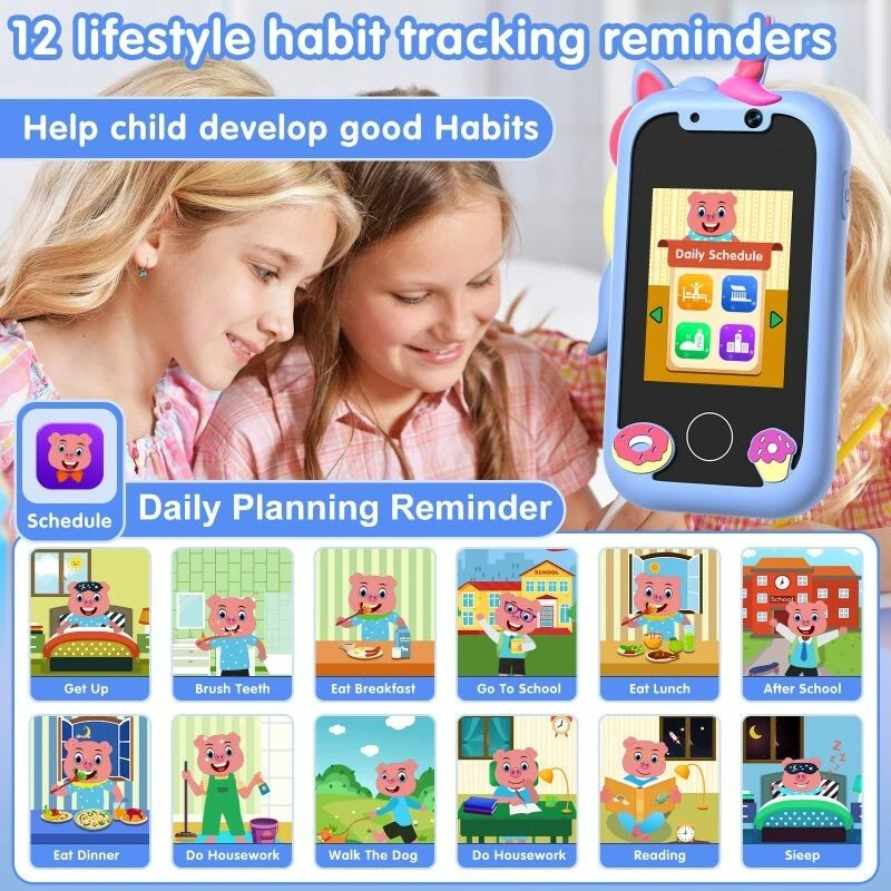 Specifications: [ Multifunctional Kids Smart Phone ] - 2.4" Touchscreen kids phone rich features, easy to use. Wide range of entertainment and learning options, such as 8 puzzle games, music, etc, and equipped with useful gadgets that children need, such as recorder, calculator, calendar, alarm clock, torch, countdown timer, stopwatch, etc. Kids toy cell phones, all in entertainment and learning, are designed for kids aged 3-10years old. [ Joy and Relaxation Time ] - Kids toys phone has 8 fun puzzle games, it can help children relax and release stress, exercising their logical thinking, reaction skills, and hand-eye coordination. Graffiti painting function can let children give full play to their imagination and creativity. Kids smartphone built-in 5 fun stories, high-quality MP3 music player, make child enjoy music on the go. [ Dual Camera Recording Good Times ] - kids smartphones support dual cameras to take pictures and video recording, just like a real smartphone, and quickly switch between front and rear, easy selfies. With 18 cute stickers. Kids choose their favorite stickers to take photos and record the beautiful moments and interesting experiences in their lives with family or friends. To prevent the loss, kids phone for girls boys comes with a durable lanyard for easy carrying. [ Great Gifts for Girls Boys ] - Kids play phones, the touch screen is sensitive, and han 32 styles of wallpaper and 19 desktop background wallpapers to choose from. Comes with a cute pattern design silicone phone case, it can be drop-proof and more durable. Small and exquisite phone, easy to carry, with a 800mAh battery, it offers more usage time. This fake phone is a popular kids toy for girls boys age 3-10, the great surprise Christmas birthday travel gift for kids. Specifications: Material: ABS+PC Memory: 512MB Display: 2. 4 inch touch screen Interface Charging port: TYPE-C Battery Capacity: 8 00mA Time: year, month, 24 hours