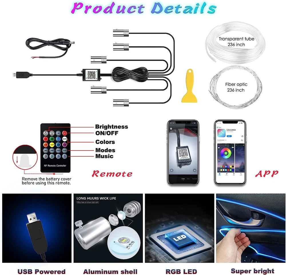 Interior Car LED Strip Lights with Wireless APP and Remote Control, RGB 5 in 1 A