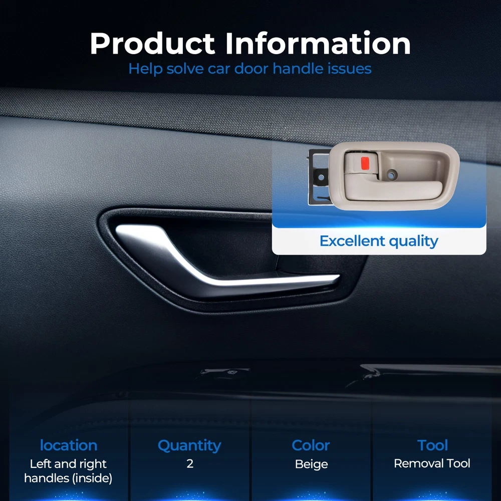 About Us Upgrade your vehicle with the Carcaremax Car Door Handle. Crafted for durability, this handle is built to withstand daily wear and tear, ensuring it maintains its sleek look for years to come. Installation is a breeze, meaning you can enjoy new handles without the hassle of complicated tools. Say goodbye to scratches, as our scratch-resistant design keeps your handles looking fresh and clean. Whether you are replacing worn-out handles or simply want to enhance your car’s appearance, the Carcaremax Car Door Handle is the perfect choice. Designed to fit most vehicles, it offers a seamless upgrade that combines style and functionality. Make your car stand out while ensuring top-notch performance with the Carcaremax Car Door Handle today! About Us Compatible with: 2000 Toyota Tundra all Submodel 2001 Toyota Tundra all Submodel 2002 Toyota Tundra all Submodel 2003 Toyota Tundra all Submodel 2004 Toyota Tundra Base Standard Cab Pickup-2 door 2004 Toyota Tundra Limited Extended Cab Pickup 2004 Toyota Tundra SR5 Extended Cab Pickup-4 door 2004 Toyota Tundra SR5 Standard Cab Pickup 2005 Toyota Tundra Base Standard Cab Pickup-2 door 2005 Toyota Tundra Limited Extended Cab Pickup-4 door 2005 Toyota Tundra SR5 Extended Cab Pickup-4 door 2006 Toyota Tundra Base Standard Cab Pickup-2 door 2006 Toyota Tundra Limited Extended Cab Pickup-4 door 2006 Toyota Tundra SR5 Extended Cab Pickup-4 door About Us Our products come with 1-year-warranty, ensuring that there will be no defects in materials and workmanship under normal use. We do our best to hear from customers and update our products. If you have more problems, please be free to contact us.