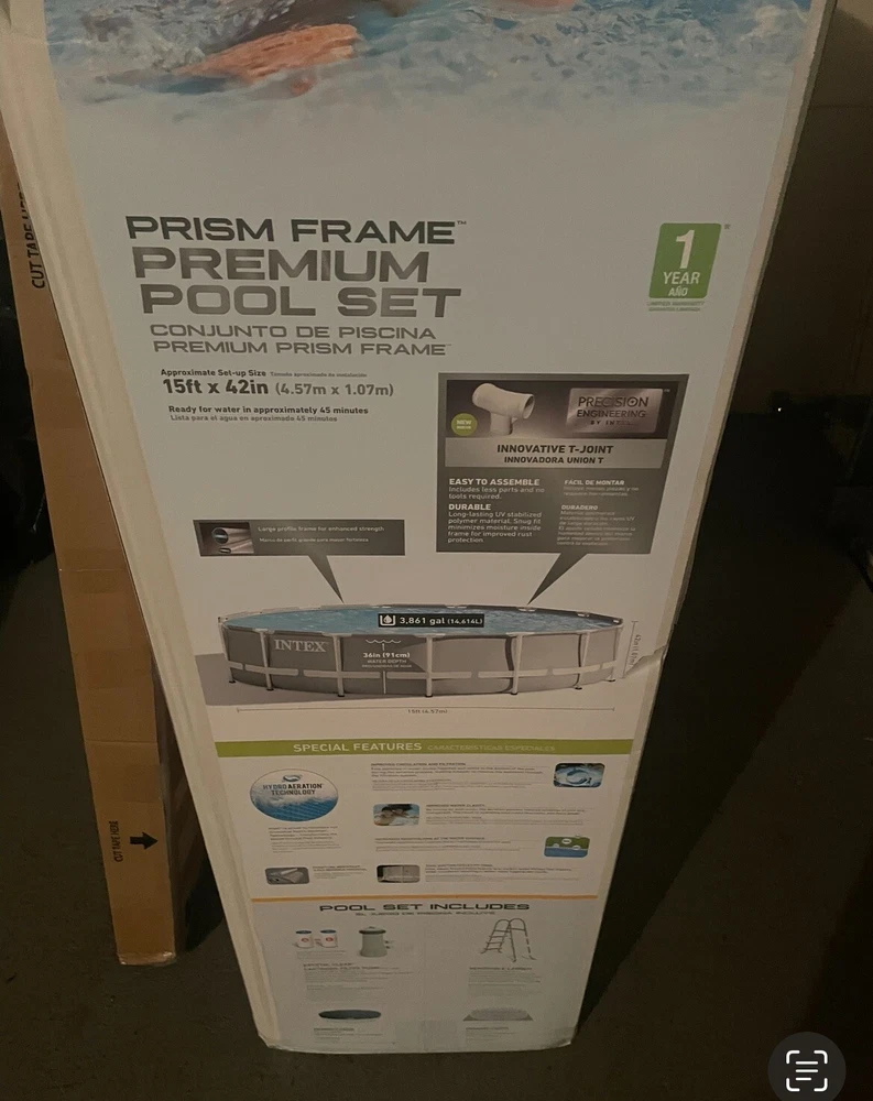 Color: Gray Brand: Intex Item Height: 42 in Capacity: 3600 gal Shape: Round Type: Frame Pool Country/Region of Manufacture: Unknown Set Includes: Filter Pump System, Frame, Full Instructions, Ground Protection Mat, Ladder MPN: 26723EH Item Diameter: 48 in Model: 26723EH Material: Polymer, Steel, Vinyl