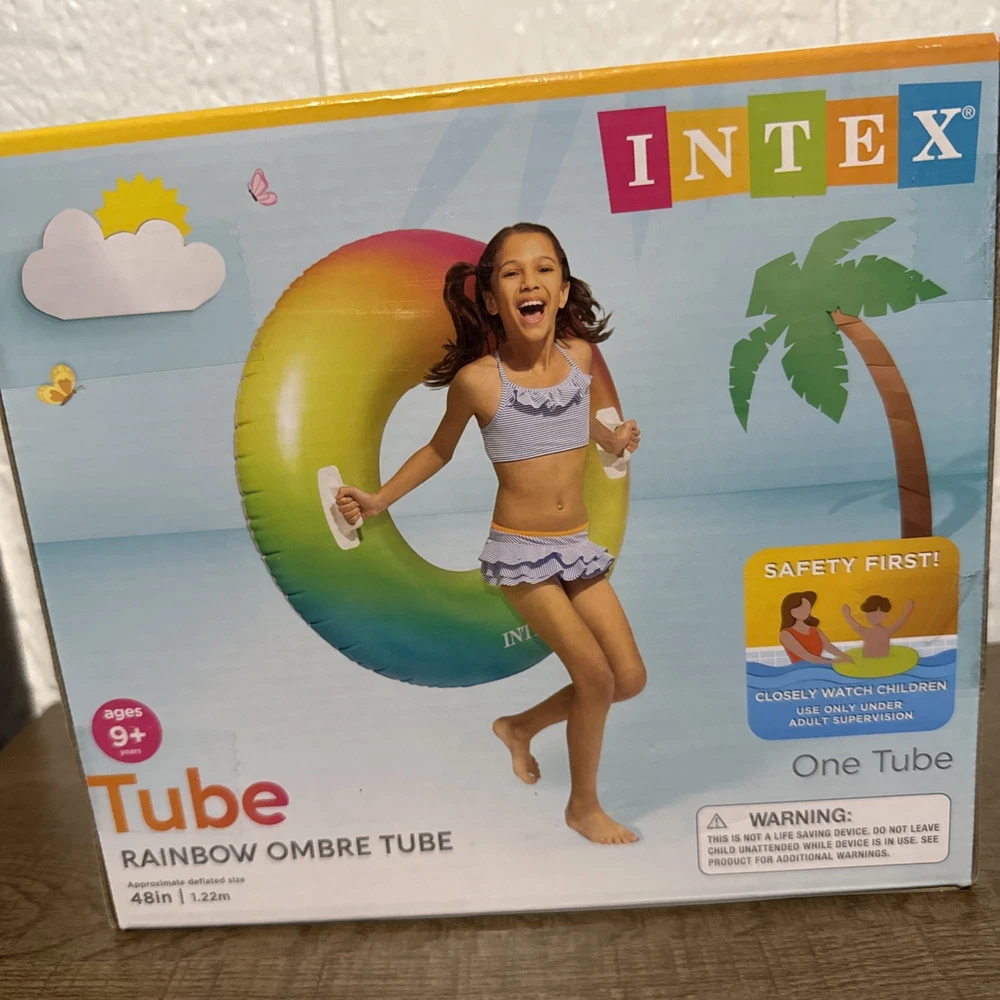 The Intex Color Whirl Rainbow Ombre Swimming Pool Float Tube is a vibrant and fun inflatable ride on designed for ages 9 and up. This multicolor ring-shaped float features a handle for easy maneuvering in the pool. With a recommended age range of 9 to 16 years and 17 years & up, this float tube is perfect for older kids to enjoy a day of splashing and relaxing in the water. Made by trusted brand Intex, this pool float is sure to provide hours of entertainment for teenagers and adults alike. Approximately 48 inches diameter.