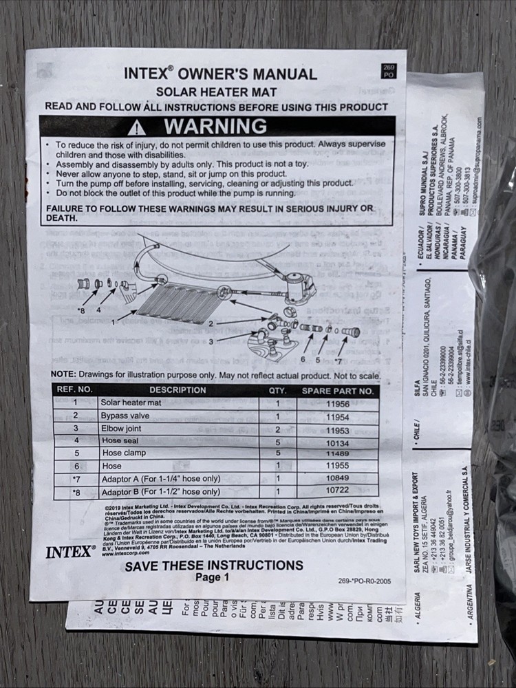 Enhance your swimming season with the Intex Solar Heater Mat, designed for above-ground pools. This open-box item is unused and includes all original components per the owner’s manual: Includes: • 1x Solar heater mat • 1x Bypass valve • 2x Elbow joints • 5x Hose seals • 5x Hose clamps • 1x Hose (black ribbed) • 1x Adaptor A (1¼” hose) • 1x Adaptor B (1½” hose) • Instruction manual Condition: • Open box, unused • All parts verified and included Perfect for extending your swim season by warming pool water naturally using the sun’s energy. Shipping: • Fast shipping with tracking included