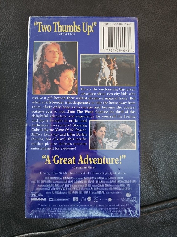 The "Into the West" VHS tape from 1994 is a sealed, brand new video featuring an action-packed story directed by Mike Newell. The film, rated G, stars Ellen Barkin in a leading role, making it a must-have for fans of adventure movies. This NTSC format VHS tape offers viewers the chance to enjoy this classic film in the comfort of their own homes, providing hours of entertainment for the whole family.