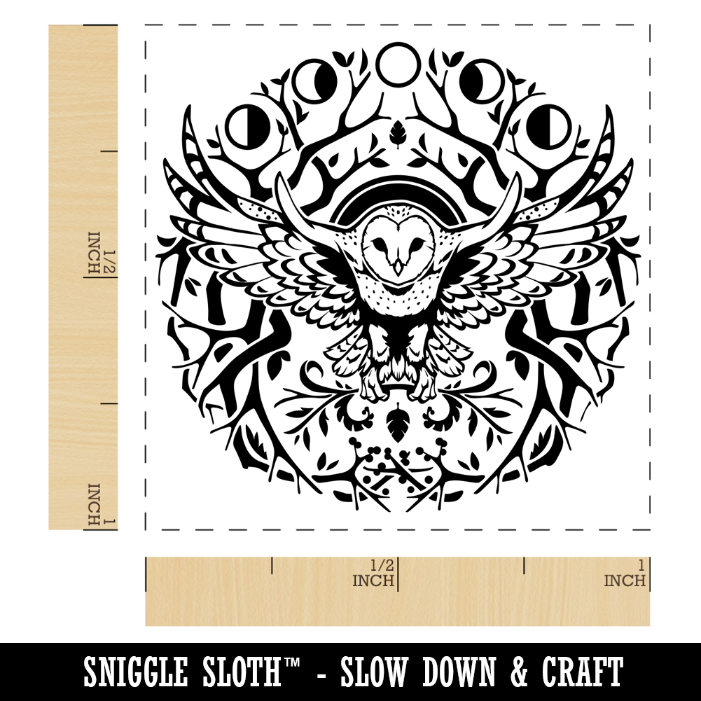 Intricate Barn Owl Wreath Branches Moon Phases Self-Inking Rubber Stamp Stamper