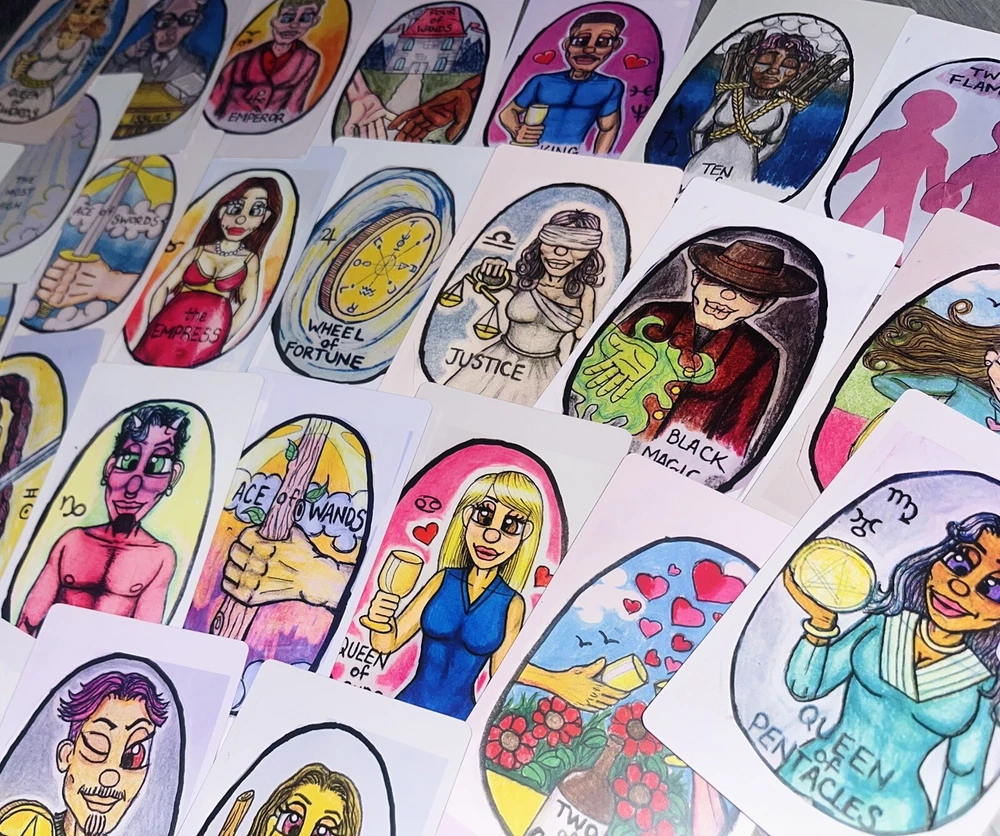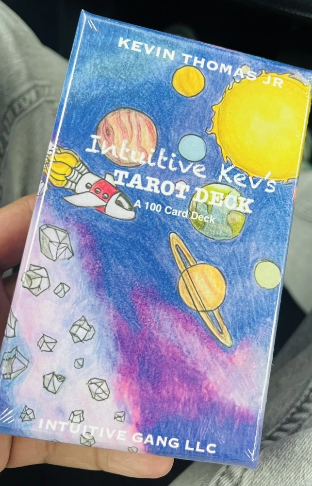 Intuitive Kev’s Tarot deck. Intuitive Kev’s Tarot Deck is a 100 card deck which includes the 78 traditional Tarot cards(Major/Minor arcana) and 22 Additional cards(Oracle), all illustrated by me (Kevin Thomas Jr) from 2022-2024. The creation of this deck was initially a hobby, that aided in transmuting negative energies early in my journey. Each card(and the box)is hand drawn and colored. Aside from the Gold gilding, I’ve added no fancy embellishments. These are exact copies of the original drawings; Flawed and Imperfect. Authentic and Original. And Im happy to share them with you 🙏❤️ -Kev