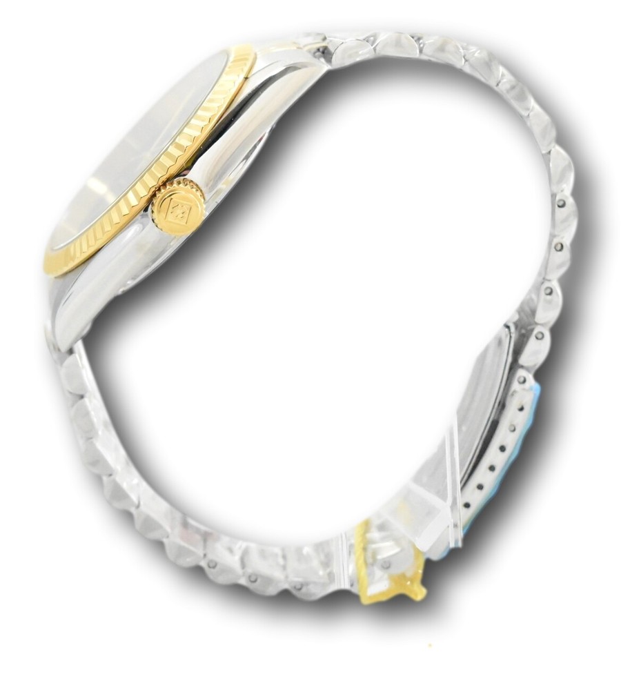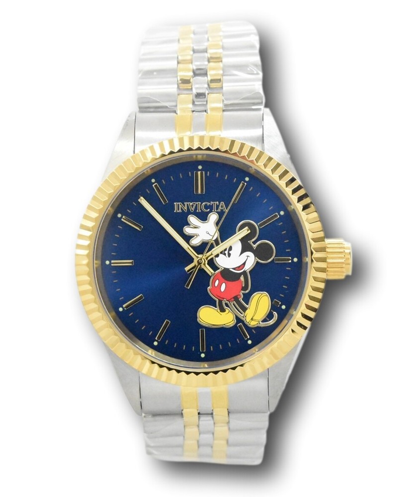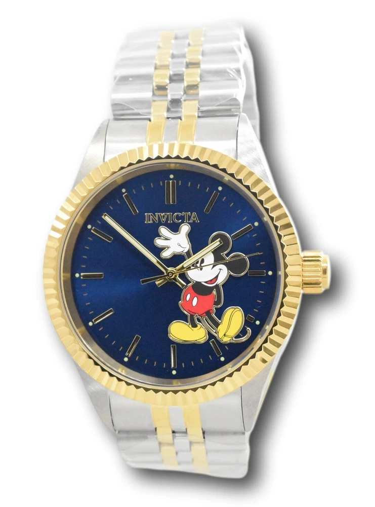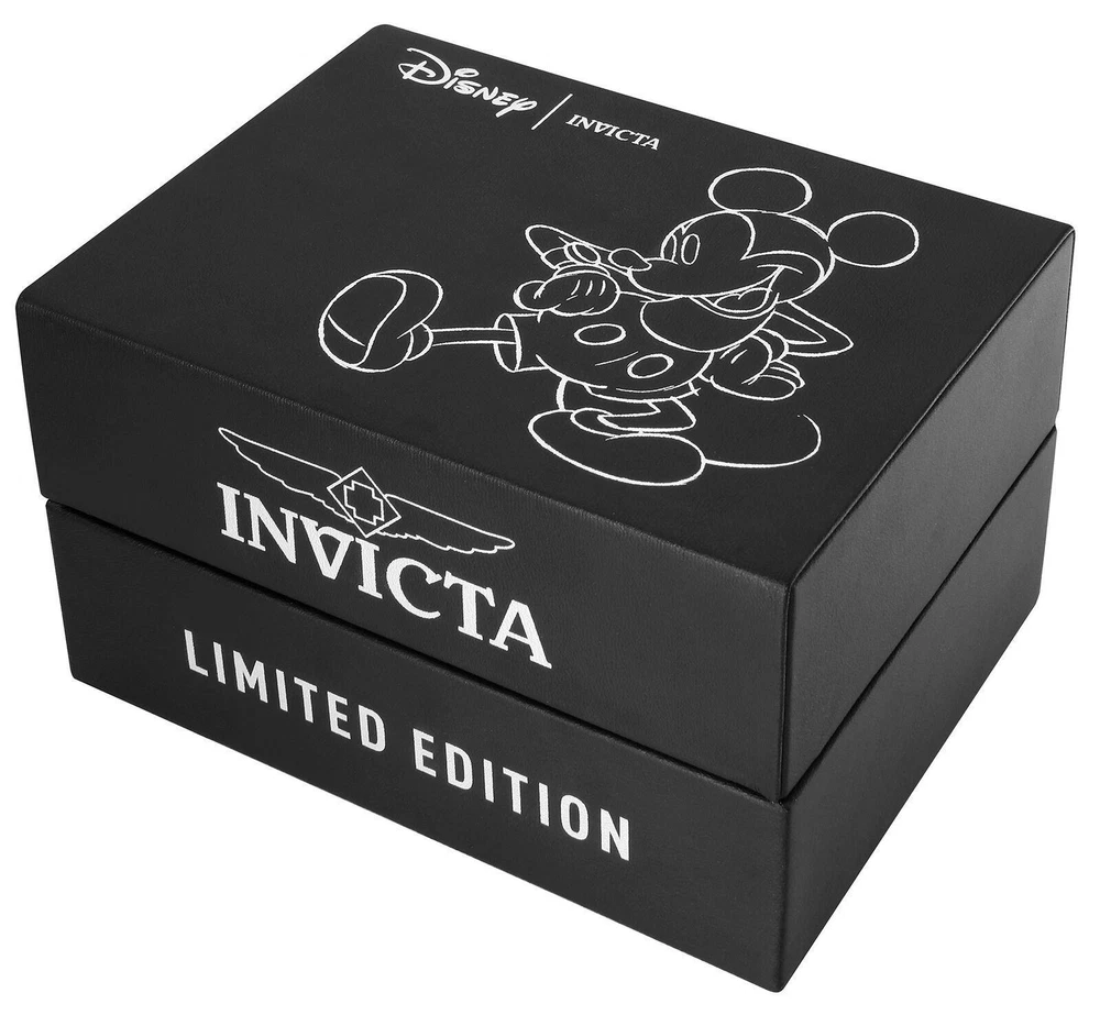New - With Tags New and Unworn - Guaranteed Authentic - Includes Black Invicta Disney box and warranty info 100% Functional - Guaranteed Authentic Case size: 43mm or about 47mm wide including the crown Thickness: 11mm Weight: 4.4 ounces Items included: Black Invicta Disney Box and warranty card Max wrist size: 8.25 Inches Case and Dial Case Size: 43mm Case Material: Stainless Steel Bezel Material: Stainless Steel Bezel Color: None Crown Type: Push Crystal Type: Mineral Dial Material: Metal Movement Caliber: PC21J Function Type: Quartz Water Resistance Water Resistance: 50m Band Material: Stainless Steel Tone: Steel, Gold Length: 205mm Size: 22mm