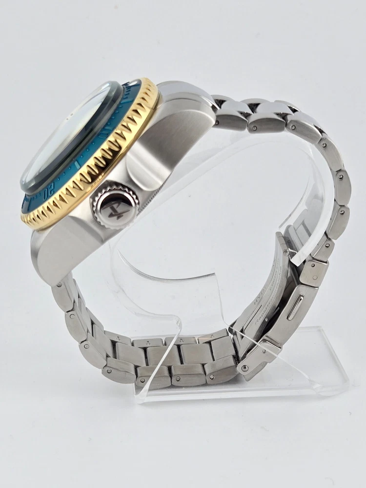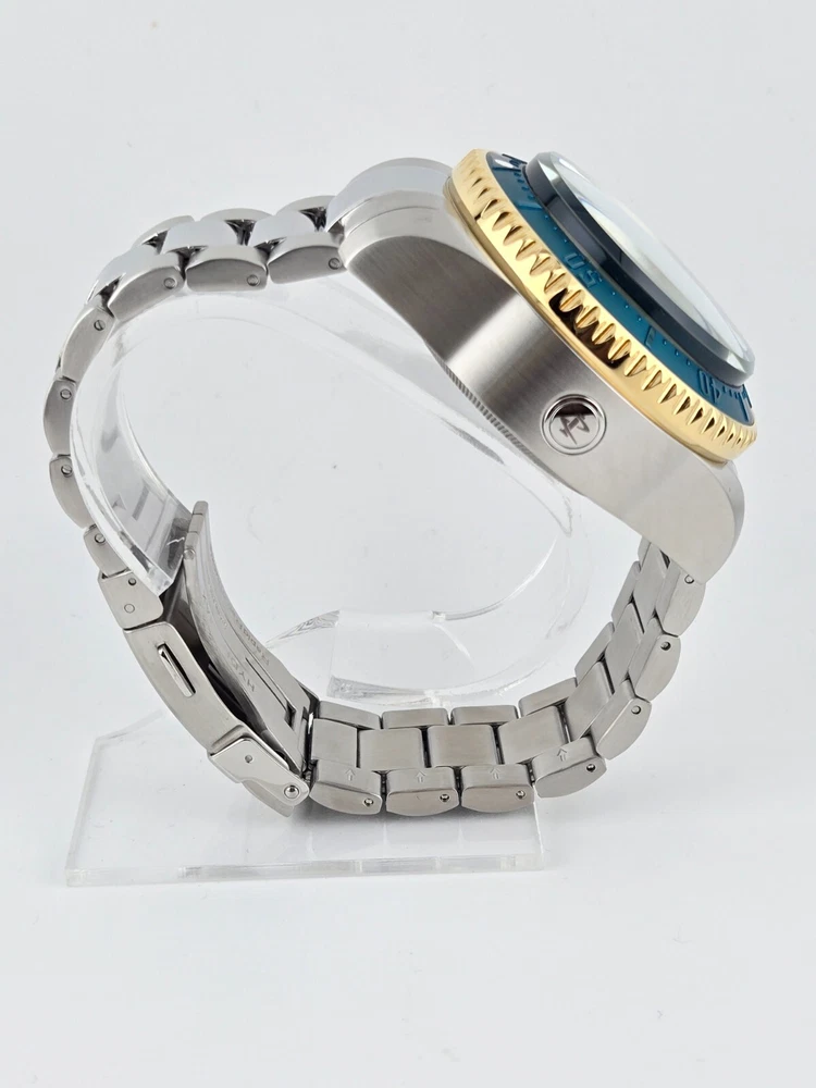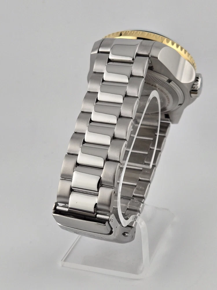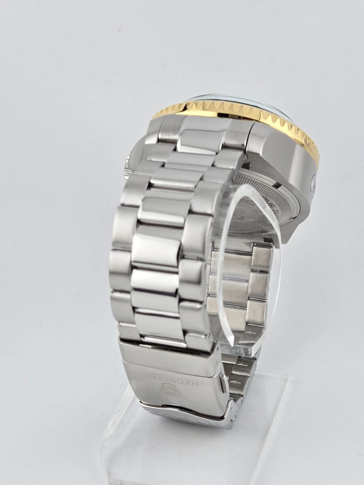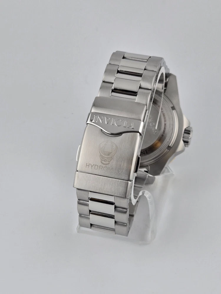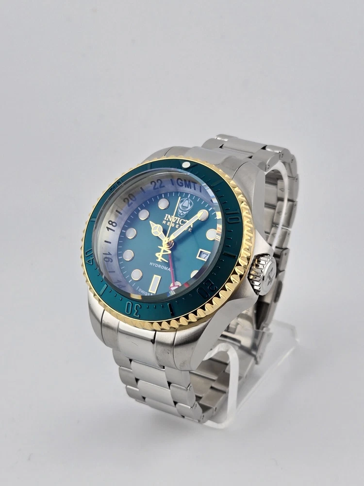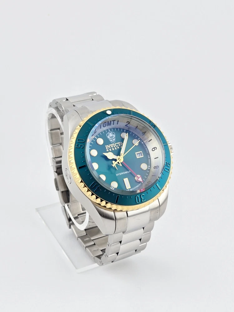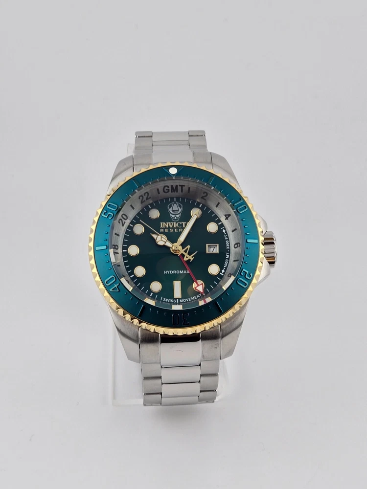 Invicta Men’s Hydromax Green Dial Stainless Steel Watch - 45475 ($1495 MSRP) New with Gift Box and Tags! This watch is a Shelf Pull from one of the Major Department Stores. May find few micro scratches on the watch case/band, visible under a direct and strong light. Introducing the Invicta Men’s Hydromax Green Dial Stainless Steel Watch (45475), a bold and versatile timepiece designed for those who value both style and functionality. Featuring a striking silver-tone case accented with green and gold elements, this watch is complemented by a durable silver-tone stainless steel bracelet. The uni-directional rotating bezel, designed in a captivating green and gold two-tone, enhances the watch’s aesthetic while providing practical features for diving and outdoor activities. The eye-catching green dial is adorned with gold-tone hour markers, and a GMT scale around the outer rim, allowing you to effortlessly track a second time zone. Luminescent hands and markers ensure readability in low-light conditions, while the date display at the 3 o'clock position adds practicality to this sophisticated design. Powered by the reliable Ronda Caliber 515.24H quartz movement, this watch guarantees precise timekeeping for all your adventures. Built for durability, the Hydromax is engineered to withstand extreme conditions with an impressive water resistance of up to 1000 meters (3300 feet). The scratch-resistant Flame Fusion crystal protects the watch from everyday wear, while the secure screw-down crown and solid case back provide additional reliability. With a substantial 52mm case size and a comfortable 24mm band width, the Invicta Hydromax seamlessly combines ruggedness with refined elegance, making it an essential addition to any watch collection. Features Silver-tone and green and gold stainless steel case with a silver-tone stainless steel bracelet. Uni-directional rotating two-tone (green and gold) stainless steel bezel. Green dial with gold-tone hands and index hour markers. Gmt scale around the outer rim. Dial Type: Analog. Luminescent hands and markers. Date display at the 3 o'clock position. Ronda Caliber 515.24H quartz movement. Scratch resistant Flame Fusion crystal. Screw down crown. Solid case back. Round case shape, case size: 52 mm, case thickness: 29.5 mm. Band width: 24 mm, band length: 8.25 inches. Fold over safety clasp. Water resistant at 1000 meters / 3300 feet. Functions: date, GMT, second time zone, hour, minute, second. Fast and Free Shipping You're already purchasing the item. Why pay additional for shipping, especially slow shipping? We get your order shipped out within 1-business day and delivered to your doorstep as quickly as possible. Competitive Pricing With our dynamic pricing model, our prices are always competitive. Our prices are some of the lowest that you will find on the internet. Rest assured that you're getting a good deal when purchasing with us. 30-day Money Back Guarantee We are committed to making sure that you leave this transaction satisfied. If you're unhappy with the product for any reason, you may return it back for your money-back or a replacement within 30 days. No questions asked!