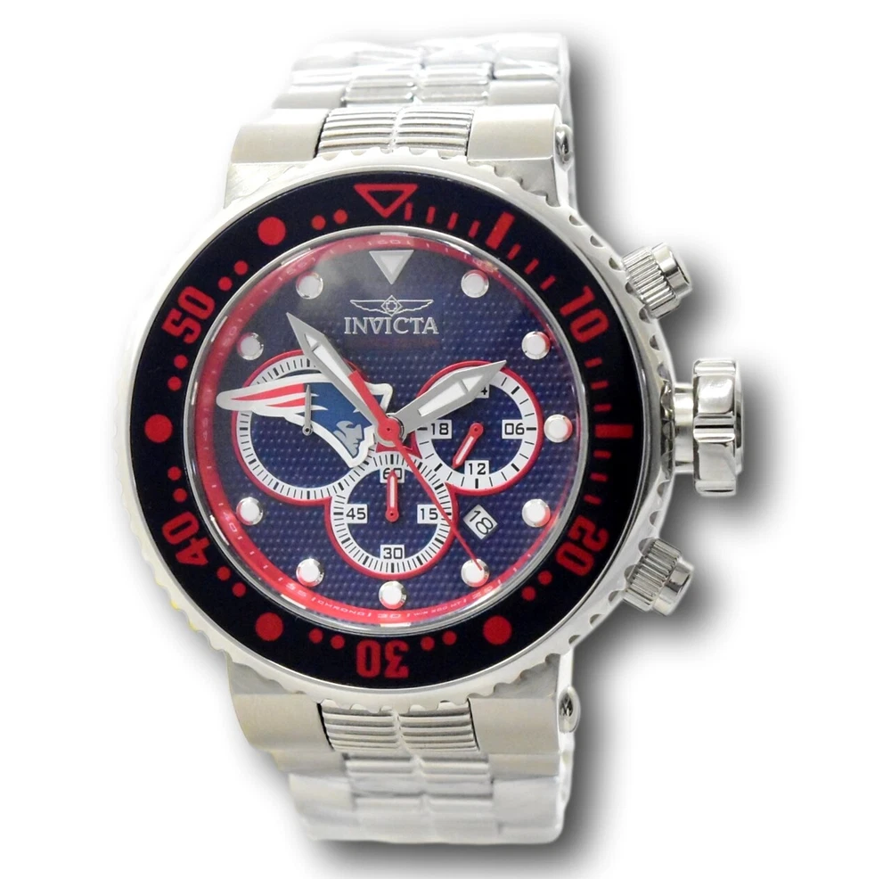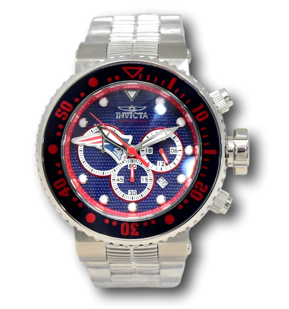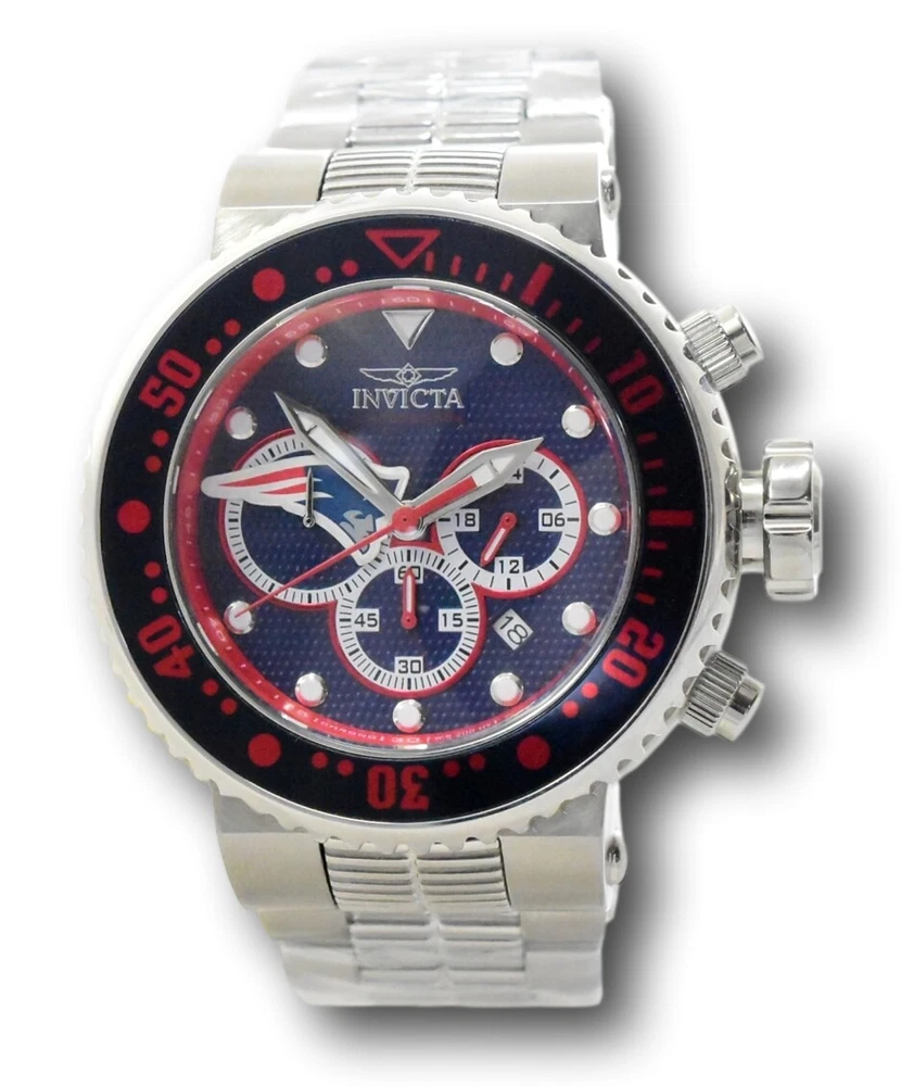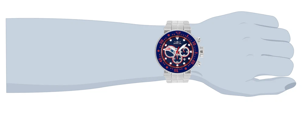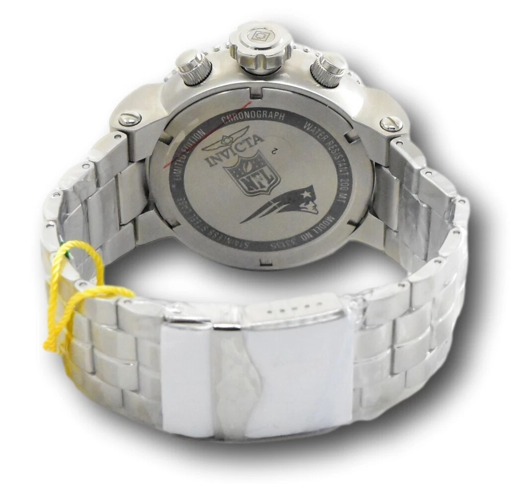 New - With Tags New and Unworn - Guaranteed Authentic - Includes Blue Invicta NFL Box and Warranty Card 100% Functional - This listing includes pictures of the actual watches for sale - This watch has a Thick case - watch is about 20mm thick - please view side pictures of the watch - watch is about 52mm wide or about 56.5 mm wide including the crown - watch weighs about 11.4 ounces Please see watch listing for actual pictures of the watch and colors of the dial - Case size: 52mm wide or about 57 mm wide including the crown Thickness: 20mm Weight: 10.9 ounces Items included: Blue Invicta NFL Box and Warranty Card Max wrist size: 8.0 Inches Case and Dial Case Size: 52mm Case Material: Stainless Steel, Aluminum Bezel Material: Stainless Steel, Aluminum Bezel Color: Steel, Navy Blue, Red Crown Type: Screw Down Crystal Type: Mineral Dial Material: Metal Movement Caliber: VD53 Function Type: Quartz Water Resistance Water Resistance: 200m Band Material: Stainless Steel Tone: Steel Length: 210mm Size: 29.8mm Top Selling Disney Super Hero Star Wars New in Stcok TechnoMarine Contact Us Invicta NFL New England Patriots Grand Diver Men's 52mm Chronograph Watch 33135 New - With Tags New and Unworn - Guaranteed Authentic - Includes Blue Invicta NFL Box and Warranty Card 100% Functional - This listing includes pictures of the actual watches for sale - This watch has a Thick case - watch is about 20mm thick - please view side pictures of the watch - watch is about 52mm wide or about 56.5 mm wide including the crown - watch weighs about 11.4 ounces Please see watch listing for actual pictures of the watch and colors of the dial - Case size: 52mm wide or about 57 mm wide including the crown Thickness: 20mm Weight: 10.9 ounces Items included: Blue Invicta NFL Box and Warranty Card Max wrist size: 8.0 Inches Case and Dial Case Size: 52mm Case Material: Stainless Steel, Aluminum Bezel Material: Stainless Steel, Aluminum Bezel Color: Steel, Navy Blue, Red Crown Type: Screw Down Crystal Type: Mineral Dial Material: Metal Movement Caliber: VD53 Function Type: Quartz Water Resistance Water Resistance: 200m Band Material: Stainless Steel Tone: Steel Length: 210mm Size: 29.8mm This item includes a 100% Money-Back Guarantee! If you're not completely satisfied with your purchase, just send it back in the same condition within 60 days and we will refund the full purchase price of the item. We'll even cover the return shipping! (Only applies to USA orders). Please Note: We do not cover water damage for watches. We do not test or verify manufacturer's water resistance claims. Please use your watch in water at your own risk. To receive free return shipping: Next to this item in your ebay purchase history, click on "Return this item." Please choose "Changed-mind" as the reason for the return. This will allow you to print a pre-paid return shipping label. - Klawk Watches - We have been in business for over 8 years, with more than 25,000 customers from around the world. We specialize in Invicta watches and have many models that can't be found anywhere else. We have some of the lowest prices - and you won't find better customer service. We try to provide the best customer service possible. We hand-inspect each watch and test them to make sure they are completely functional before shipping them out. We also include a no-hassle 60-day warranty on all of our watches (this warranty only covers defects in the watch movement). Our 60-day warranty does not cover any damage from water or moisture. Neither Klawkwatches nor any manufacturer covers water damage under warranty. Use your watch in water at your own risk. We're happy to help! If you have any questions, Please let us know and we will get back to you within 24 hours. Shipping Returns Shipping Shipping Returns Shipping Orders are shipped daily. We generally ship items within 24 hours of receiving payment. We offer standard, Prioirty, and overnight shipping services. You can upgrade your shipping speed at checkout for the difference in shipping costs. Unless a shipping upgrade is purchased, items will generally ship as a First Class Package, the normal arrival time is 3-5 business days starting the day after the item is shipped. We do all of our international shipping through the eBay global shipping program. We ship the item to the eBay global shipping center and they will ship the item to you. eBay determines the international shipping costs and import fees for the item based on the item weight and your location. International shipments can take between 2-4 weeks to arrive depending on your location. Shipping Returns Returns Shipping Returns Returns If you're not completely satisfied with your purchase, you are welcome to return it within 60 days for a full refund. We will generally cover the return shipping costs if you are not satisfied with your purchase. Next to the item in your purchase history, you can click on "More Options" and "Return this item". This will allow you to print a pre-paid return shipping label. For international orders and returns, please contact us to make return arrangements.