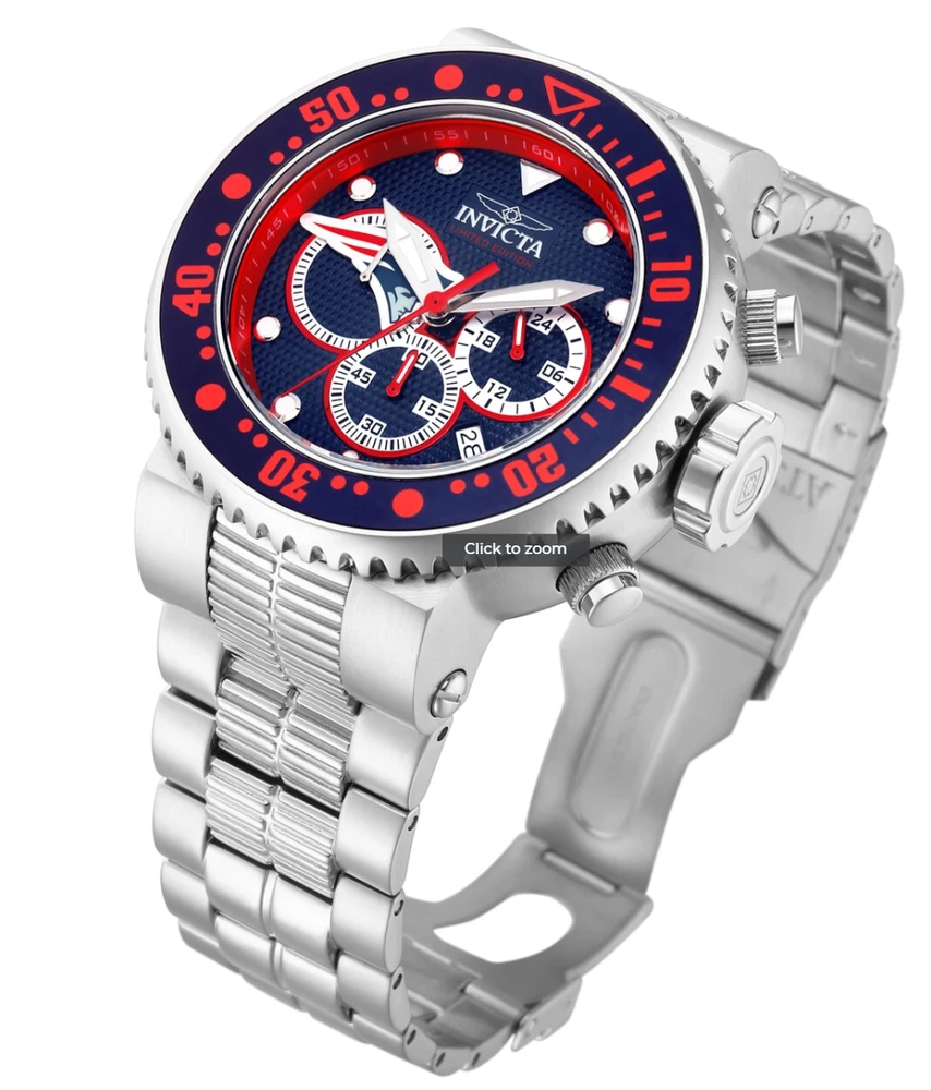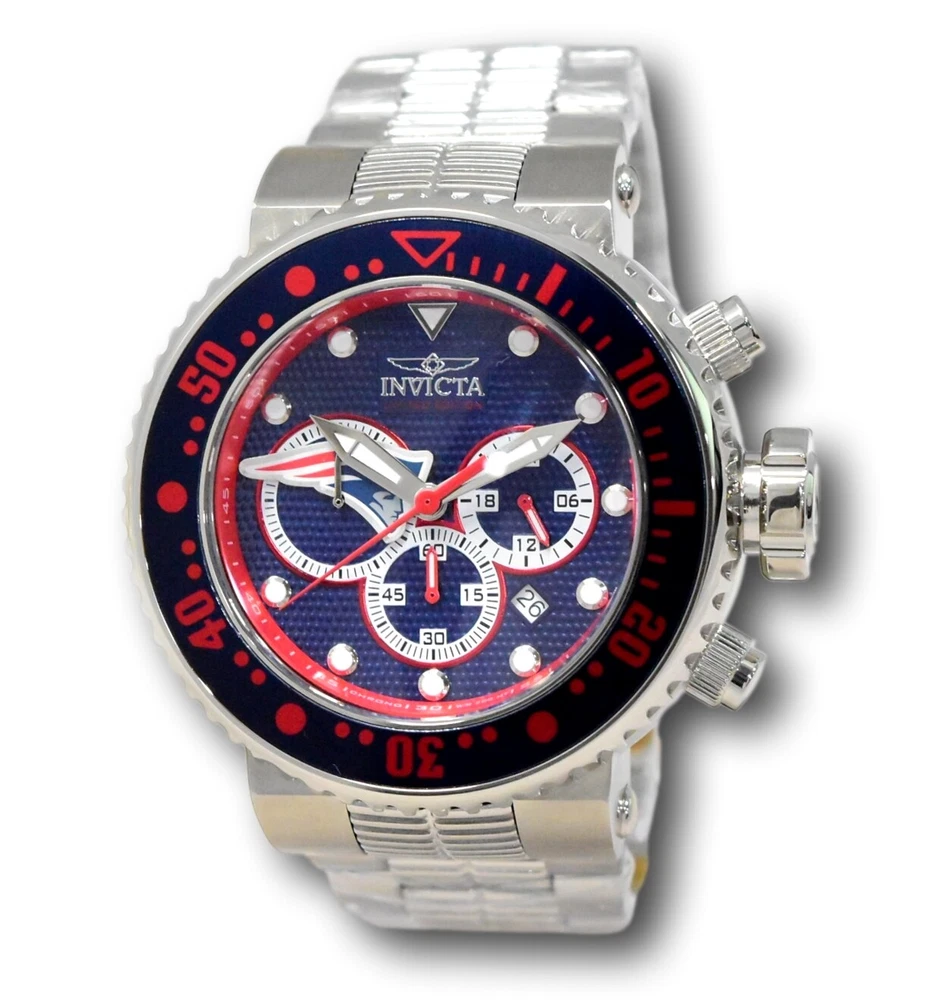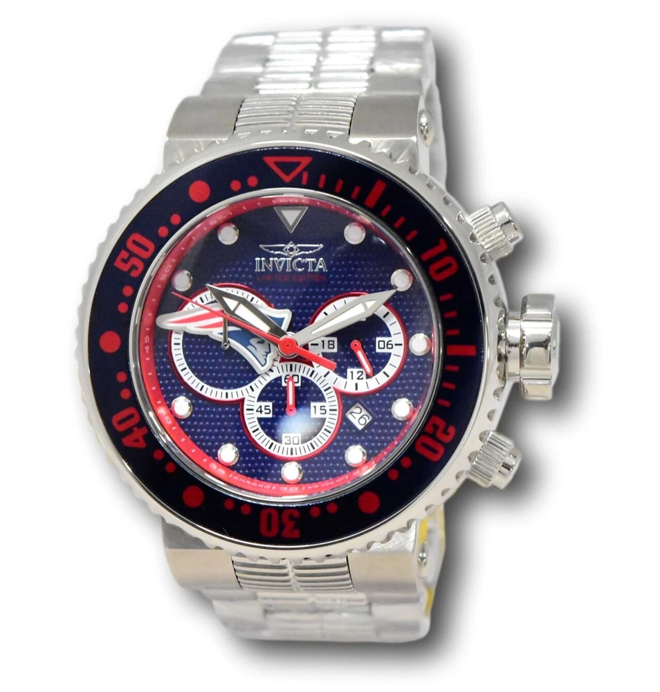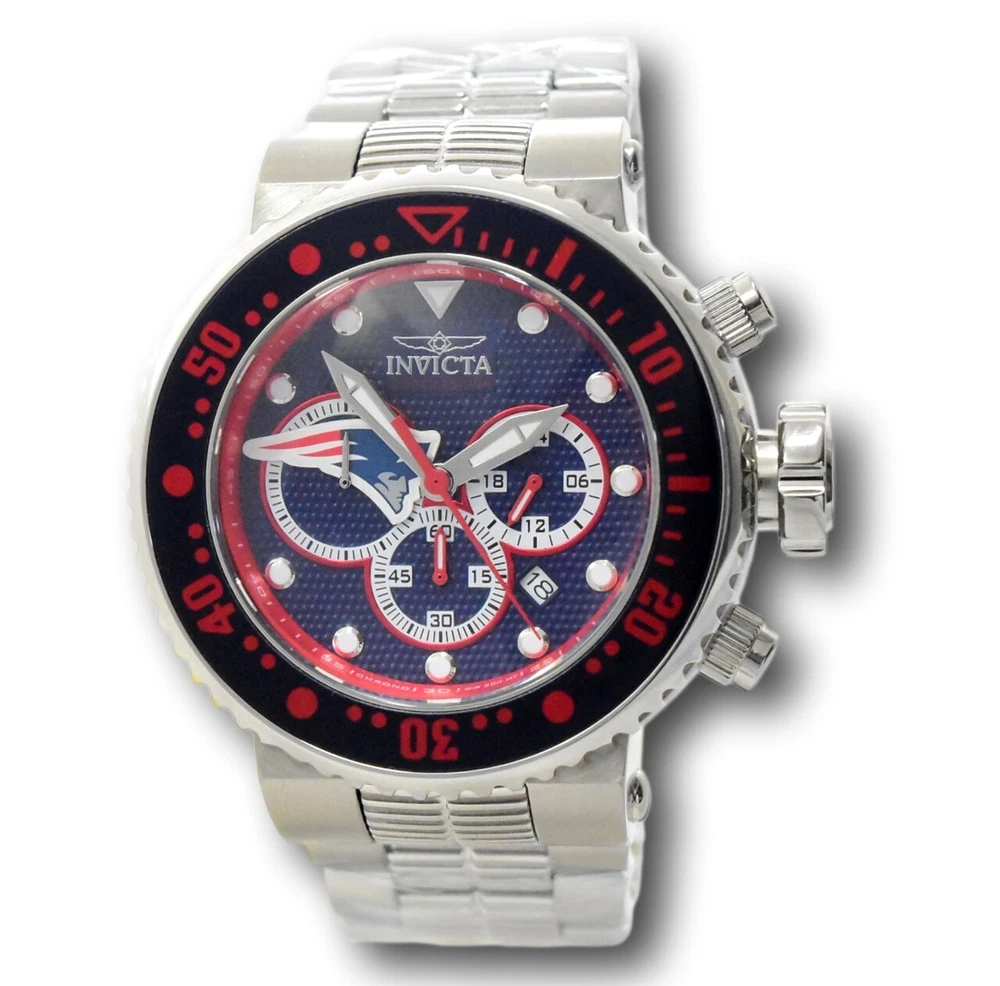 New - With Tags New and Unworn - Guaranteed Authentic - Includes Blue Invicta NFL Box and Warranty Card 100% Functional - This listing includes pictures of the actual watches for sale - This watch has a Thick case - watch is about 20mm thick - please view side pictures of the watch - watch is about 52mm wide or about 56.5 mm wide including the crown - watch weighs about 11.4 ounces Please see watch listing for actual pictures of the watch and colors of the dial - Case size: 52mm wide or about 57 mm wide including the crown Thickness: 20mm Weight: 10.9 ounces Items included: Blue Invicta NFL Box and Warranty Card Max wrist size: 8.0 Inches Case and Dial Case Size: 52mm Case Material: Stainless Steel, Aluminum Bezel Material: Stainless Steel, Aluminum Bezel Color: Steel, Navy Blue, Red Crown Type: Screw Down Crystal Type: Mineral Dial Material: Metal Movement Caliber: VD53 Function Type: Quartz Water Resistance Water Resistance: 200m Band Material: Stainless Steel Tone: Steel Length: 210mm Size: 29.8mm Top Selling Disney Super Hero Star Wars New in Stcok TechnoMarine Contact Us Invicta NFL New England Patriots Grand Diver Men's 52mm Chronograph Watch 33135 New - With Tags New and Unworn - Guaranteed Authentic - Includes Blue Invicta NFL Box and Warranty Card 100% Functional - This listing includes pictures of the actual watches for sale - This watch has a Thick case - watch is about 20mm thick - please view side pictures of the watch - watch is about 52mm wide or about 56.5 mm wide including the crown - watch weighs about 11.4 ounces Please see watch listing for actual pictures of the watch and colors of the dial - Case size: 52mm wide or about 57 mm wide including the crown Thickness: 20mm Weight: 10.9 ounces Items included: Blue Invicta NFL Box and Warranty Card Max wrist size: 8.0 Inches Case and Dial Case Size: 52mm Case Material: Stainless Steel, Aluminum Bezel Material: Stainless Steel, Aluminum Bezel Color: Steel, Navy Blue, Red Crown Type: Screw Down Crystal Type: Mineral Dial Material: Metal Movement Caliber: VD53 Function Type: Quartz Water Resistance Water Resistance: 200m Band Material: Stainless Steel Tone: Steel Length: 210mm Size: 29.8mm This item includes a 100% Money-Back Guarantee! If you're not completely satisfied with your purchase, just send it back in the same condition within 60 days and we will refund the full purchase price of the item. We'll even cover the return shipping! (Only applies to USA orders). Please Note: We do not cover water damage for watches. We do not test or verify manufacturer's water resistance claims. Please use your watch in water at your own risk. To receive free return shipping: Next to this item in your ebay purchase history, click on "Return this item." Please choose "Changed-mind" as the reason for the return. This will allow you to print a pre-paid return shipping label. - Klawk Watches - We have been in business for over 8 years, with more than 25,000 customers from around the world. We specialize in Invicta watches and have many models that can't be found anywhere else. We have some of the lowest prices - and you won't find better customer service. We try to provide the best customer service possible. We hand-inspect each watch and test them to make sure they are completely functional before shipping them out. We also include a no-hassle 60-day warranty on all of our watches (this warranty only covers defects in the watch movement). Our 60-day warranty does not cover any damage from water or moisture. Neither Klawkwatches nor any manufacturer covers water damage under warranty. Use your watch in water at your own risk. We're happy to help! If you have any questions, Please let us know and we will get back to you within 24 hours. Shipping Returns Shipping Shipping Returns Shipping Orders are shipped daily. We generally ship items within 24 hours of receiving payment. We offer standard, Prioirty, and overnight shipping services. You can upgrade your shipping speed at checkout for the difference in shipping costs. Unless a shipping upgrade is purchased, items will generally ship as a First Class Package, the normal arrival time is 3-5 business days starting the day after the item is shipped. We do all of our international shipping through the eBay global shipping program. We ship the item to the eBay global shipping center and they will ship the item to you. eBay determines the international shipping costs and import fees for the item based on the item weight and your location. International shipments can take between 2-4 weeks to arrive depending on your location. Shipping Returns Returns Shipping Returns Returns If you're not completely satisfied with your purchase, you are welcome to return it within 60 days for a full refund. We will generally cover the return shipping costs if you are not satisfied with your purchase. Next to the item in your purchase history, you can click on "More Options" and "Return this item". This will allow you to print a pre-paid return shipping label. For international orders and returns, please contact us to make return arrangements.