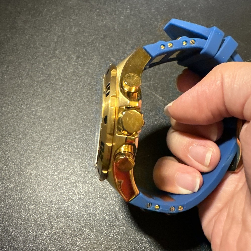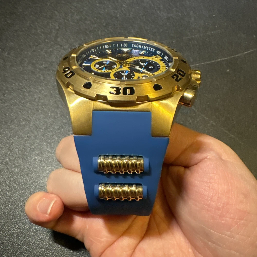 Introducing the Invicta Pro Diver 24681, a stunning men's wristwatch with a 52mm yellow gold-plated stainless steel case and a blue polyurethane band. This watch features a fixed blue bezel, a blue dial with minute, second, hour, date, chronograph, and tachymeter functions, and a solid caseback. With a water resistance of 100 meters/330 feet, this watch is perfect for professional divers and anyone who loves the ocean. The Invicta Pro Diver 24681 is a quartz movement watch that is suitable for left-handed men and has a tang clasp. This watch is an excellent addition to any collection and is sure to impress. Personal used condition in collection. Not currently running. NEEDS NEW BATTERIES! Bought couple years back and it's been in storage. No box. Just the watch itself with the band. Very good pristine condition. Currently sold out at retail value on official site: $199.00 very rare to find. offers welcome.
