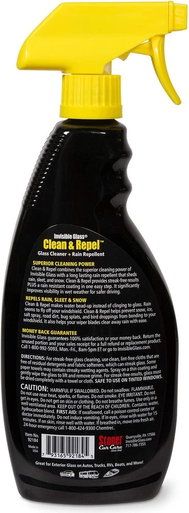 Store New Arrivals Add to Favorite View Feedback Contact Invisible Glass 92184 Premium Glass Cleaner with Rain Repellent for Exterior Automotive Glass and Windshields to Shield against Rain, Snow, and Sleet, 22 Fl Oz, Pack of 1 Description Item model number 92184 Product Dimensions 9.83 x 3.43 x 0.72 inches; 1.38 Pounds Country of Origin USA Department unisex-adult Manufacturer Invisible Glass Is Discontinued By Manufacturer No Size Pack of 1 RAIN, SLEET, SNOW: The elements are no match for the tough, dependable performance of the Invisible Glass Clean & Repel rain shield spray glass cleaner. It repels rain, sleet, and frost with ease while providing a streak-free shine. IMPROVE RESPONSE TIME: Driver reaction time improves by 25% in wet weather when Invisible Glass rain repellent and glass cleaner combines for an impressive shine and increased visibility. EASY DEBRIS REMOVAL: Cleans and repels in one easy step. Get rid of tough road grime while preventing rain, ice, and frost build up. Watch as the water just beads off your windshield and glass! MONEY-BACK GUARANTEE: Love it or it’s free, guaranteed! Enjoy greater visibility while repelling the elements on a wet and rainy day. We stand behind our product and are confident you’ll love it! PROUDLY MADE IN THE USA: Invisible Glass is formulated, manufactured, and distributed in the USA. We use superior ingredients to deliver unmatched performance and reliability you can trust. We're committed to your satisfaction—If anything doesn't meet your expectations, contact us, and we'll make it right! Why buy just a glass cleaner when you can enjoy the 2-in-1 power and superior performance of Invisible Glass Clean & Repel Rain Shield Repellent Spray? This unique formula is made in the USA and designed to easily repel frost, rain, and sleet, improving driver visibility by up to 25% during wet road conditions. Don’t put your car or yourself at risk. Get the glass cleaner that works as hard as you do. And it’s so much more than just a rain repellent! This powerful cleaner helps to remove debris while leaving a streak-free shine that’s both brilliant and free of harsh detergents, dyes, and ammonia, so it’s safe to use, even on tinted windows. Take care of your car so that it can take care of you. Order today risk-free thanks to our money-back guarantee! ABOUT US We offer the best prices around on high quality products. Our E-store includes media such as books, movies, music and games while offering electronics, toys, sporting apparel, clothing, tools, general home, garden items and more. SHIPPING We are always working hard to ensure your package arrives as soon as possible. Please understand that some factors like weather, high postal traffic, and the performance of shipping companies are outside of our control. We offer free shipping to the lower 48 states and ship within 2 business days of payment, usually sooner. We do not accept P.O. Boxes. Please provide a physical address. RETURNS We offer a 30-Day Return Policy on items which you are not completely satisfied with. You have the option for a full-refund or an exchange of the item. No returns are available on items shipped outside of the USA. PAYMENT We accept PayPal. CONTACT US This page content is yet to come Please ad us to your favorite seller and visit again later Thank You CUSTOMER SATISFACTION We try our very best to make sure every customer is completely satisfied. If there's a problem, message us! We're happy to help.