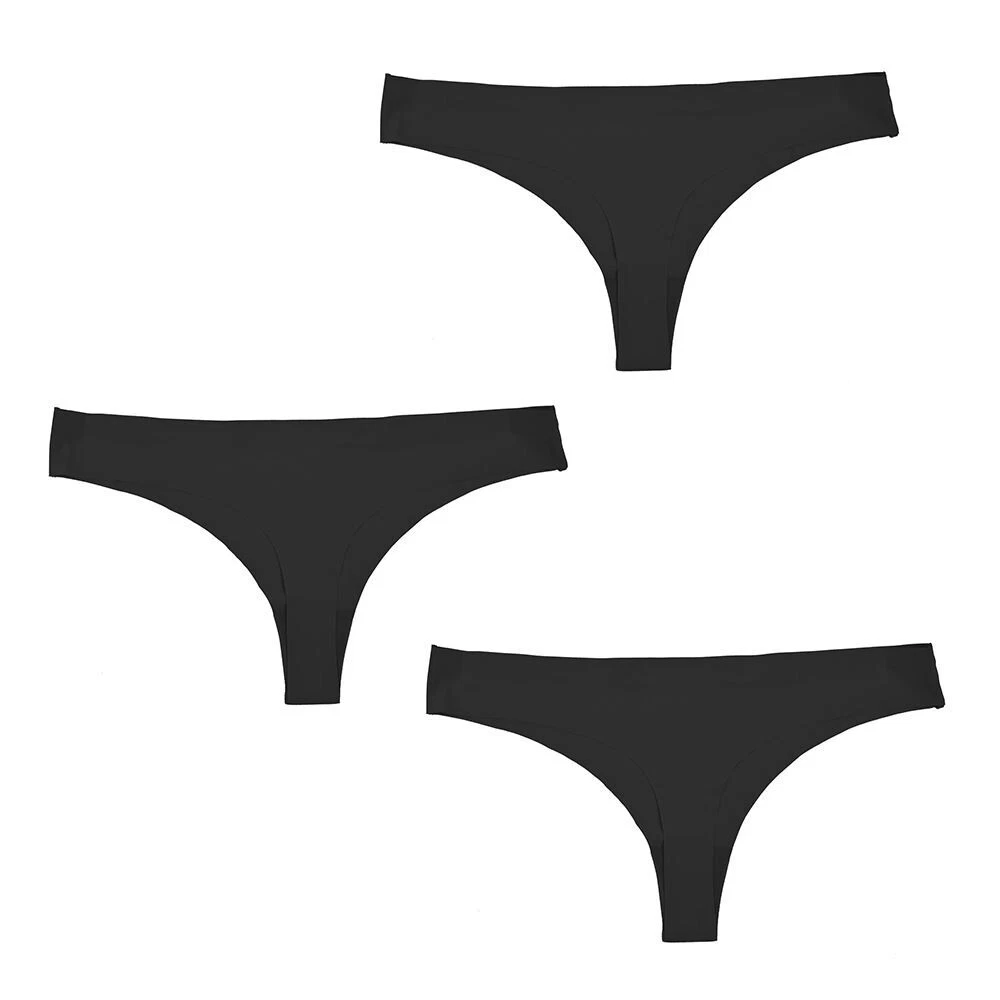 Ladies 3pk Black No VLP Thongs No Visible Panty Line Colour: Black Size: Assorted - 10, 12, 14, 16, 18 Material- 90% Polyamide, 10% Elastane Gusset: 100% Cotton