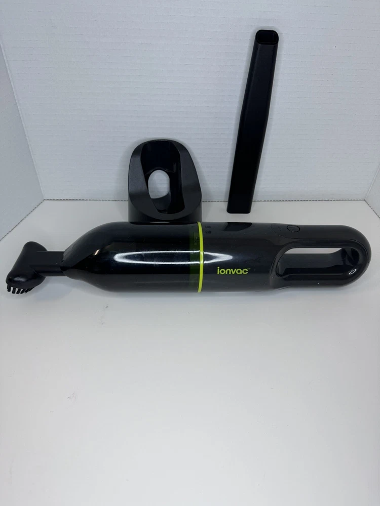 The IonVac PowerMax Cordless Handheld Vacuum Cleaner is a portable, compact vacuum with a runtime of 30 minutes and a 3-hour charge time. It comes in black and features a HEPA filter, bagless design, and cordless operation. Included accessories are a filter, flat brush, storage tray, extension wand, and USB charging cable. It is ideal for quick cleaning tasks around the home.