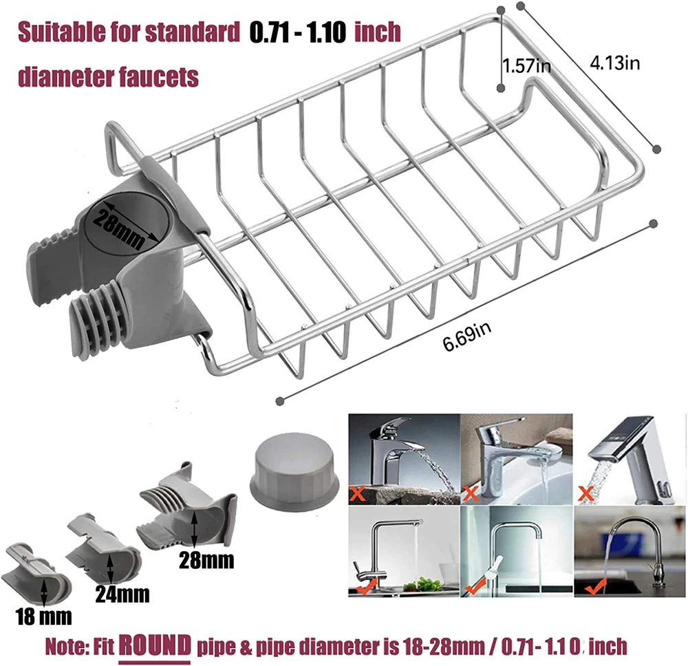 Premium Stainless Steel Materials: NO TOOLS, NO DRILLING, NO HOLES. Just clip on the tap. This prevents any damage to your permanent structure, rust-proof and durable, scratch-resistant and resistant to deformation. Ideal for using it in kitchen, bathrooms and anywhere you need. 2-in-1 DESIGN HOLD MORE: Detachable holder, hook design, remove it easy without leaving marks or sticky residue, and will keep your utensils away from dirty water in the pool. It can holds sponge, scrubber, scouring pad and more! Great for kitchen, workplace, bathroom. CLAMP DESIGN : Clip on the tap, easy to use. Suitable for faucet pipe with thickness between 18mm and 28mm. ★★★★★ NOTE: This kitchen sponge holder ONLY fit for round faucets with a diameter of 0.71-1.10 inches, not fit for other size round faucets or square faucets. The mat accessories can adjusting the tightness. DIVIDER FOR SMARTER SPACE ARRANGEMENT: If you are looking for kitchen sponge storage, then why not try this? This kitchen sink rack can be used the internal space with different sizes sponge, making it perfect for fitting your item no matter how big or small. Perfect Storage Accessory for bathroom & kitchen. Installed on the kitchen sink or bathroom faucet,space-saving. No drill, nail, suction, screws or glue needed, allow to remove easily without leaving marks or sticky residue.
