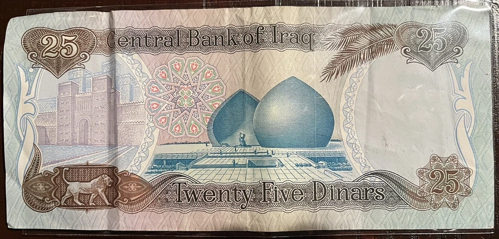 This Iraqi 25 dinar note is a highly sought-after item from the Saddam Hussein Era. The note is in excellent circulated condition. The design depicts a profile portrait of Saddam Hussein, along with other notable landmarks and symbols of Iraq. With its unique historical significance and condition, this 25 dinar note is a must-have for any serious collector of world paper money. Add it to your collection today and own a piece of history.