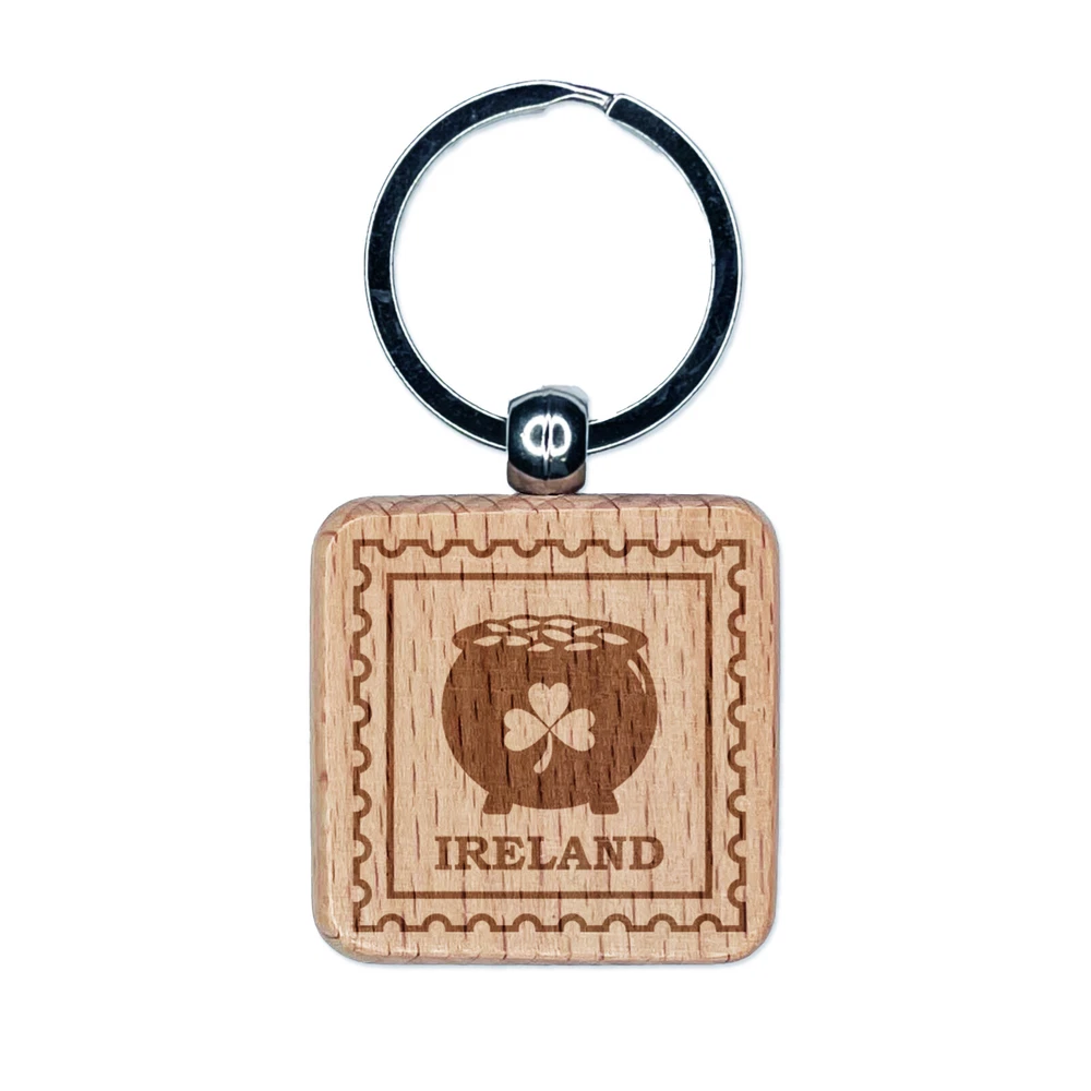 Ireland Travel Pot of Gold Shamrock Leprechaun Engraved Wood Square Keychain