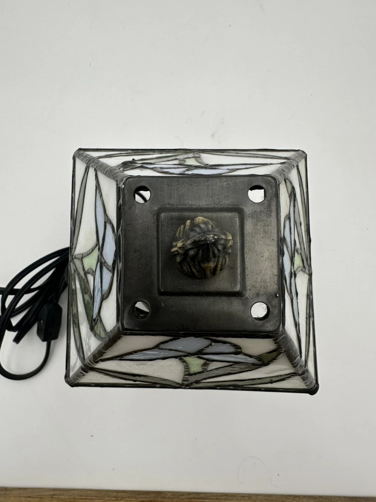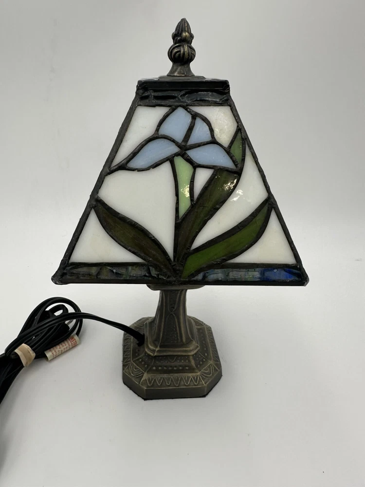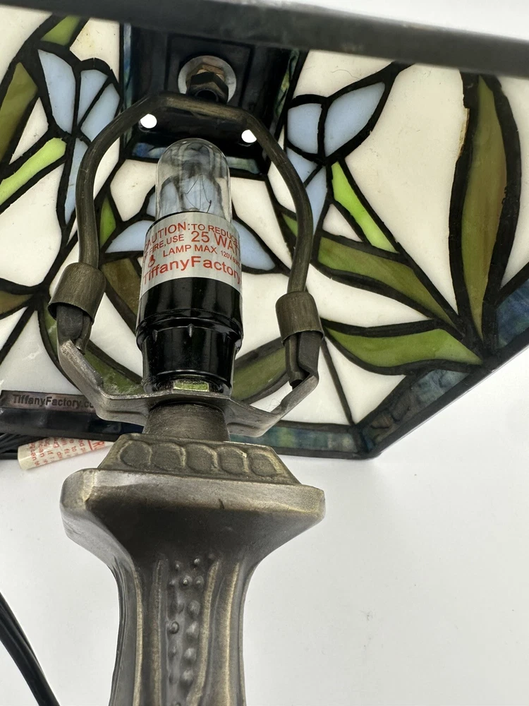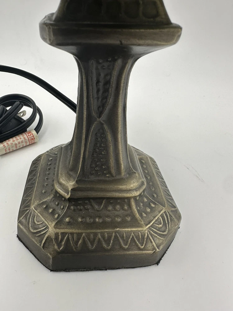 Made by Tiffanyfactory.com Excellent condition Features: Base Finish: Antique Brass Material: Metal Socket: ONOFF Number of Bulbs: 1 Wattage: 25W Switch: Inline Specifications: Overall Product Dimension: 11"H x 6"W x 6"D Product Weight: 2 lbs