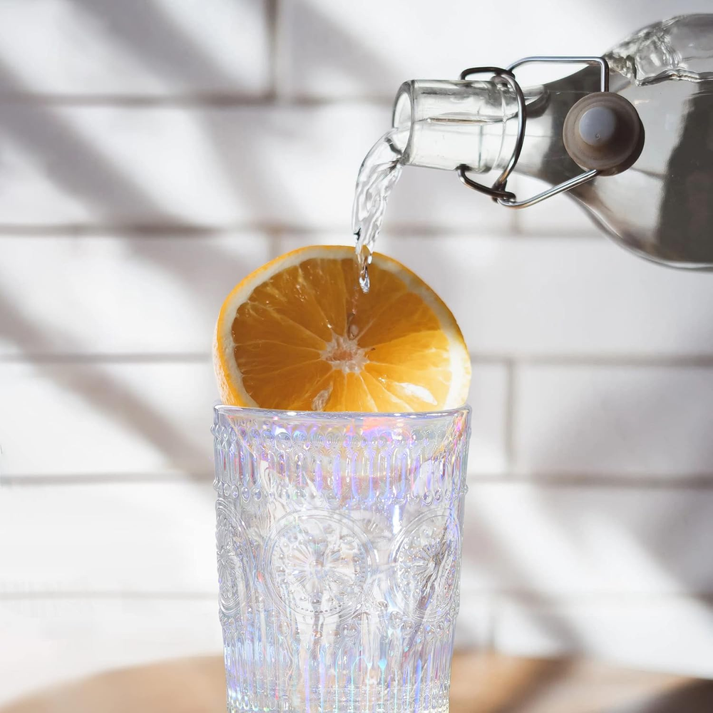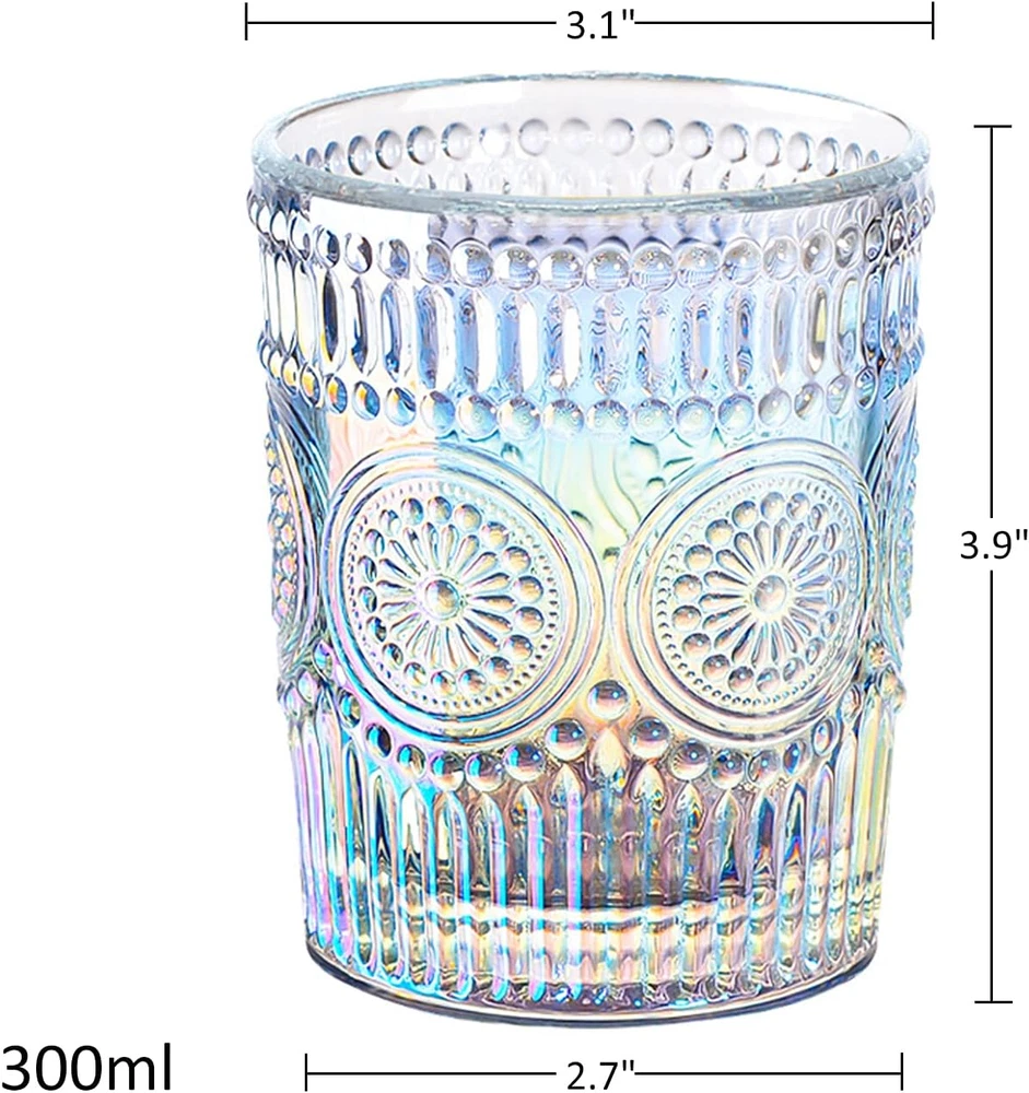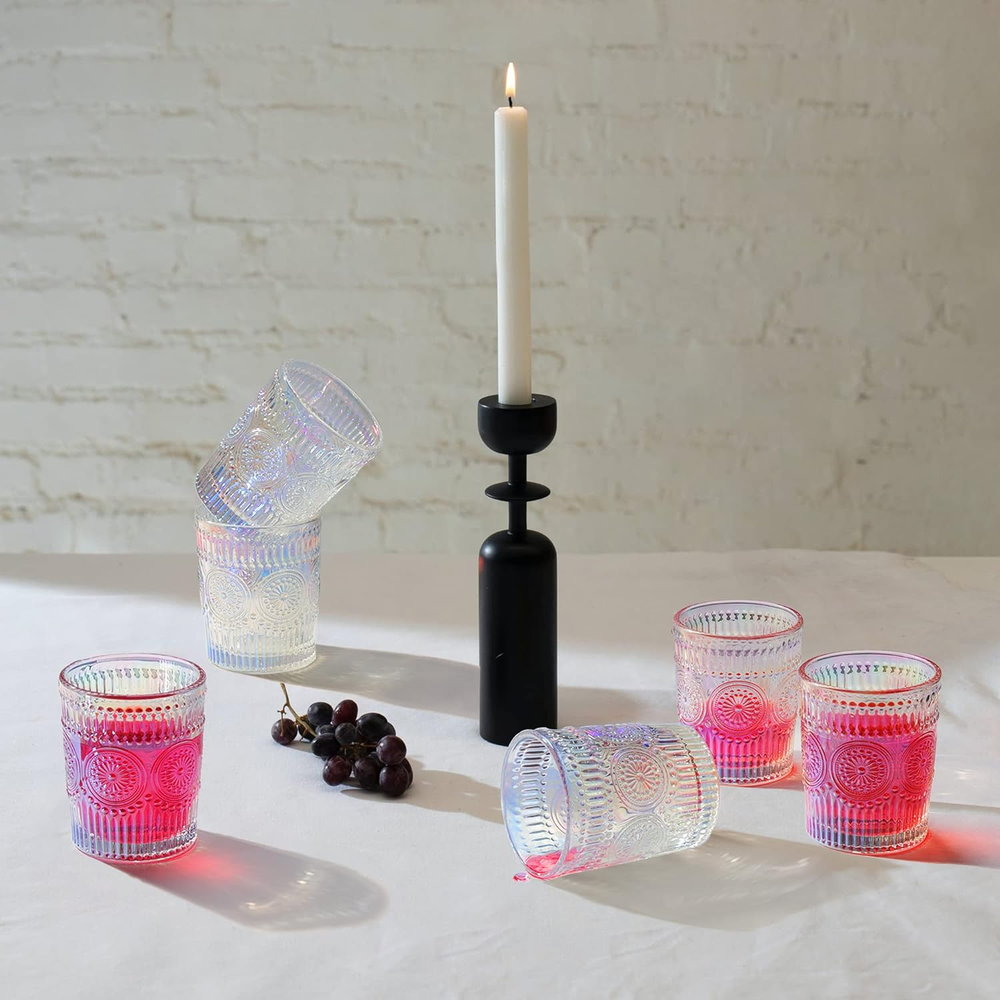 Absolutely love these glasses! The rainbow shimmer catches the light beautifully and the embossed details feel so elegant. Perfect for making everyday drinks feel special.