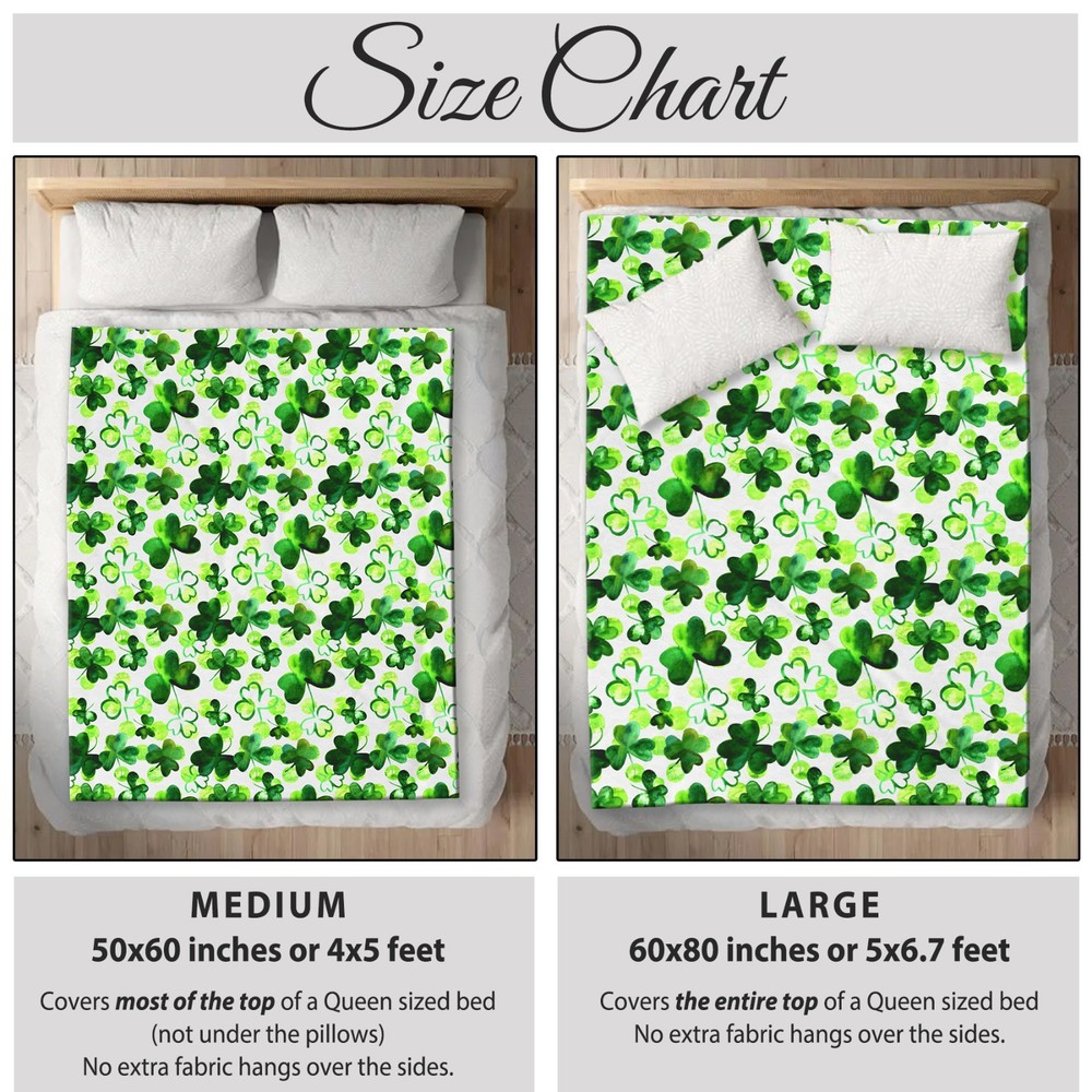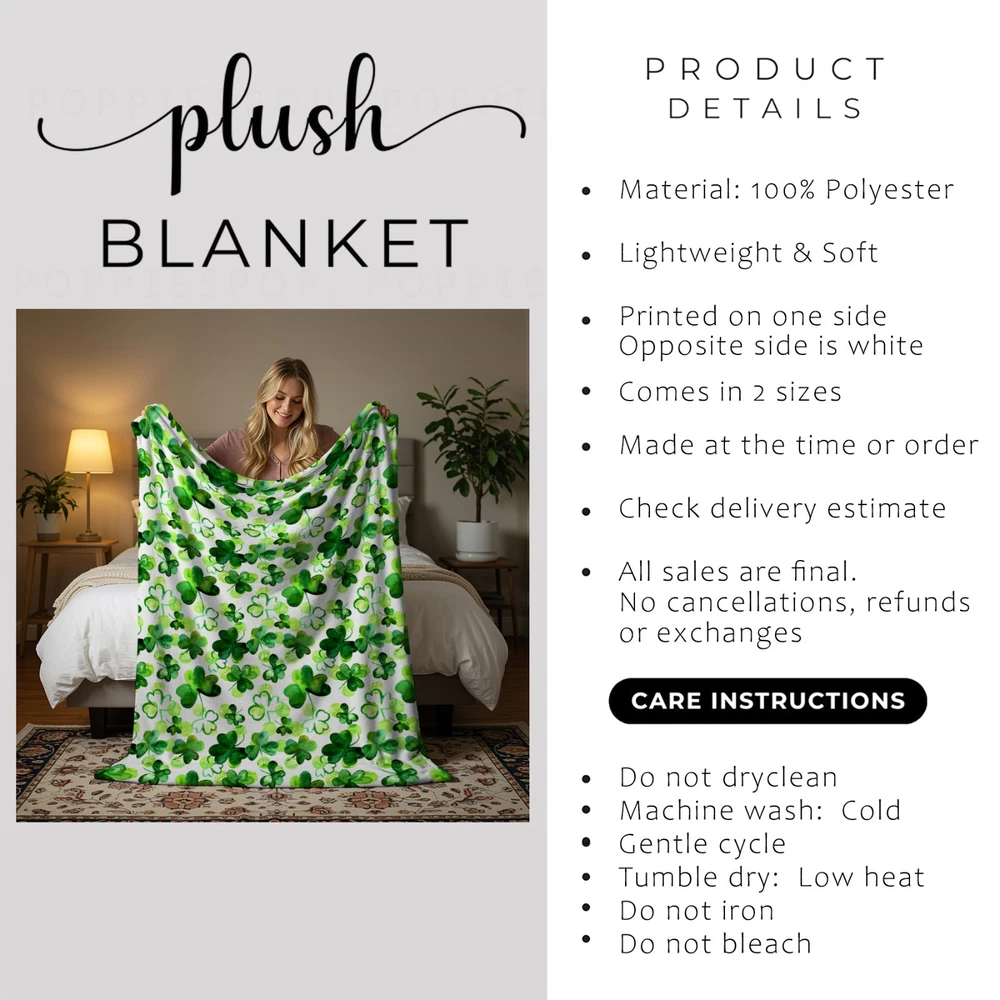 This velveteen throw blanket features a lively Irish-themed design filled with classic green shamrocks arranged in a repeating pattern. Crisp contrast and festive color create a cheerful nod to Irish heritage and St. Patrick’s Day tradition. Soft and cozy, this blanket is perfect for seasonal decorating, everyday lounging, or celebrating Irish pride year-round in living rooms, bedrooms, dorms, or rec spaces. Keywords: Irish shamrock blanket, St Patrick’s Day throw, Irish decor blanket, shamrock pattern throw, green Irish blanket, Celtic themed blanket, Irish gift blanket PRODUCT DESCRIPTION: • Available in 2 Sizes: MEDIUM: 50 inches by 60 inches (50"x60") LARGE: 60 inches by 80 inches (60"x80") • 100% polyester • Lightweight, soft & cozy • Soft silk touch fabric • The blank white fabric is sourced from China • The design/pattern is custom printed in the USA • Printing on one side / White on the reverse side • Machine-washable • Hypoallergenic • Flame retardant 📦 WHEN WILL I GET MY ORDER? ● Please check the delivery estimate shown on each listing ● Every item is made to order — crafted just for you after purchase ● I do not sell any in-stock or “ready to ship” products ● I cannot rush production or guarantee delivery by a specific date ● Please review the estimated delivery window and order early if needed 🎨 COLORS / SIZING / CUSTOMIZATION ● Actual colors may vary slightly due to monitor display differences ● I make every effort to represent colors as accurately as possible ● A size chart is included in each listing (when applicable) ● If you’re between sizes, follow the guidance on the chart ● Sizes and styles are standardized — no customization to cut, style, or length ✈️ SHIPPING / CUSTOMS / IMPORT TAXES ● Double-check your shipping address before submitting your order ● If your address is incorrect, buyer is responsible for reshipment costs ● Buyer is also responsible for any Customs Charges or Import Taxes required by their country 🚫 CANCELLATIONS / RETURNS / EXCHANGES / DAMAGED ITEMS ● Orders can be canceled within 1 hour of purchase only ● Once production begins, orders cannot be canceled ● All sales are final — I do not accept returns or exchanges ● Each item is custom made; I cannot absorb returns like large retailers ● If your order arrives damaged, defective, or incorrect, contact me right away — I’ll make it right 💖 THANK YOU! ● Your purchase supports a small artisan business ● I truly appreciate every order and every customer!