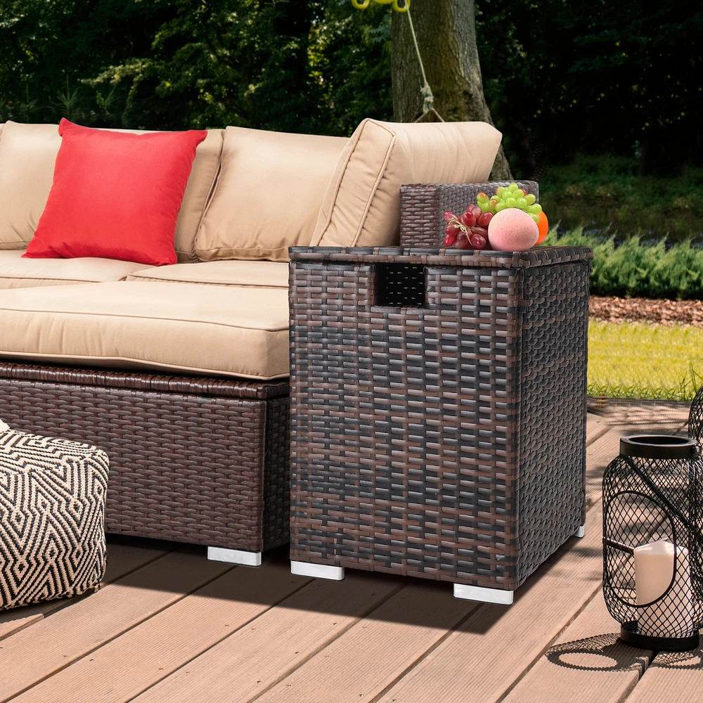 Introductions: Looking for a fashionable side table for daily use? Here I'd like to recommend this40*40*57cm Iron Frame Gas Bottle Storage Rattan Side Table Brown Gradient to you. It is made of high quality material, durable and non-toxic for you daily use. This table with simple design and classical color can be compatible with different room styles. you can place it in your bedroom, living room, guest room, office, bathroom or any other places you want. It is delicate design with beautiful appearance, and gives color to your life. Actually, it is a good decoration to embellish your home. What are you still hesitating about? Order now! Features: 1. Easy to clean 2. Can be used as a side table or to store and display all kinds of stuff in your living space 3. Blend well with modern style decors 4. Perfect size, single layer design ,easy to remove 5. Easy to assemble Specifications: 1. Material: PE Rattan Iron 2. Color: Brown Gradient Rattan 3. Specifications: Overall Size: 40*40*57cm Storage Size: 36*36*47cm Dig Hand Size: 8.5*7.5cm Bottom Iron Frame Size: 32.5*34.5cm Diameter Of The Inner Of The Bottom Hoop: 26cm Foot Pad Size: 10*2.5cm Product Volume: 61L/16 Gallons 4. Load Capacity: 50kg/111lbs 5. Weight: 7kg Package Includes: 1 x Brown Gradient Packable Side Table 1 x Hardware Assembly Accessories 1 x English Instruction Manual